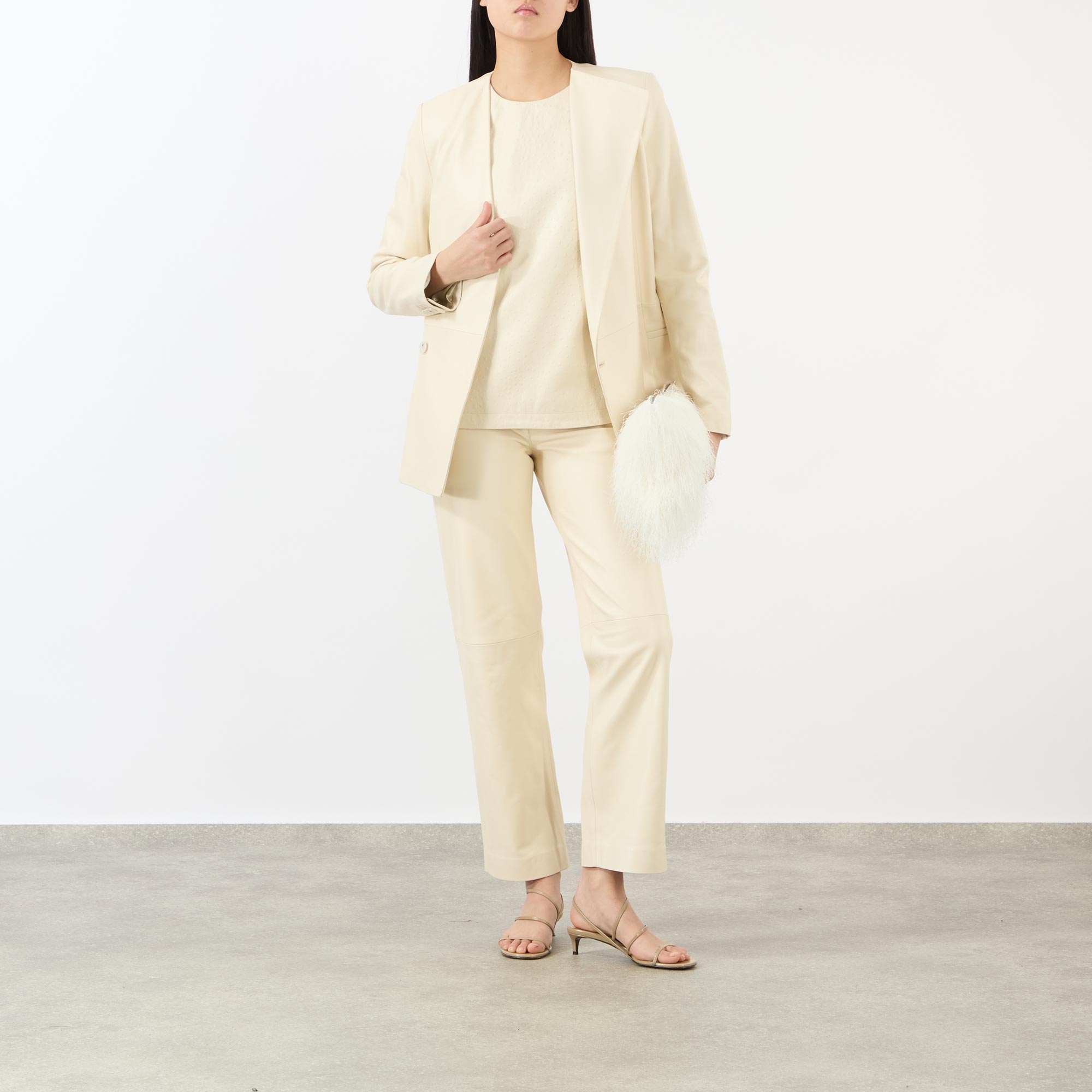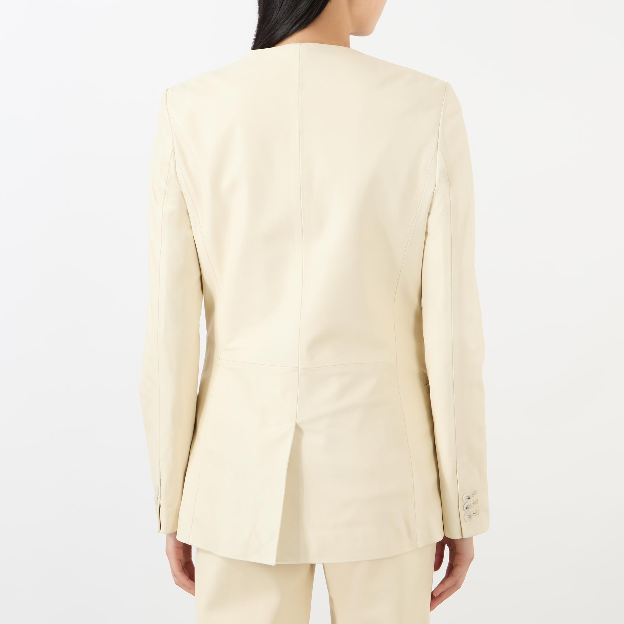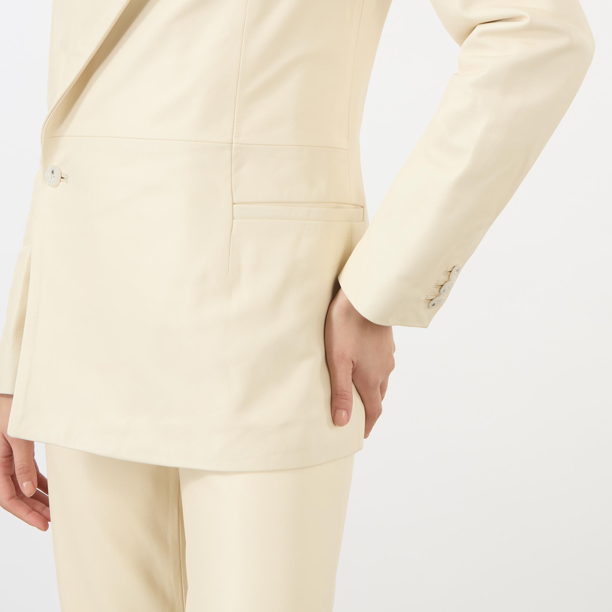 - Asymmetric lapels, single-button fastening, two welt pockets, vent to the back, buttoned cuffs, plongé leather