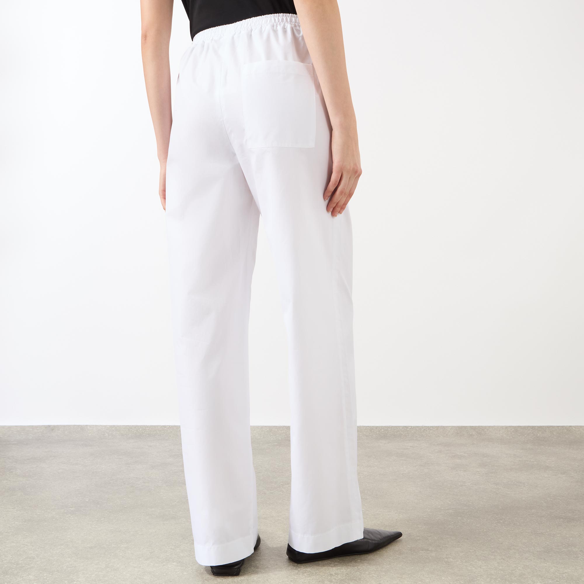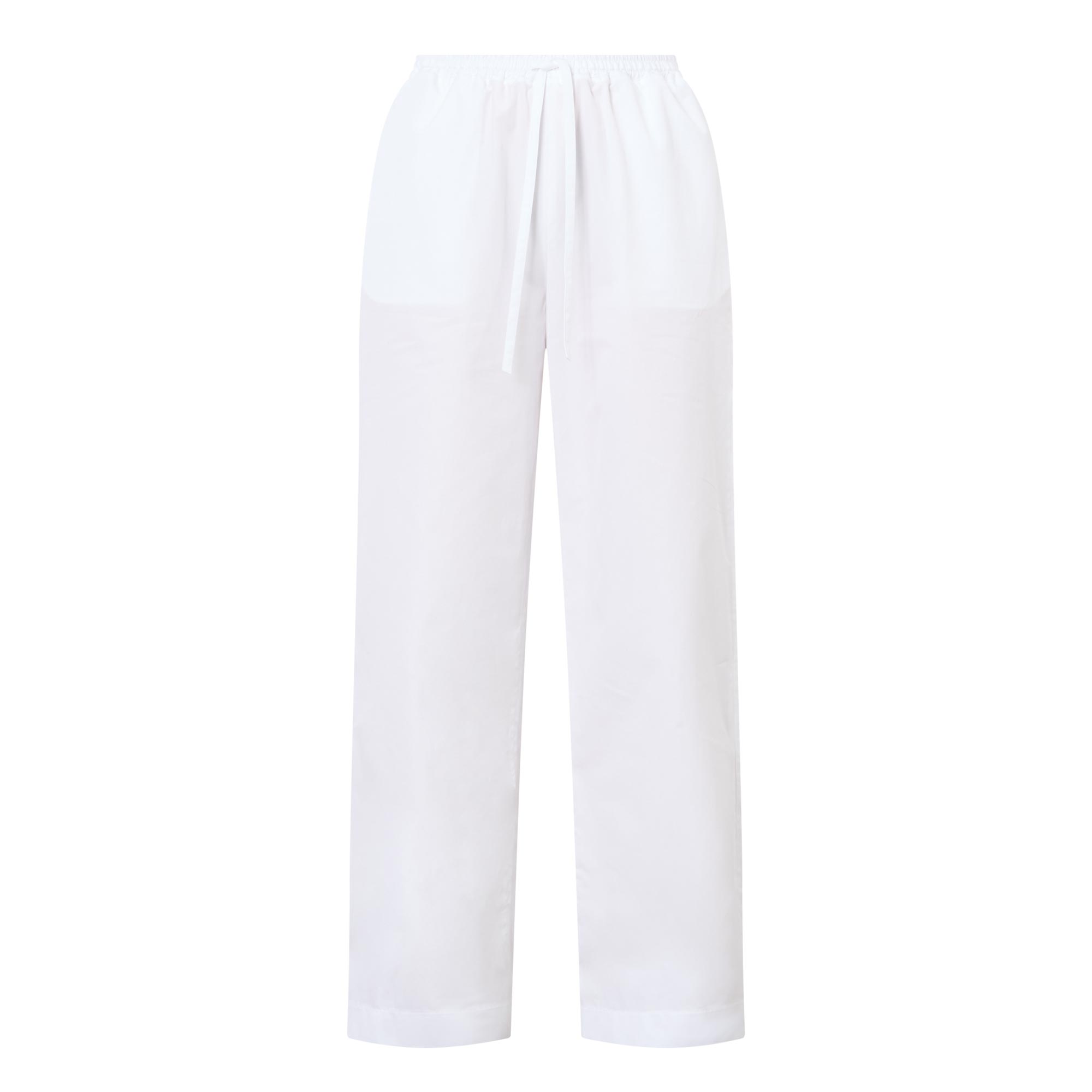 - Elasticated waistband with drawstring adjustable fit, side entry pockets, straight-cut leg, crisp poplin fabric