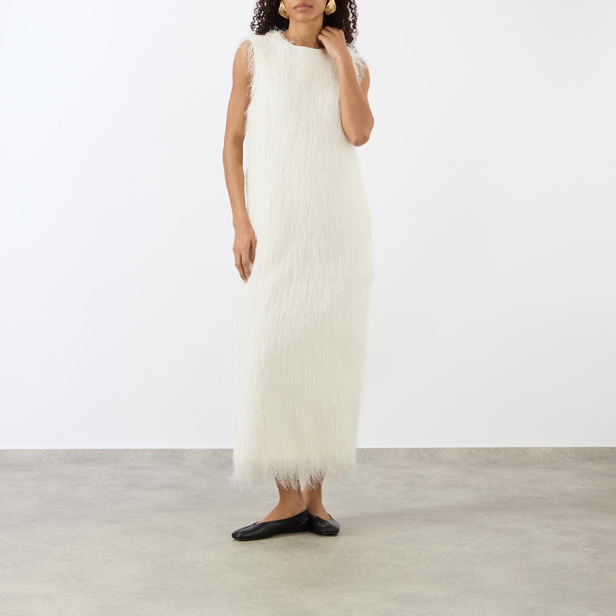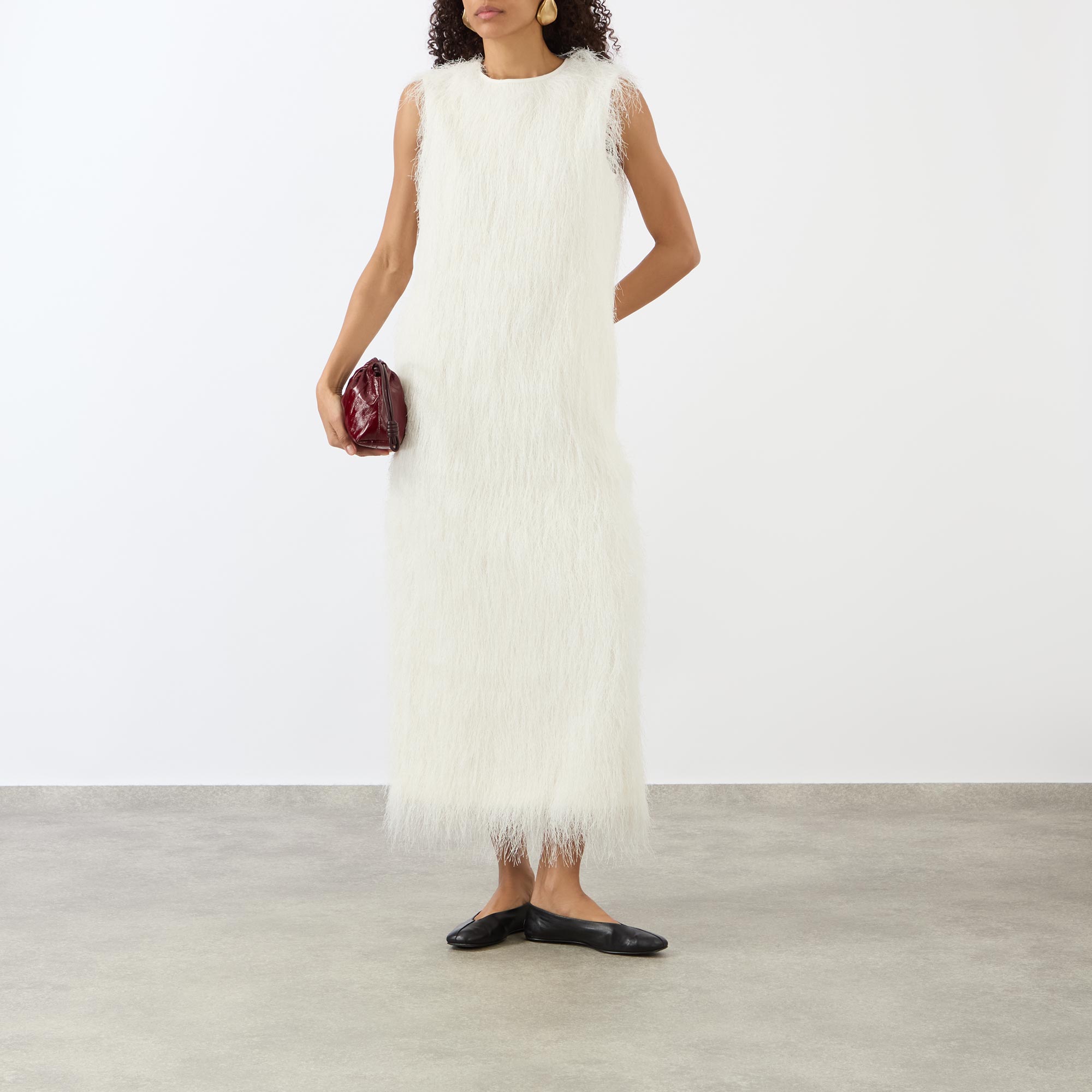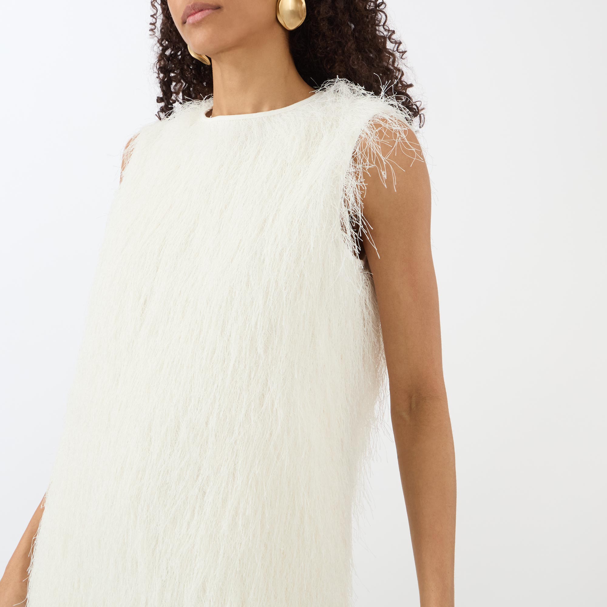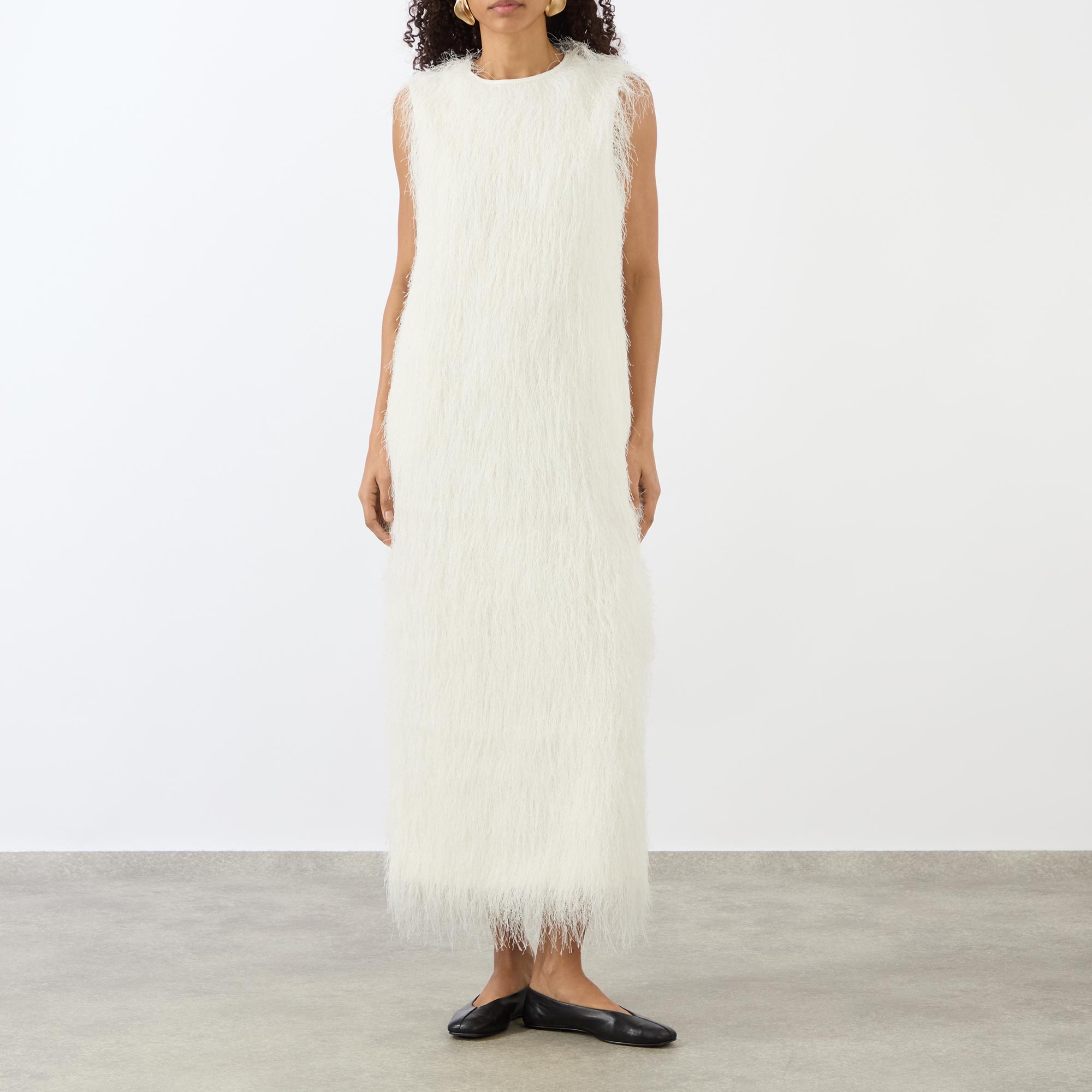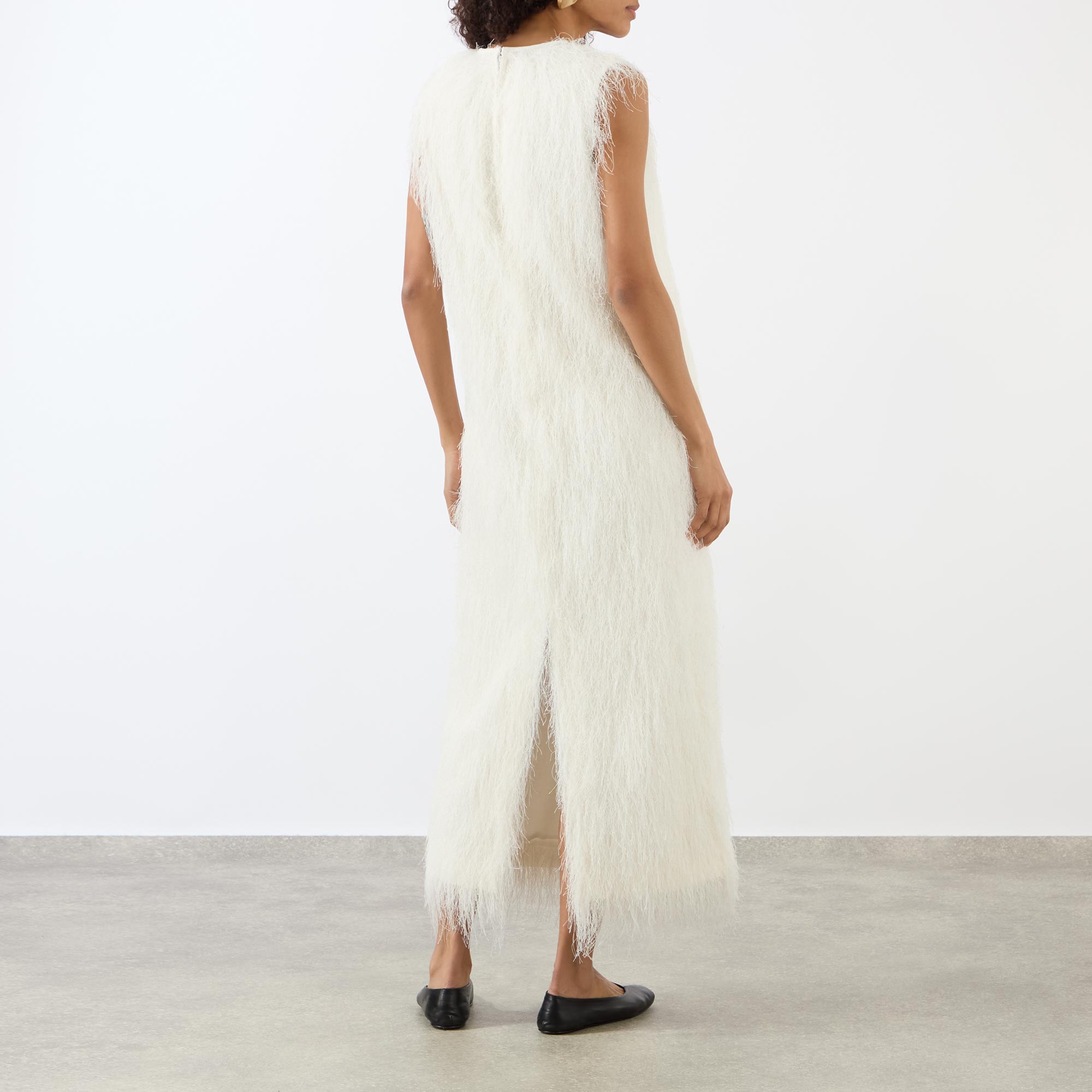 - Round neckline, sleeveless, maxi length, column silhouette, vent to the back, side entry pockets, fringed fabric, concealed zip fastening