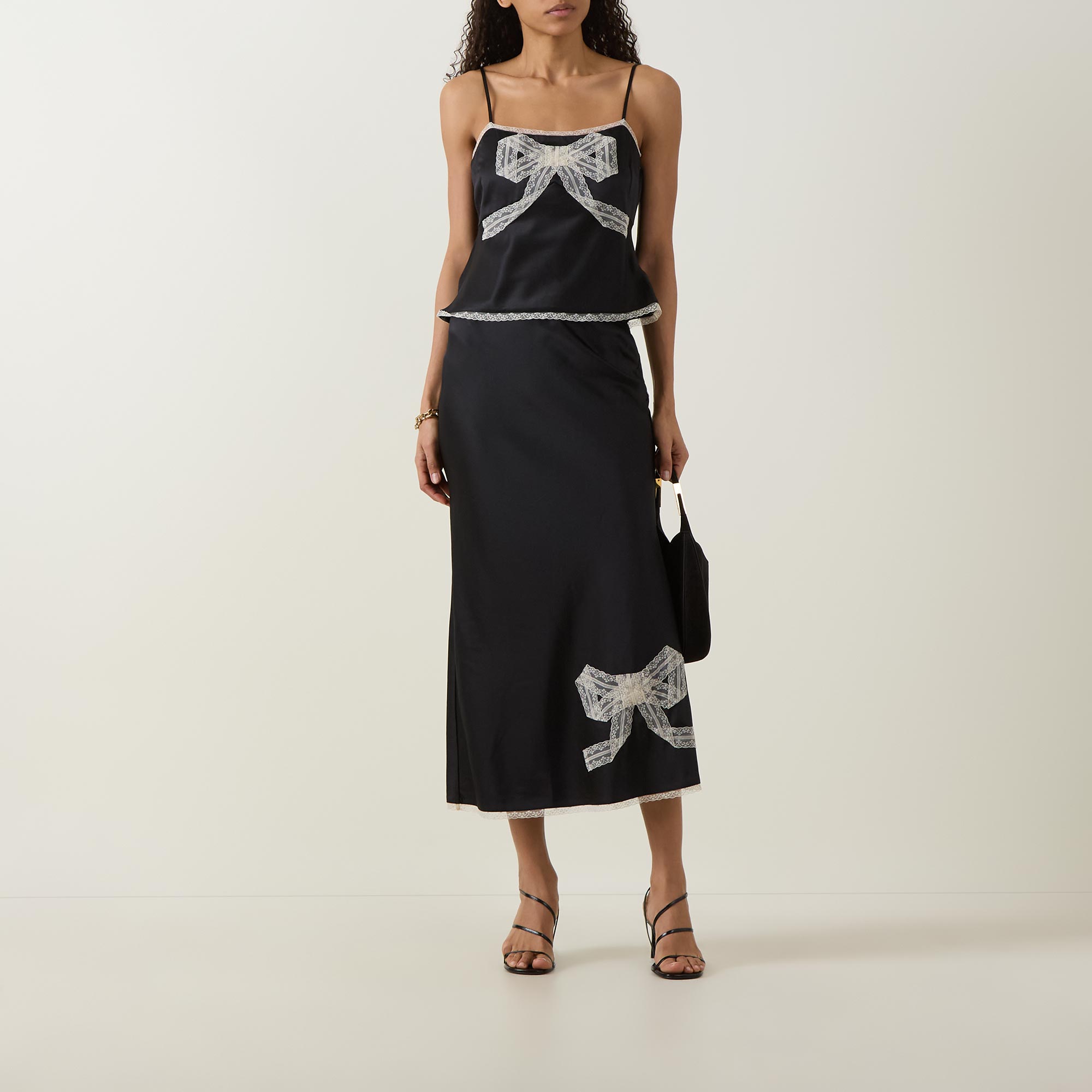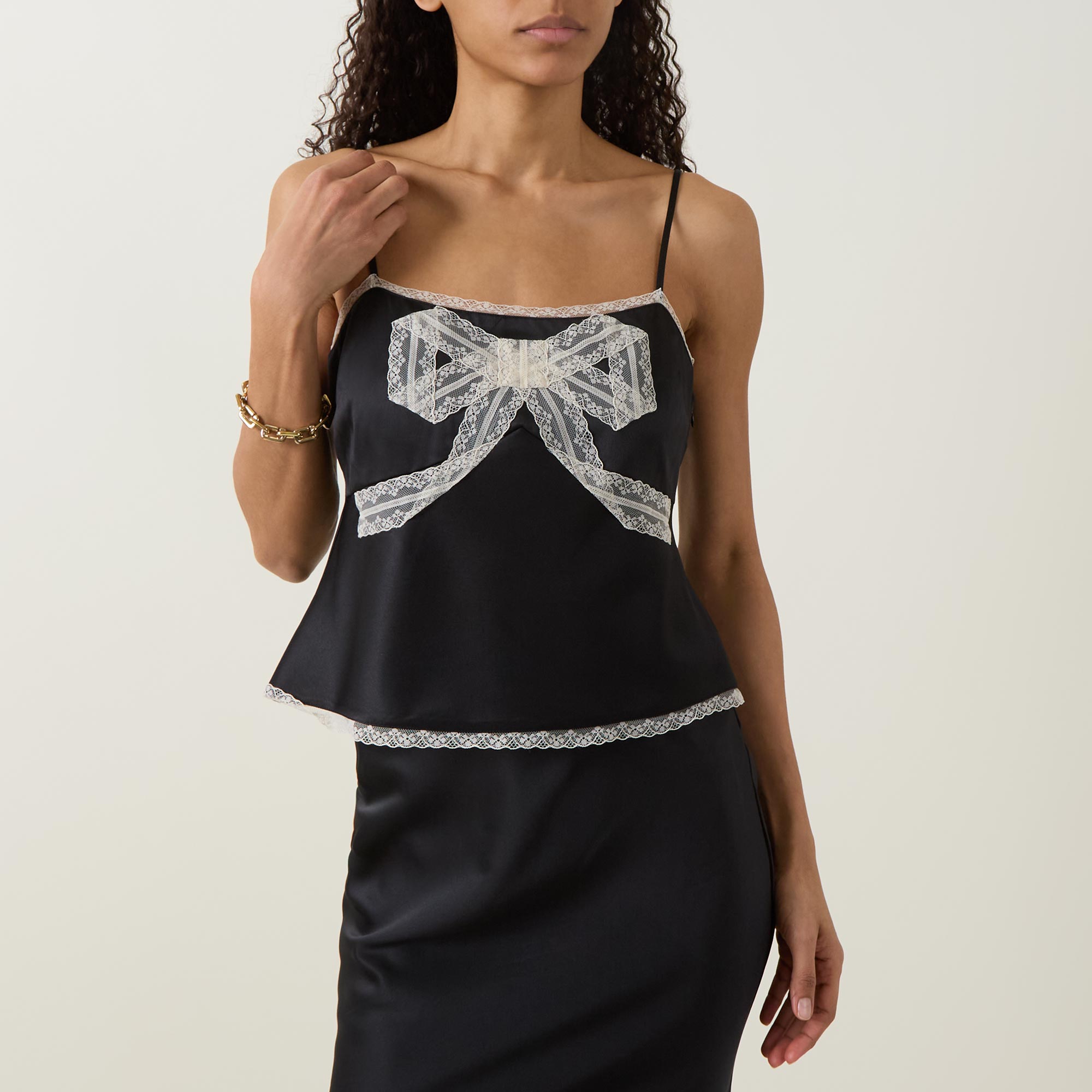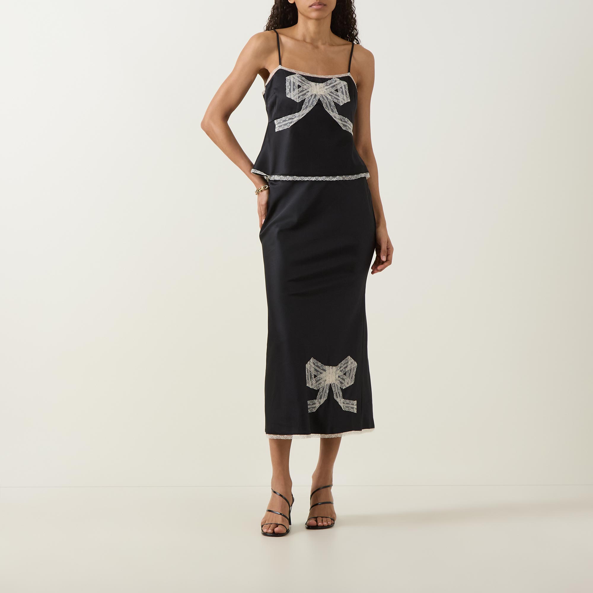 • Sleeveless, thin adjustable spaghetti straps, square neckline, front bow detail, delicate lace trim embellishment, smooth finish