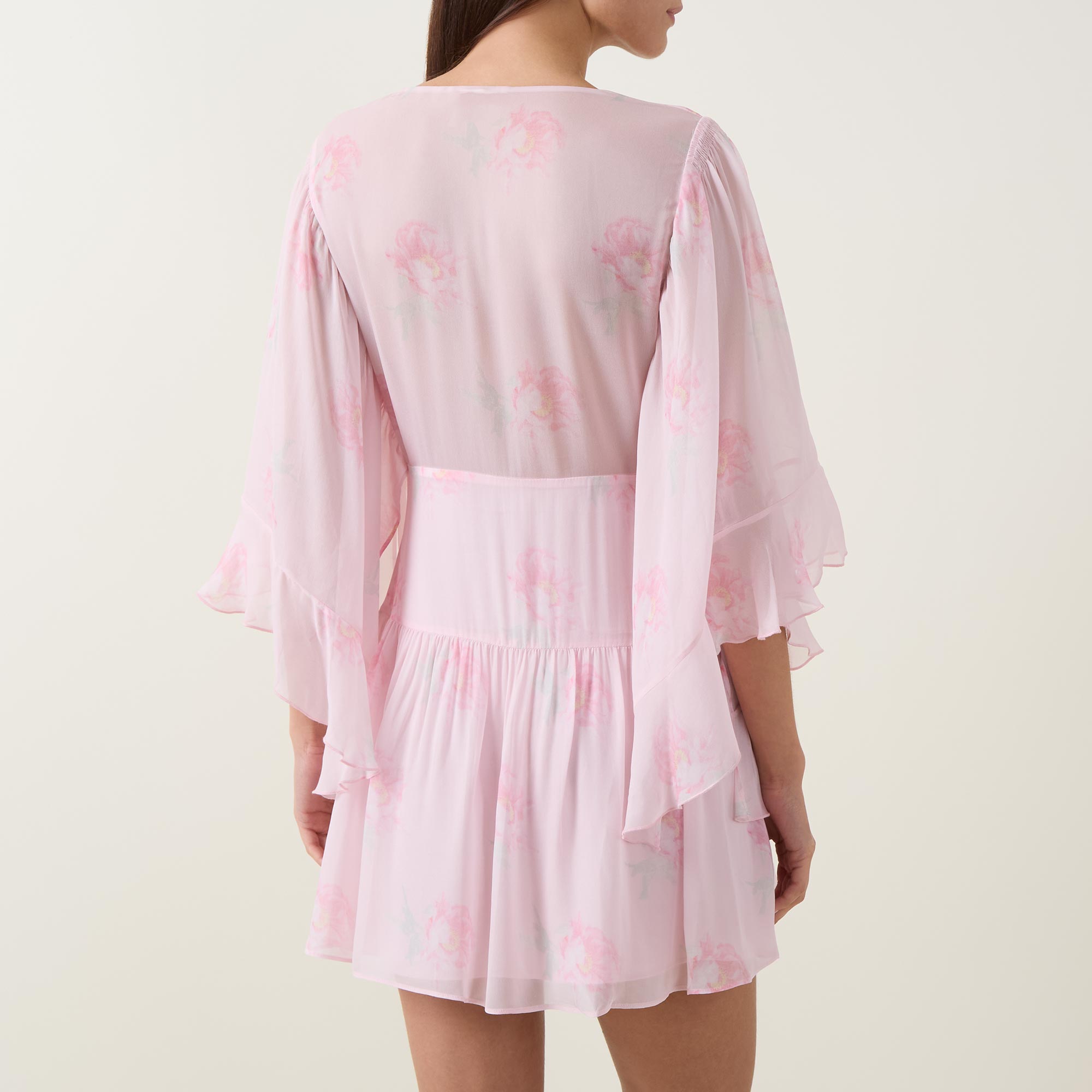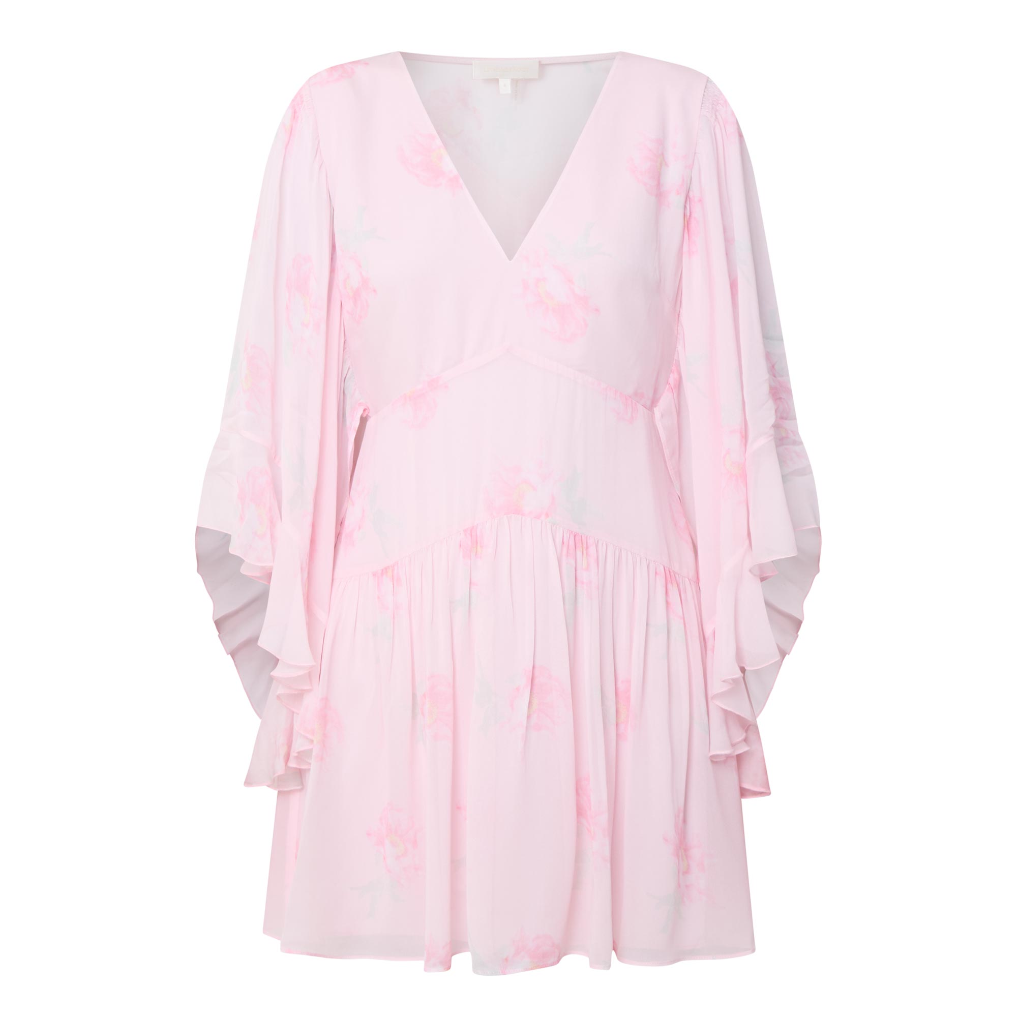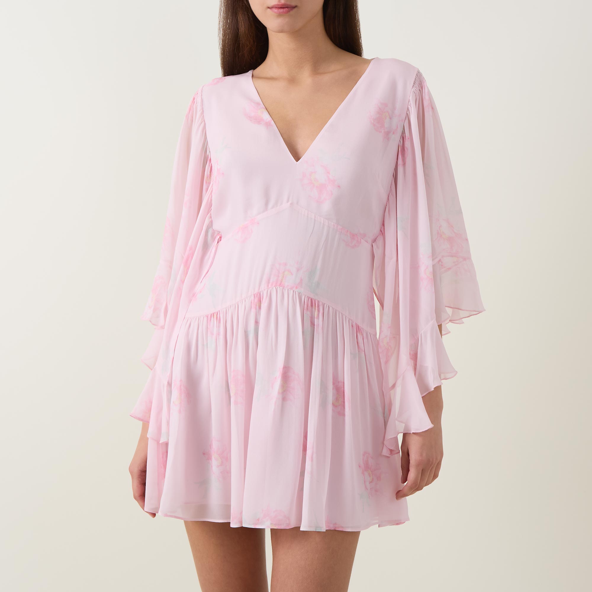 • V-neckline, three-quarter length flutter sleeves, fitted under bust, flared skirt, semi-sheer overlay, floral print, mini length