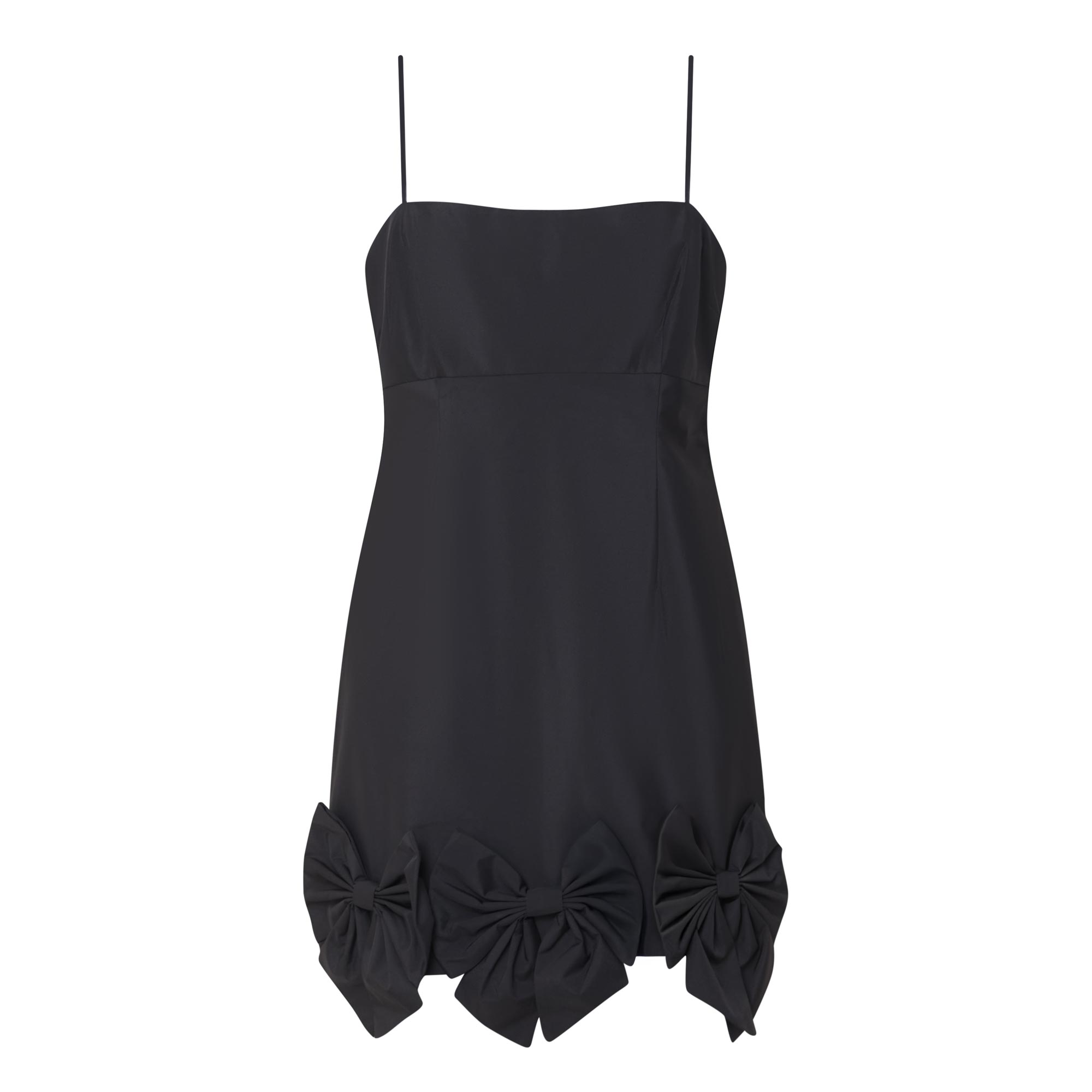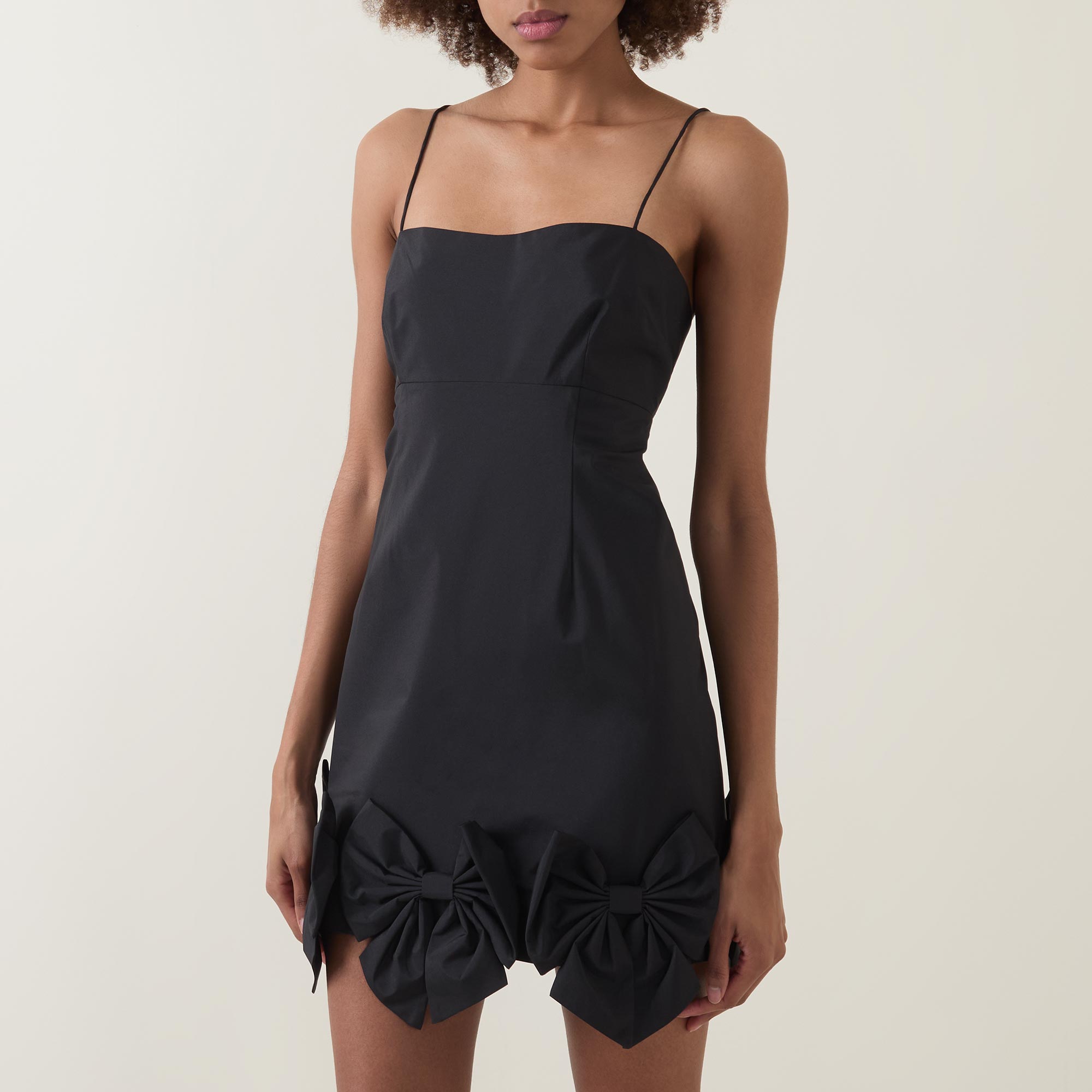 - Straight neckline, narrow adjustable straps, concealed side zip fastening, princess seams, empire waist, straight hem, bow appliqué detailing, mini length