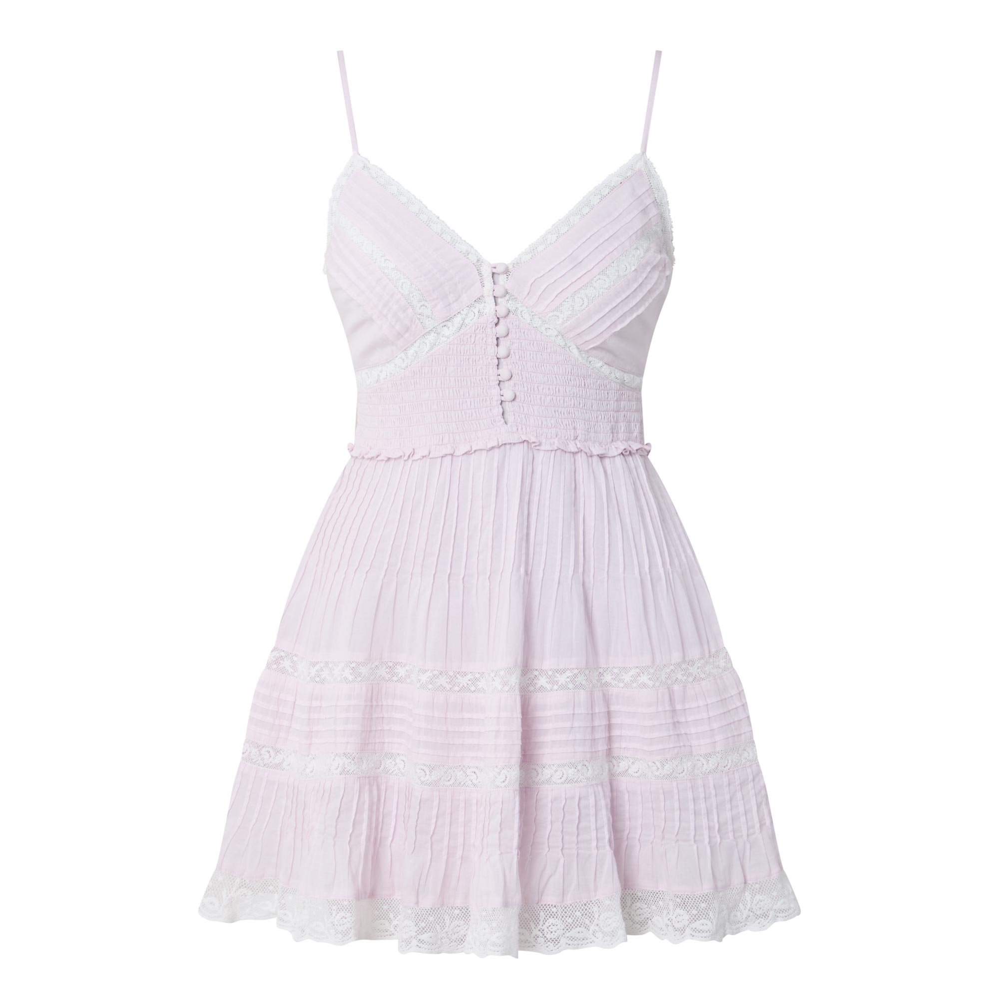 • V-neckline, adjustable spaghetti straps, shirred waist and back panel, tiered skirt, sheer lace panels, pin pleat details