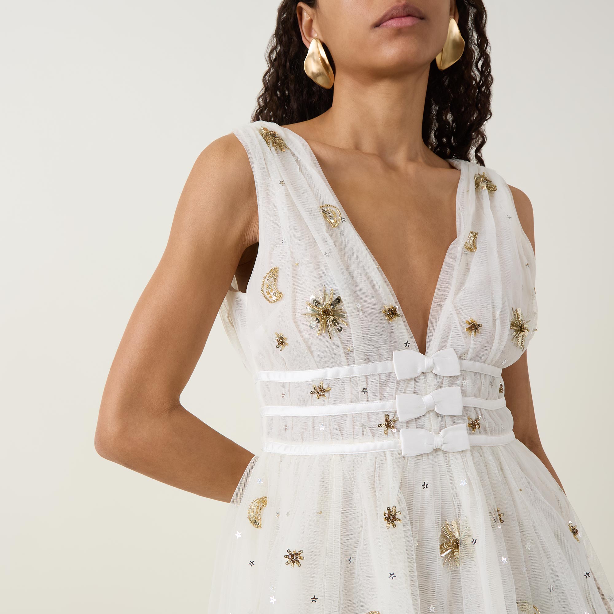 - Sleeveless, wide comfortable straps, plunging V-neckline, three bow details, celestial star and moon sequin embellishment, mini length, tulle finish
