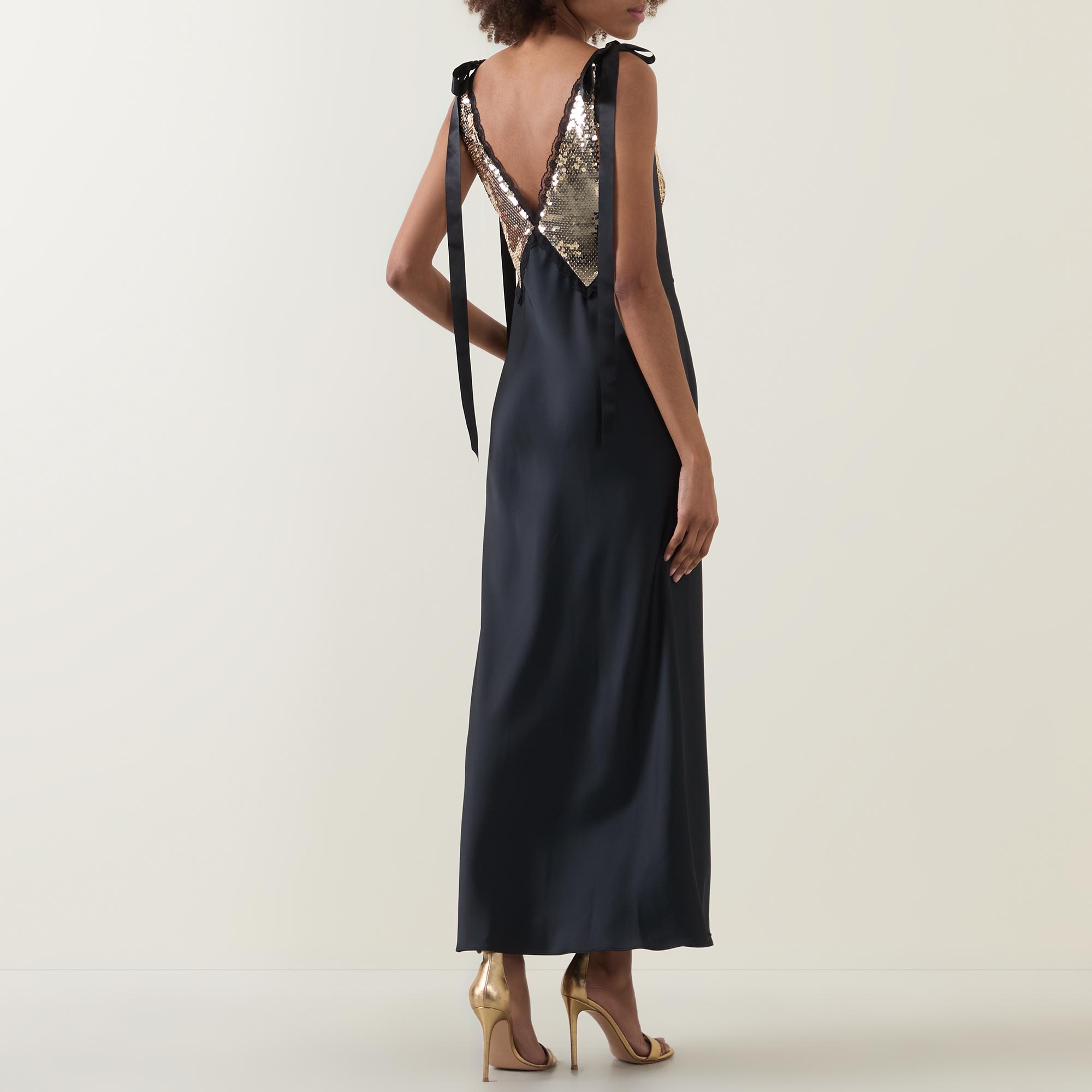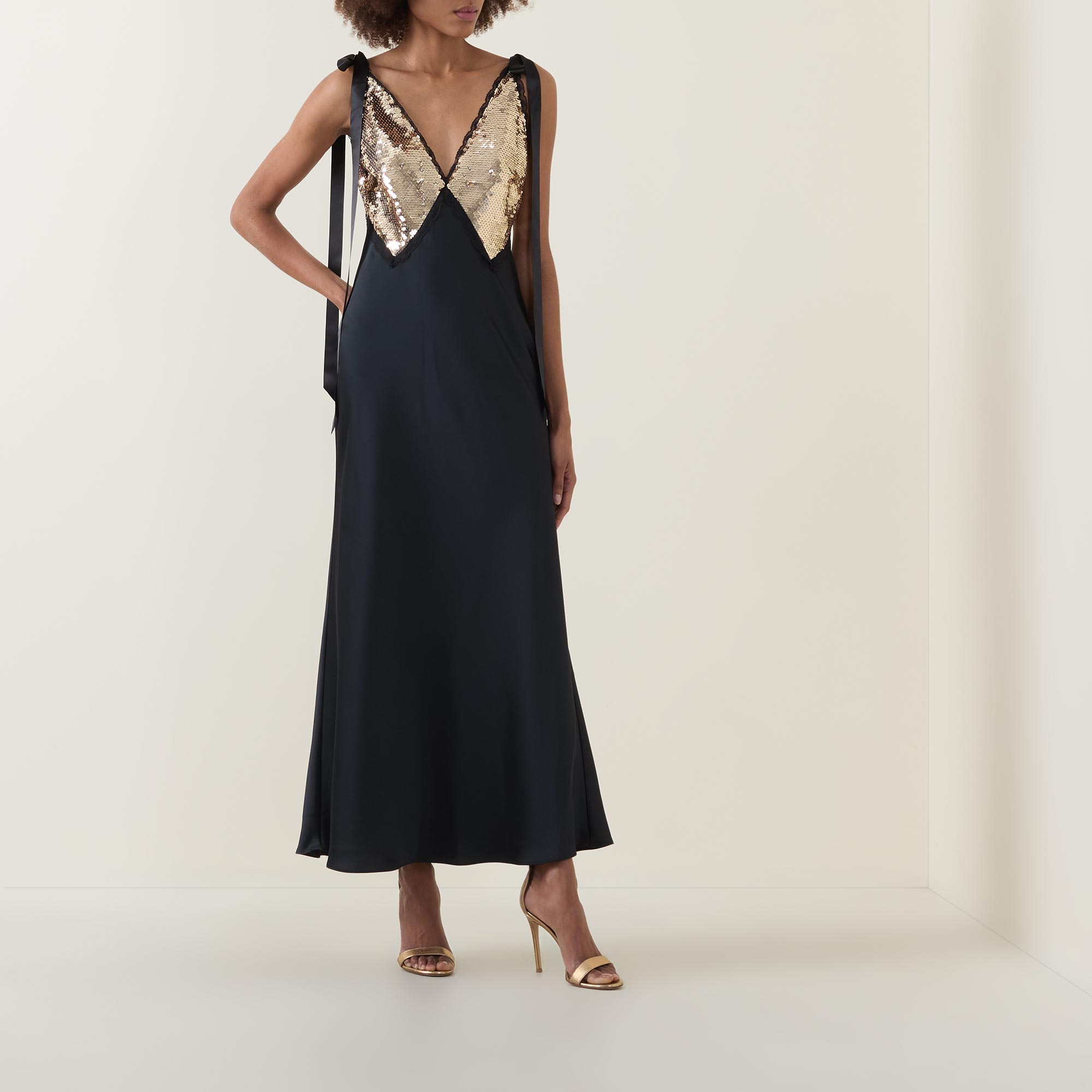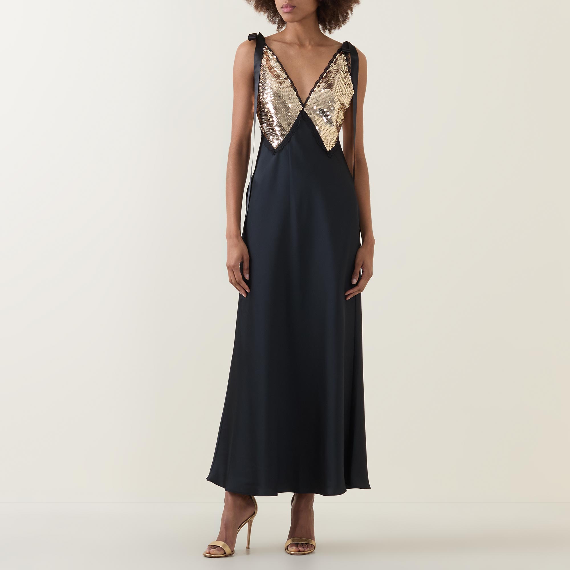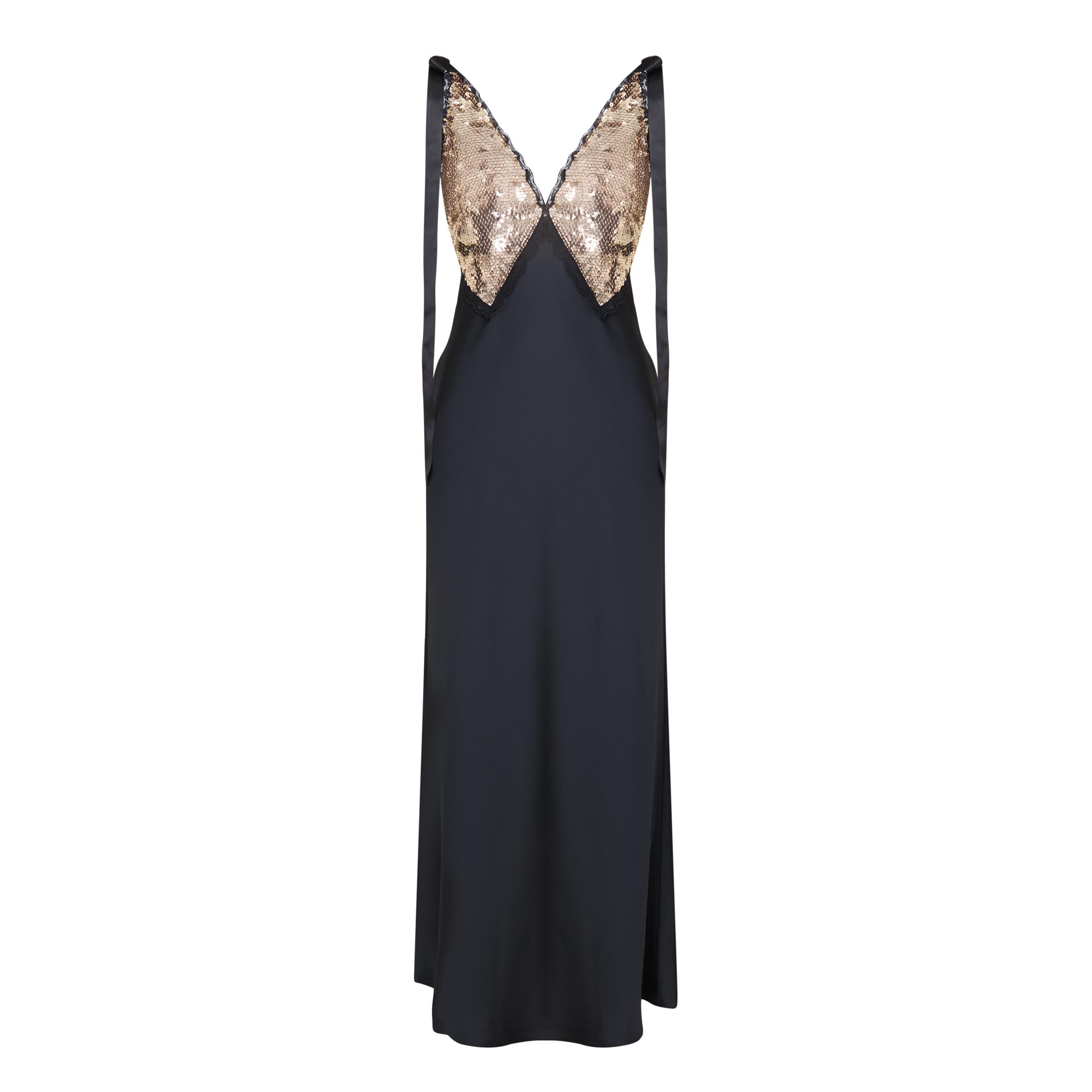 - Deep V-neckline, wide straps with ribbon tie detailing, sequin-adorned bodice, fishtail skirt, maxi length, smooth finish