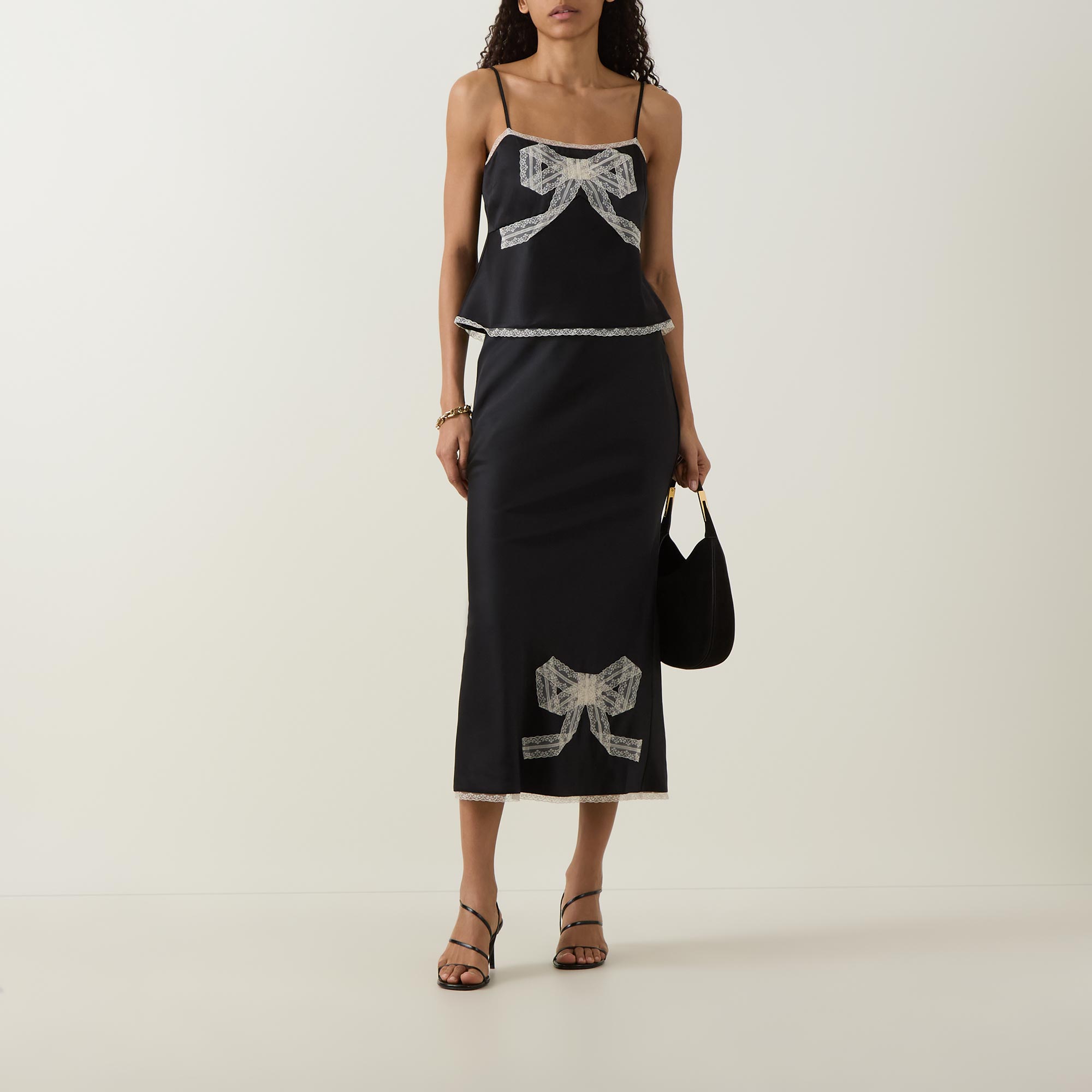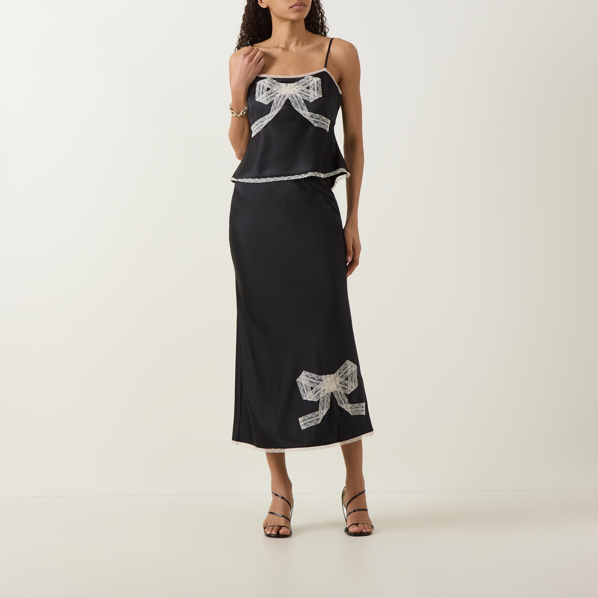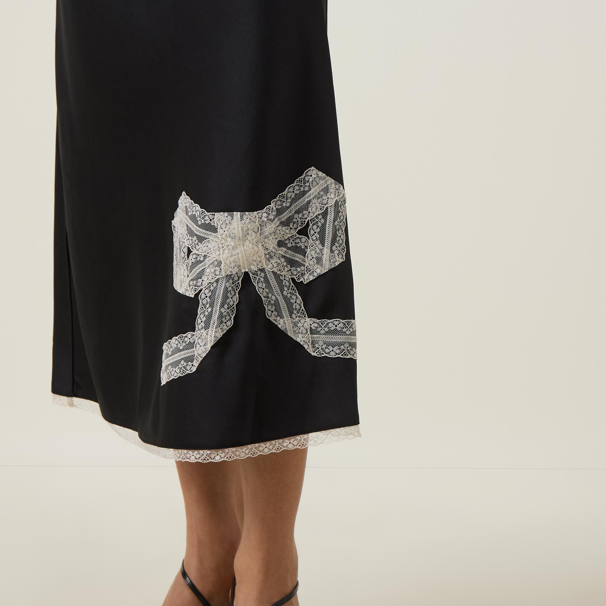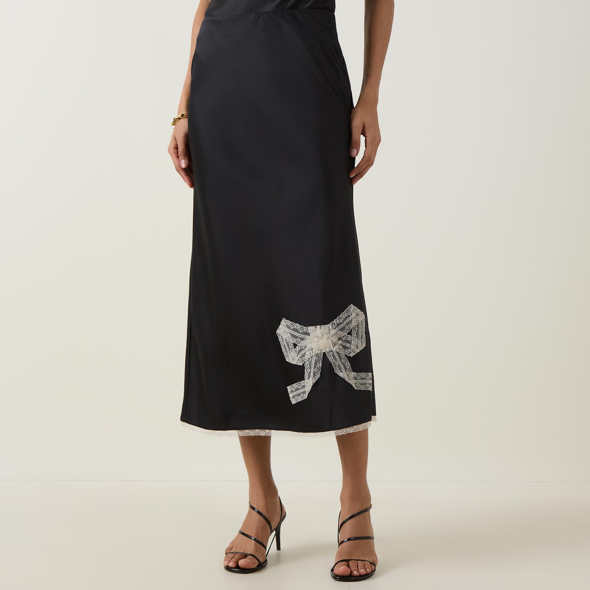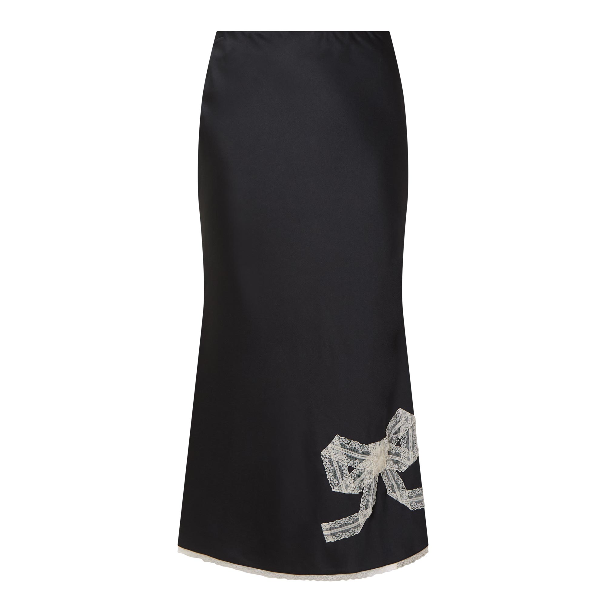 - Inner elasticated waistband, high-rise, contrasting bow detail to the front, contrasting lace trim on hem, flared silhouette, midi length, smooth finish