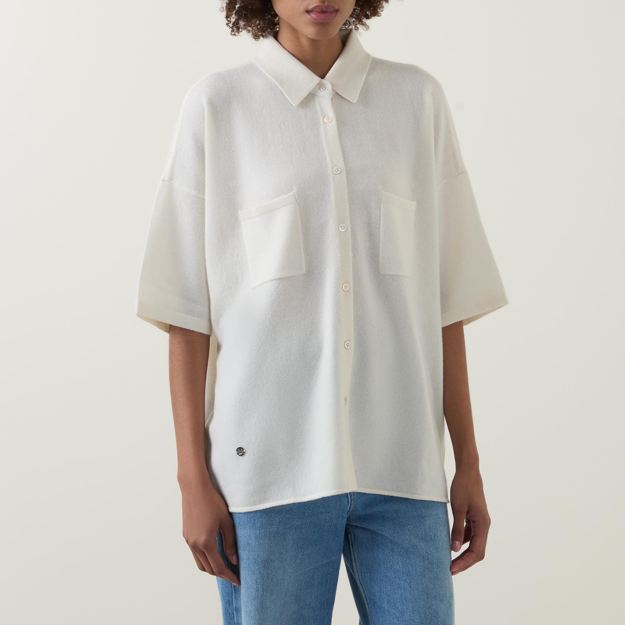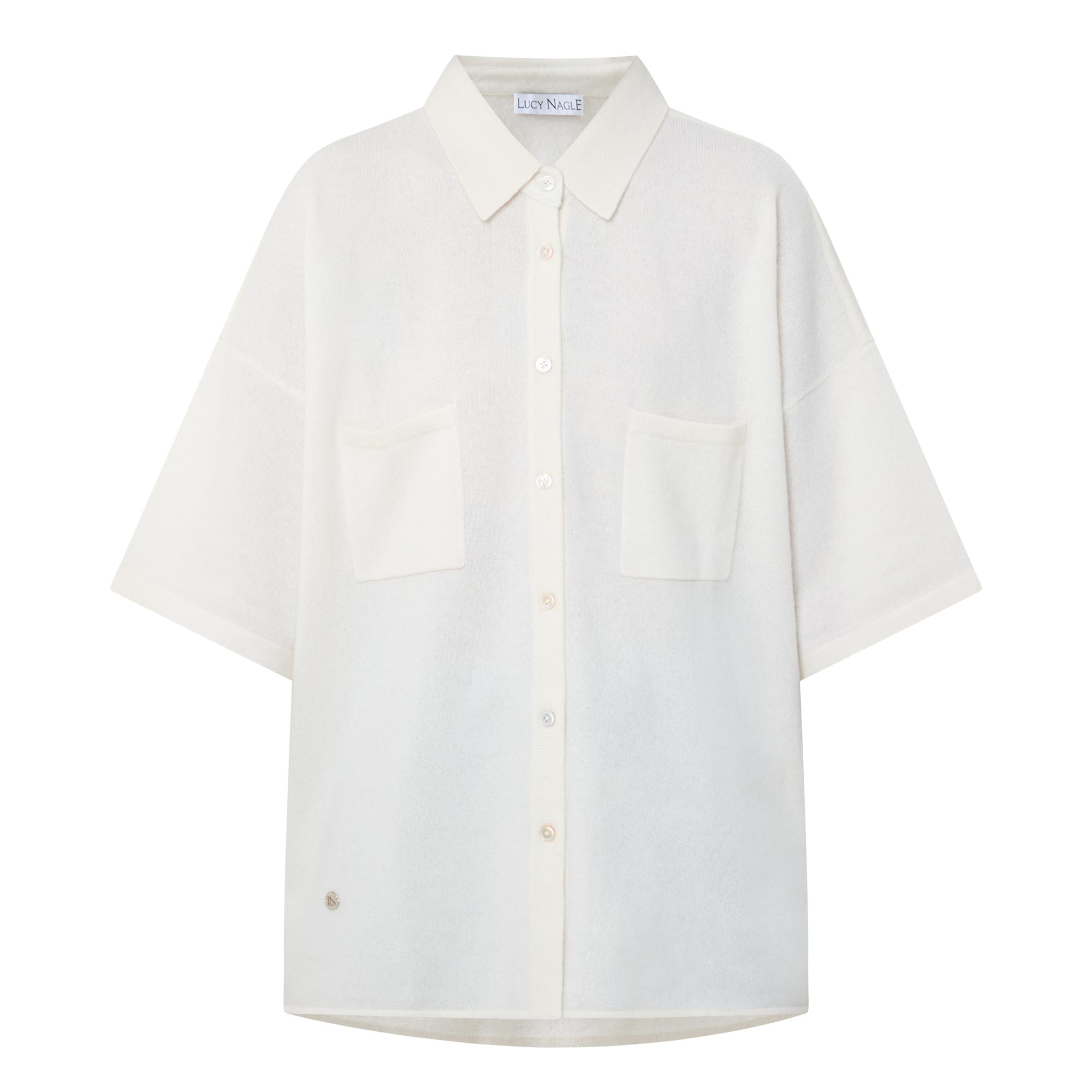 - Semi sheer, cropped sleeves, pointed collar, button fastenings, chest pockets, metal logo plaque