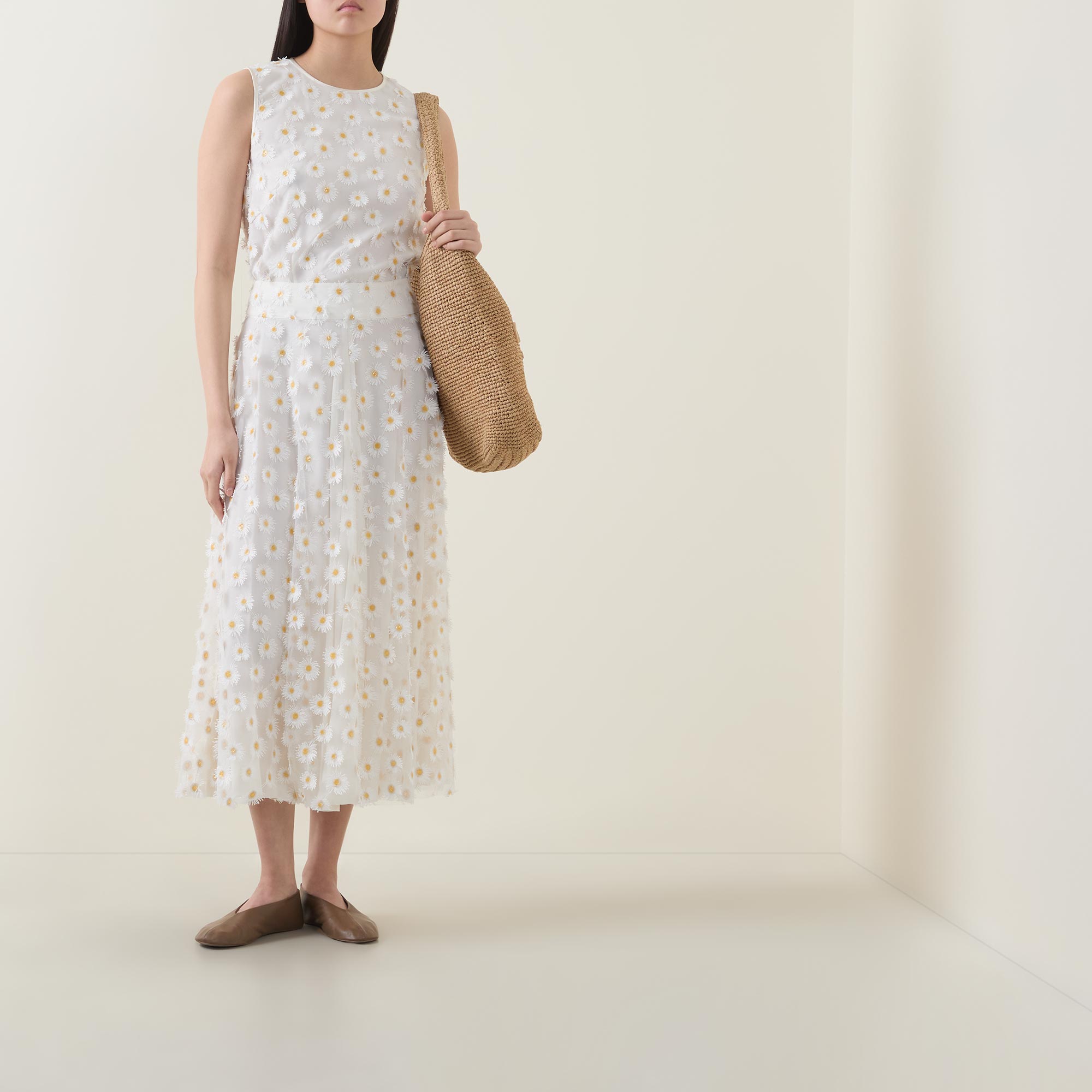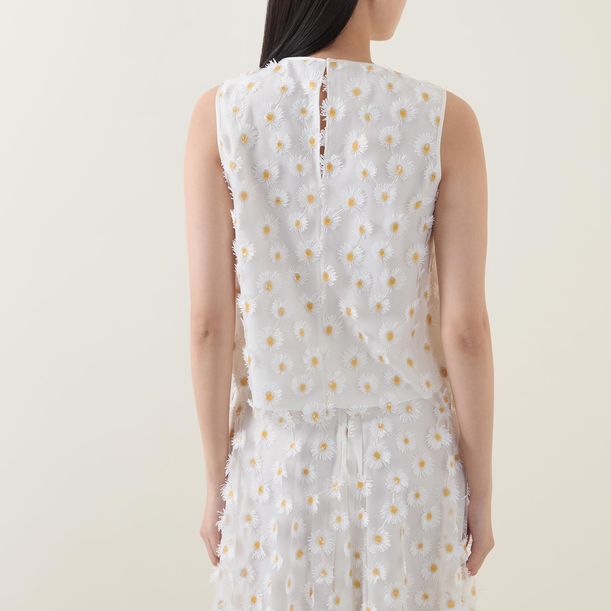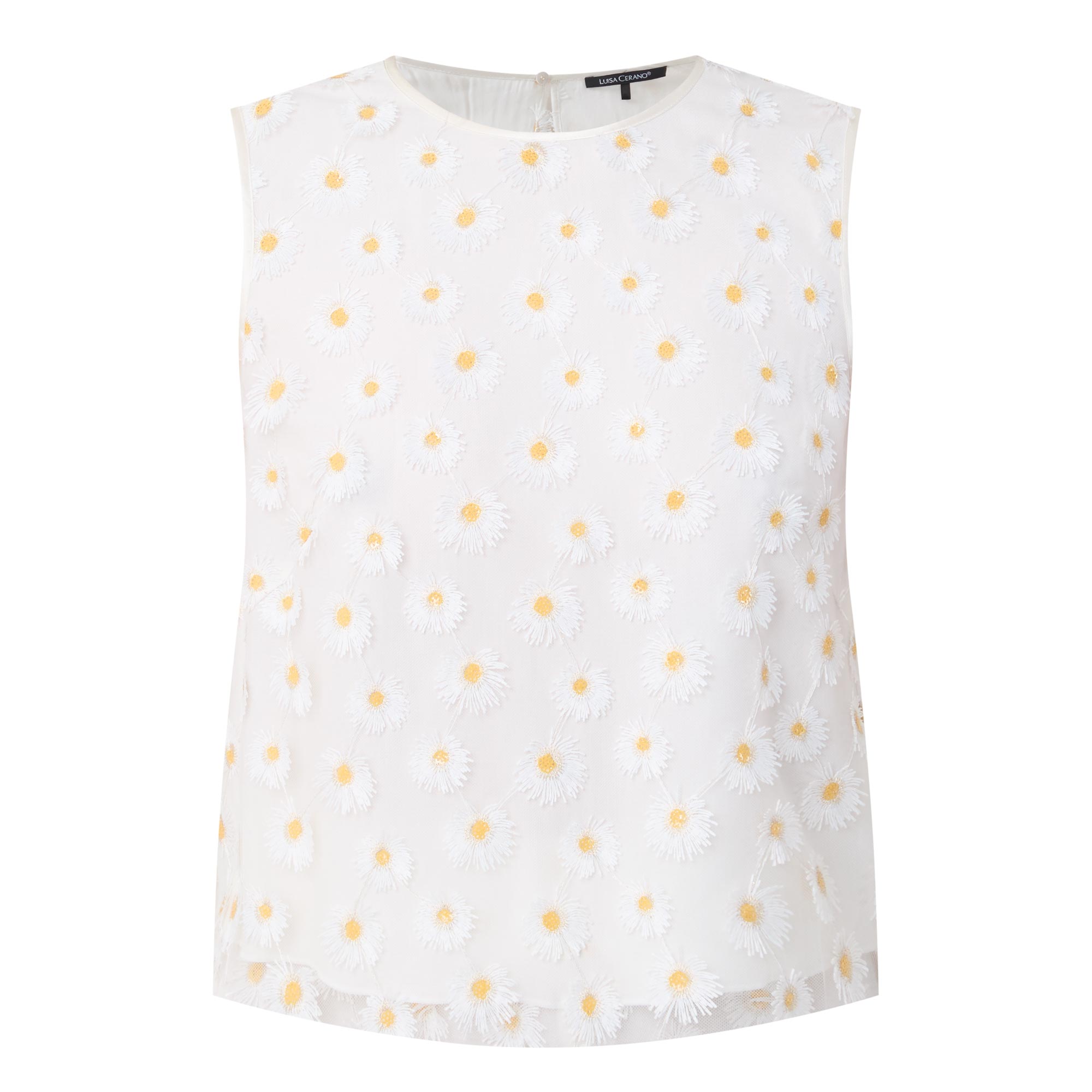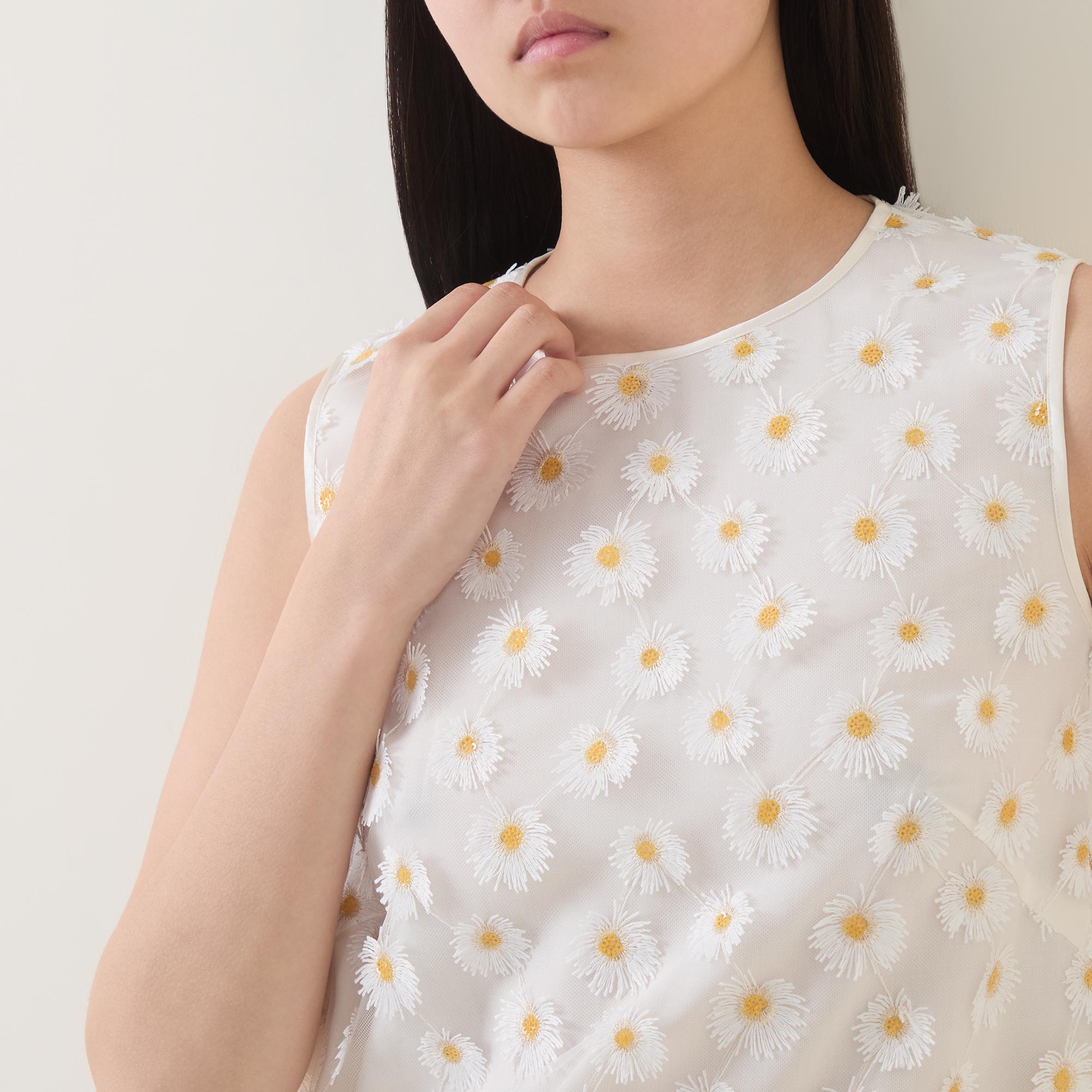• Sleeveless, all-over daisy appliques, round neck, straight fit, tulle fabric