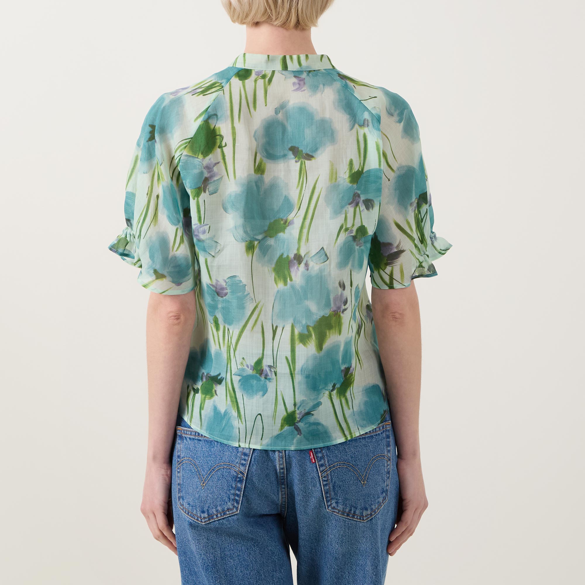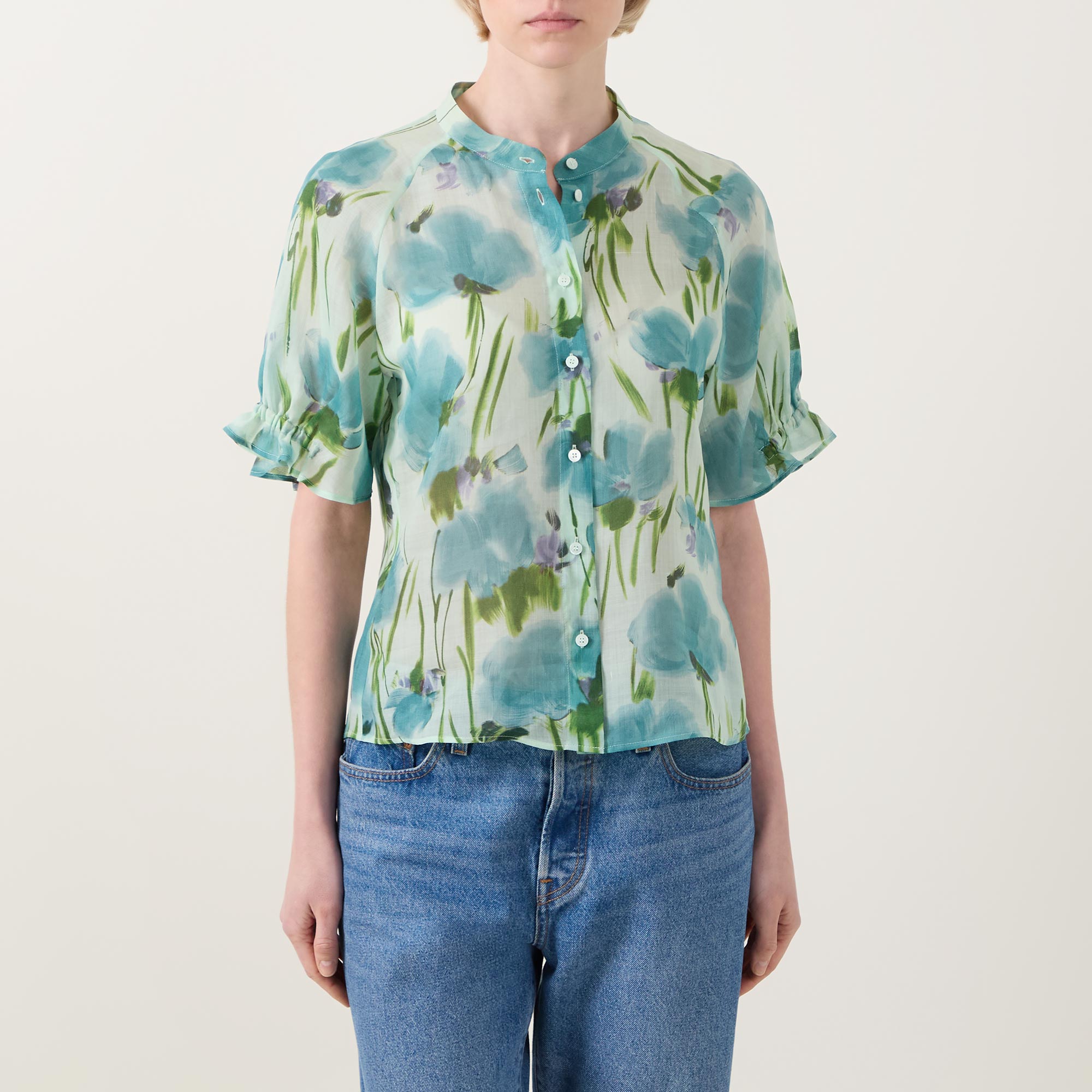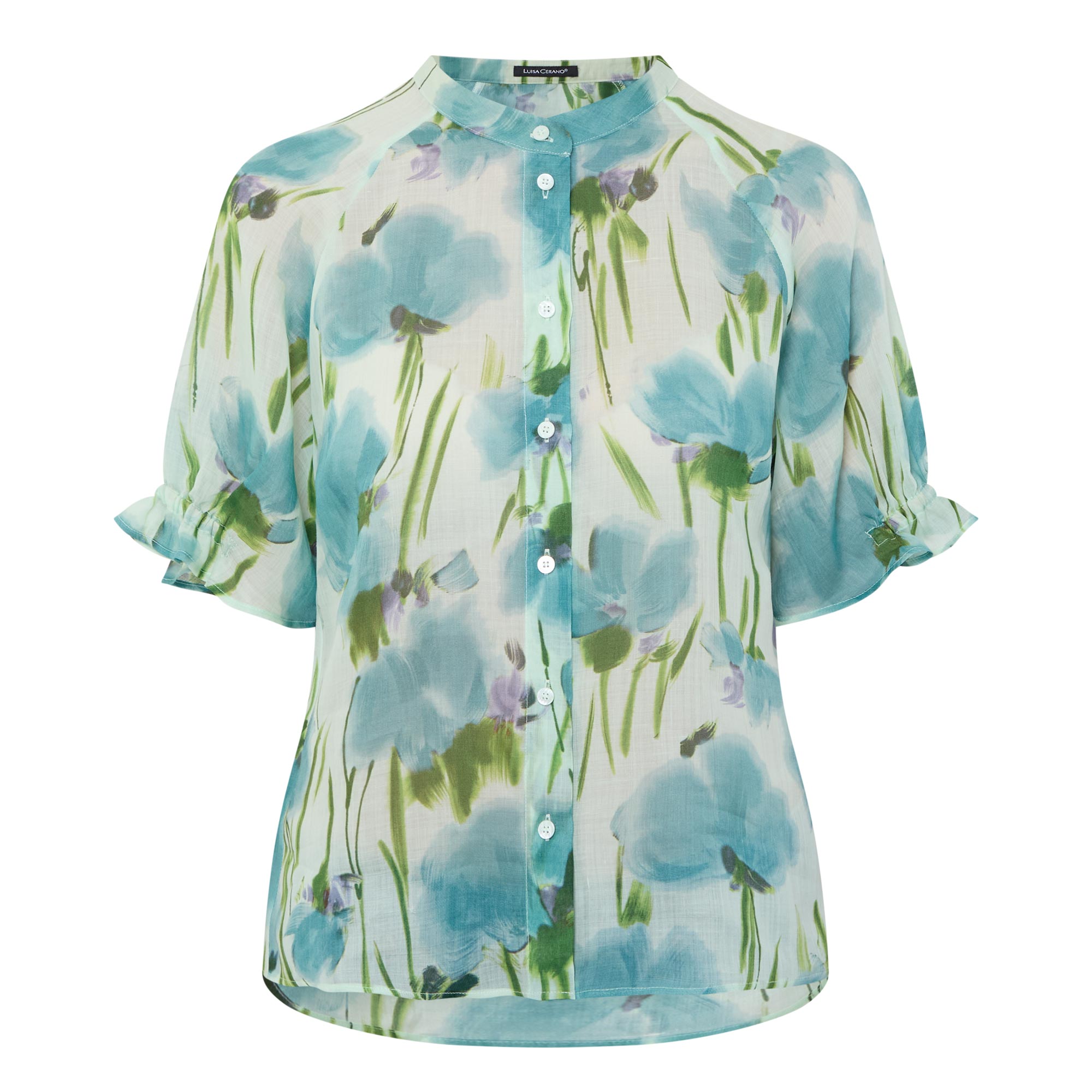 - Short sleeves, semi-sheer fabric, graphic floral design, full-length button placket, ruffle details, mother-of-pearl buttons, round neckline