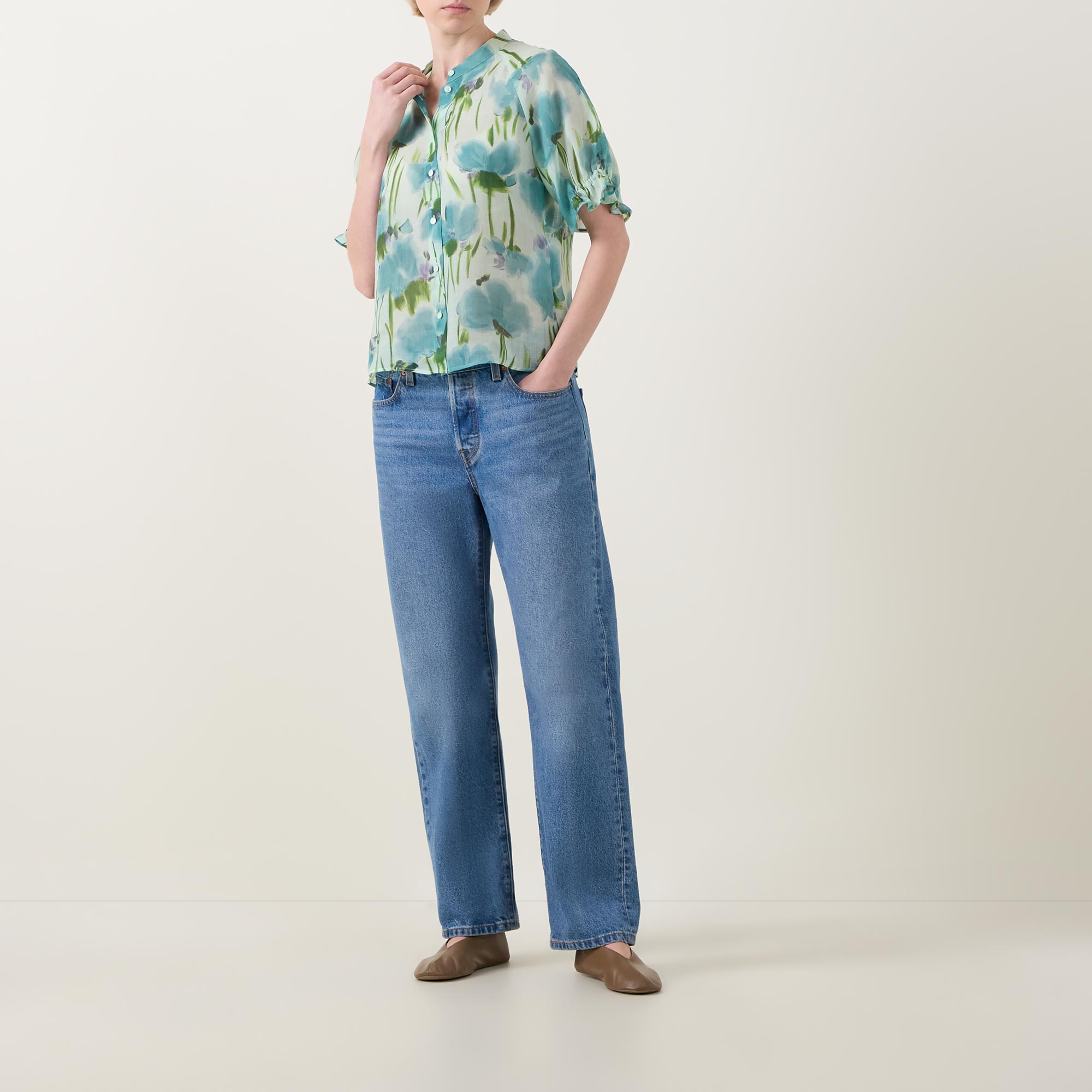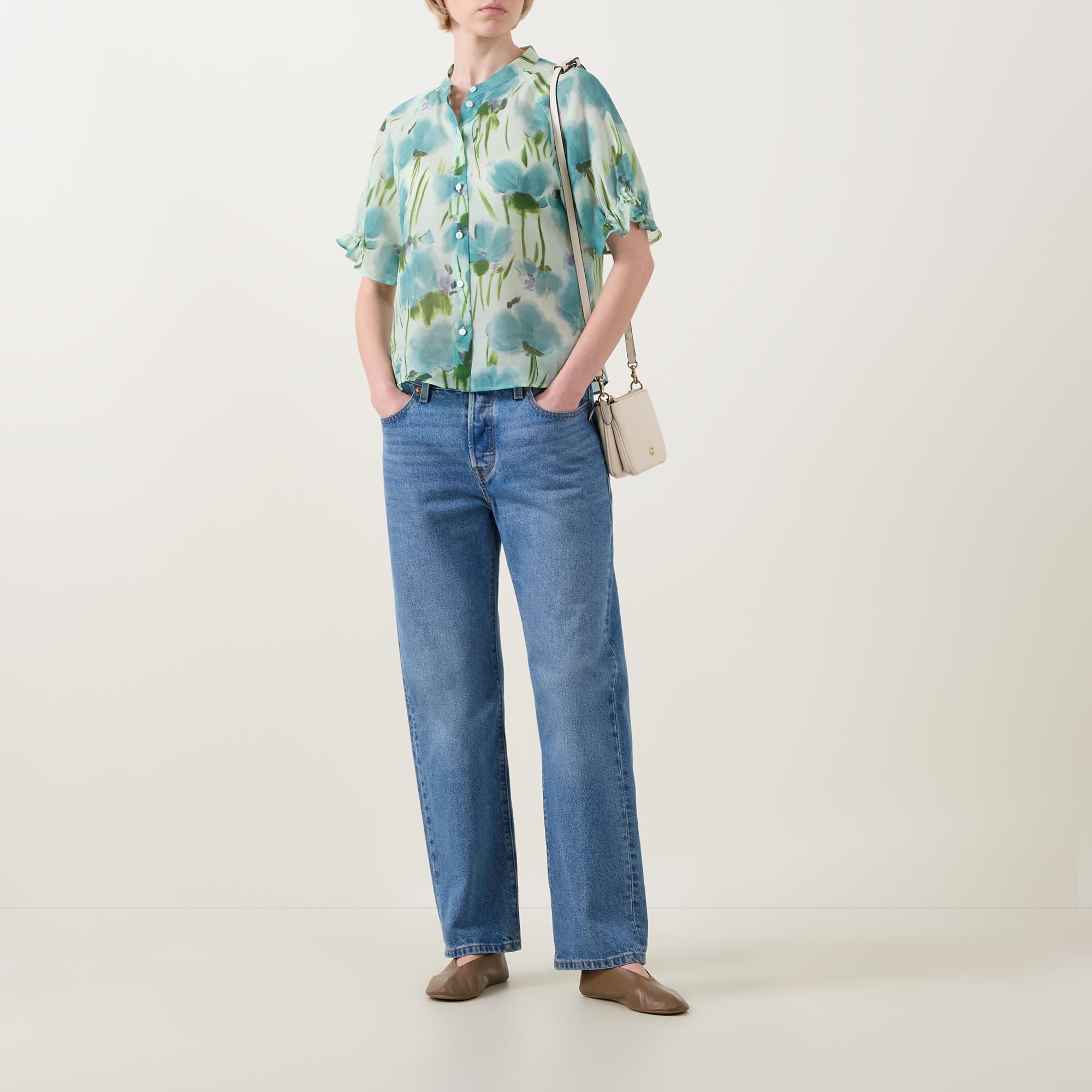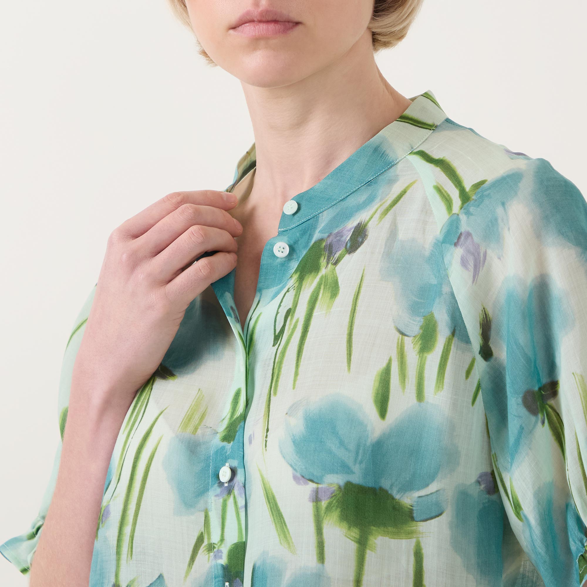 - Short sleeves, semi-sheer fabric, graphic floral design, full-length button placket, ruffle details, mother-of-pearl buttons, round neckline