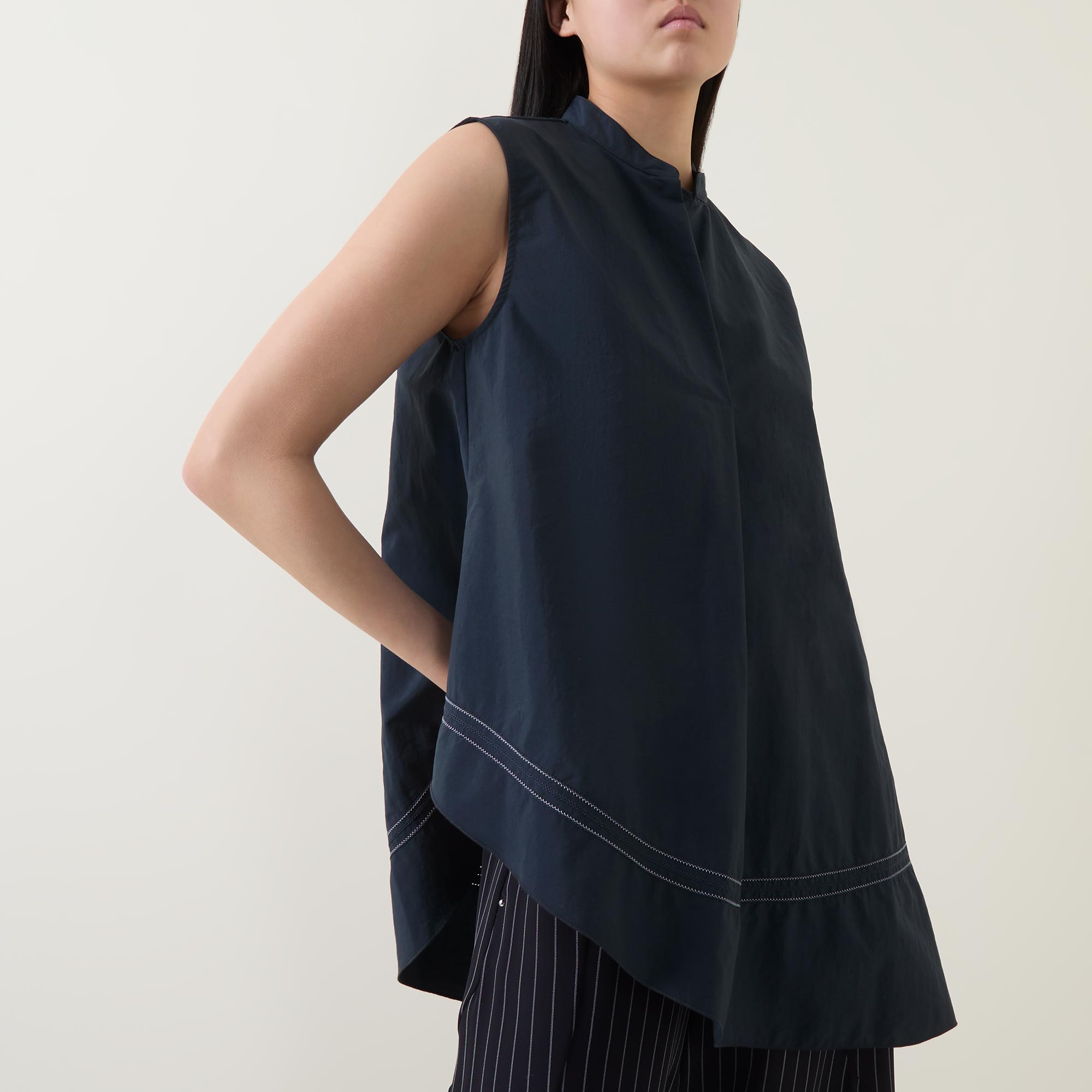 - Stand collar, split neckline, front pleat, sleeveless design, asymmetric hem, contrast stitching, rear logo hardware