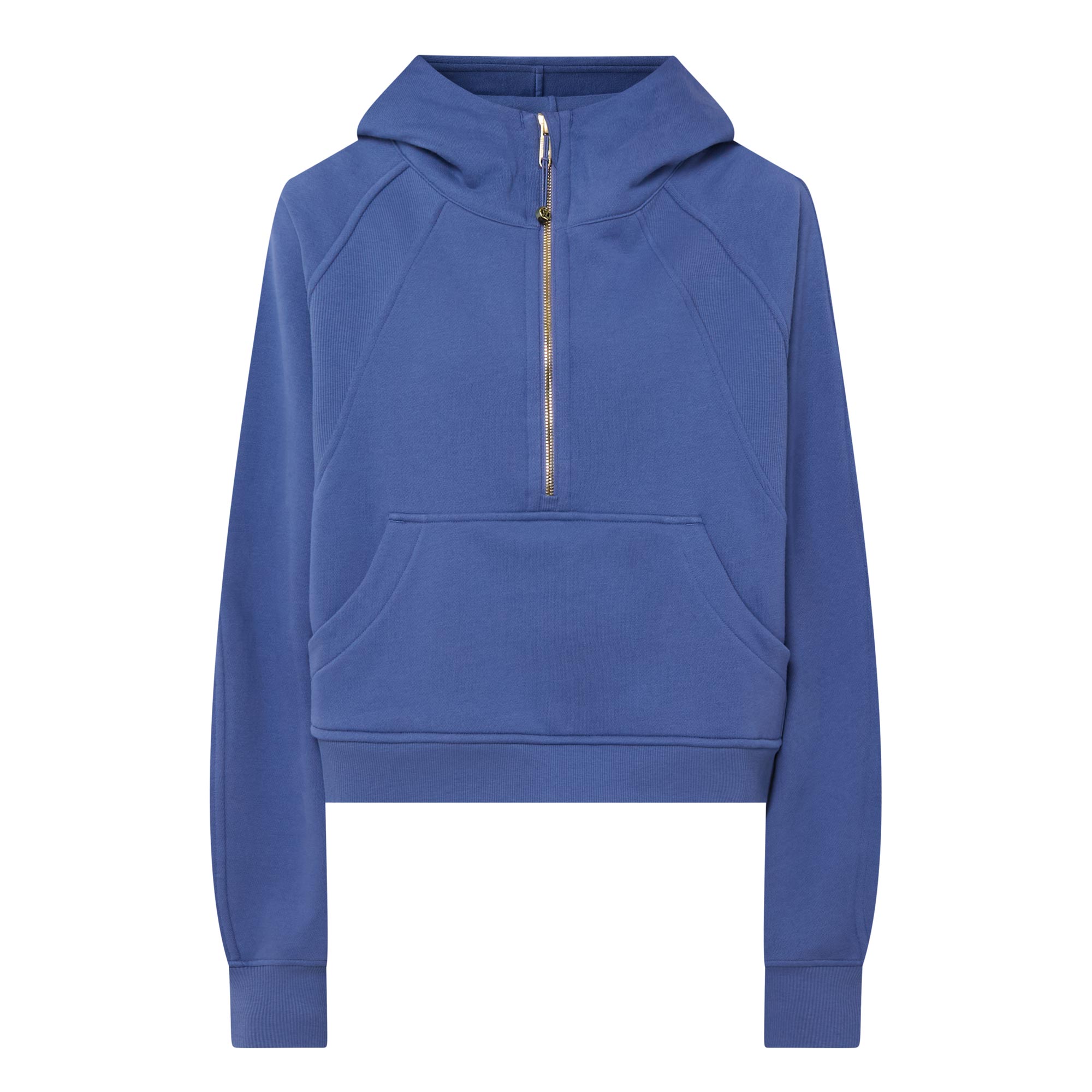 - Features: Kangaroo pocket with hidden phone sleeve, zipper garage keeps chafe in check, elastic zipper pull doubles as an emergency hair tie, thumbholes, long sleeves, half zip-fastening placket, funnel neckline, logo detail