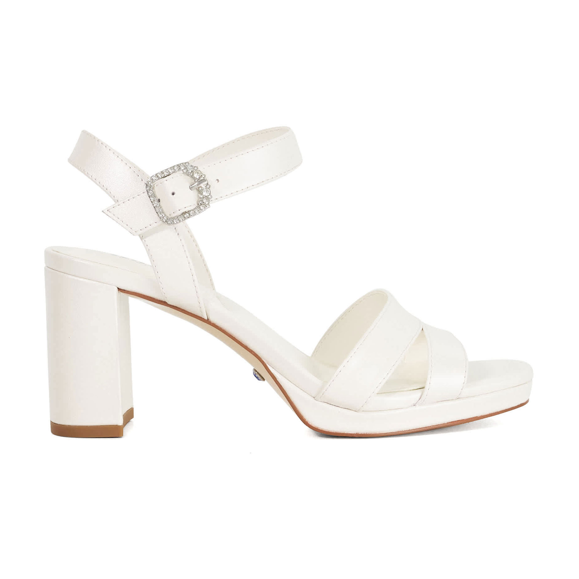 • Leather, wedding style, adjustable buckle fastening, platform block heel, square toe, textured finish