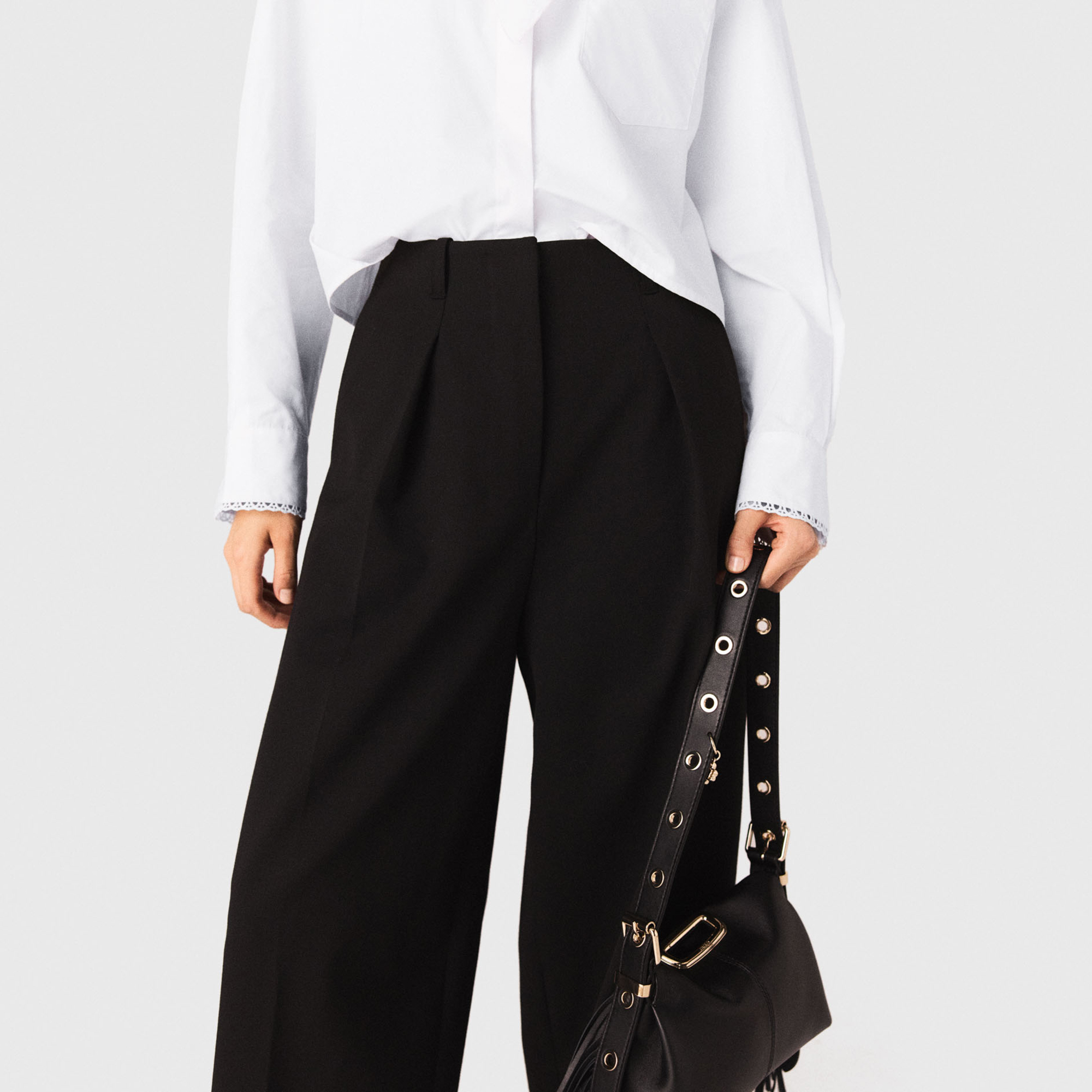 - Double-pleated, palazzo style, belt loops, front pintucks, concealed hook-and-eye fastening