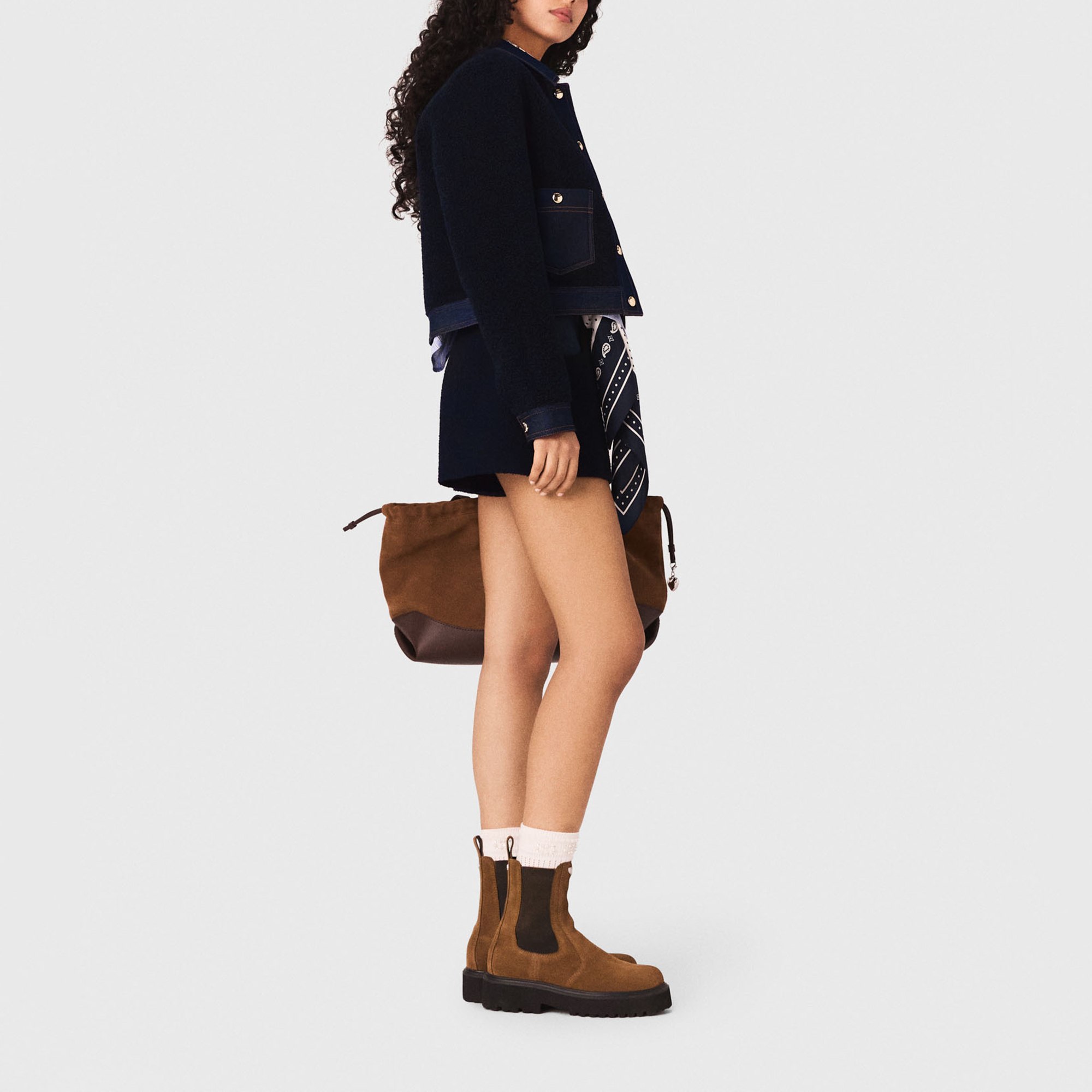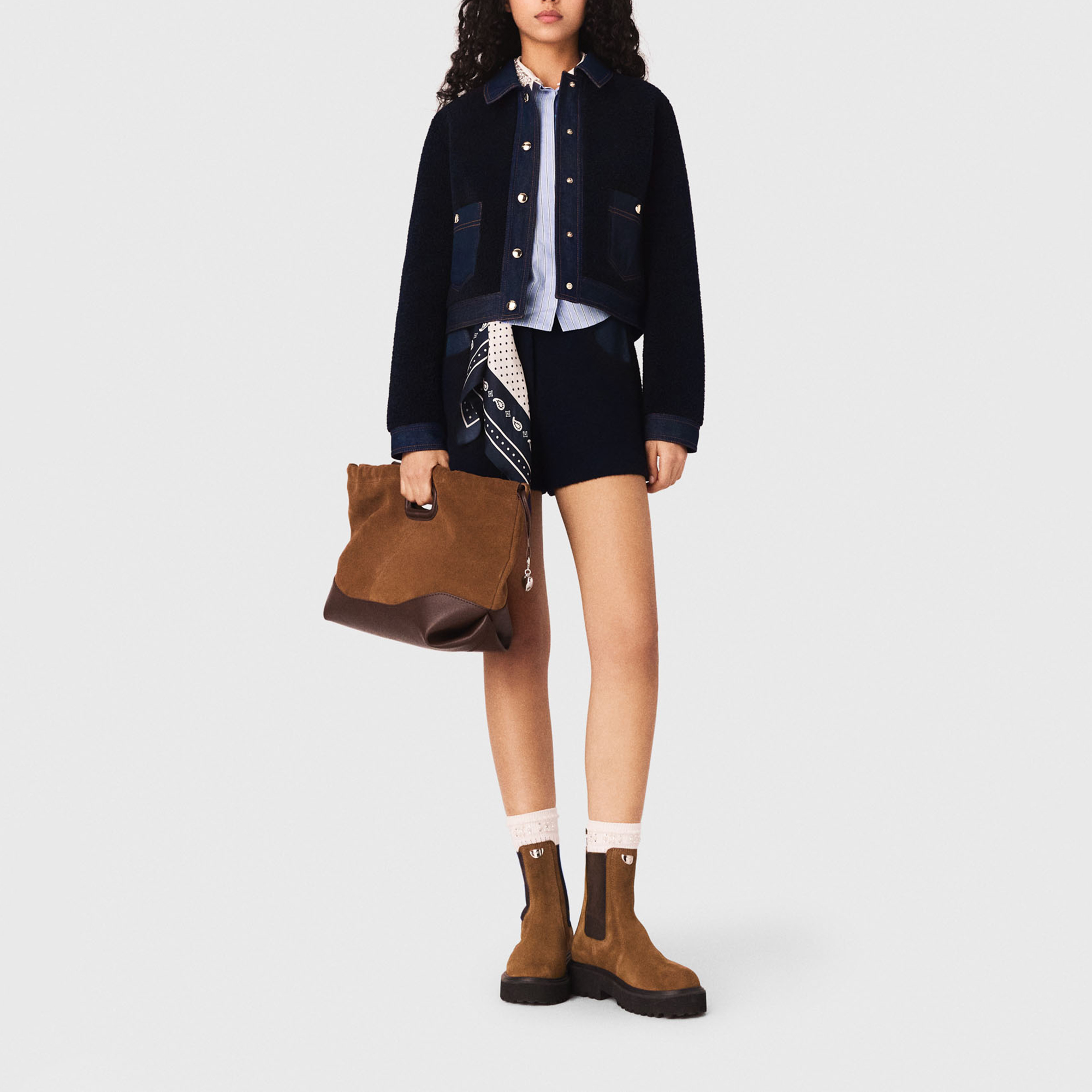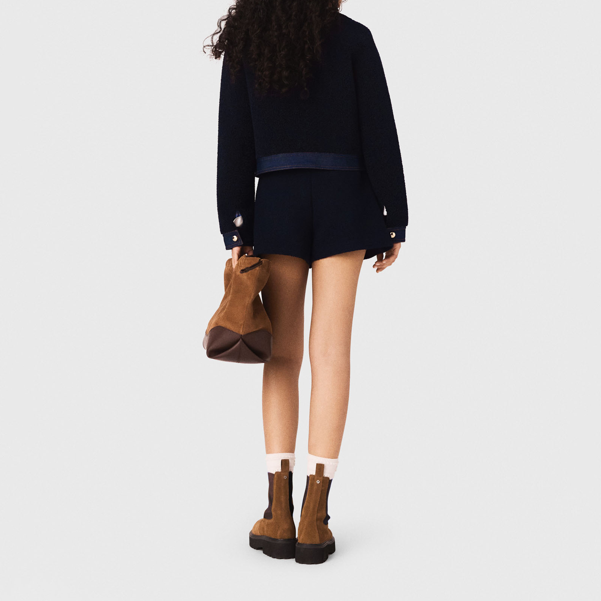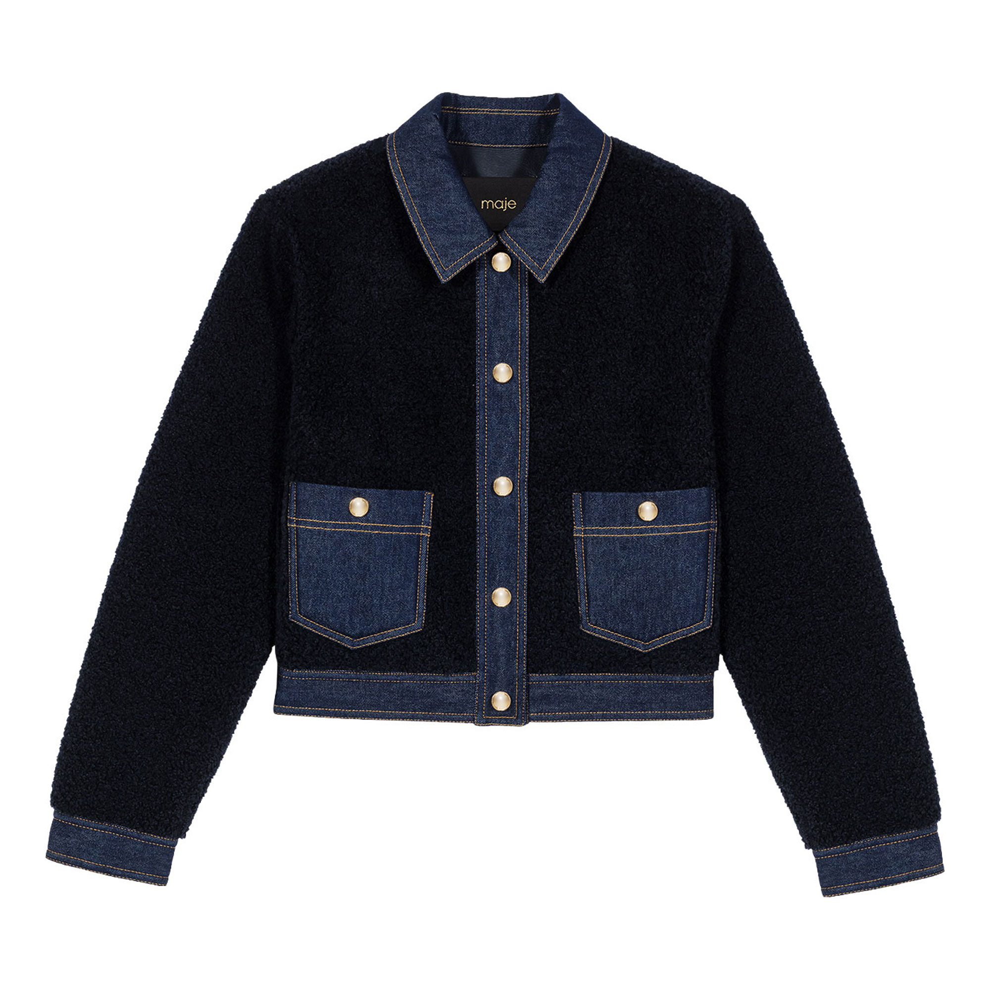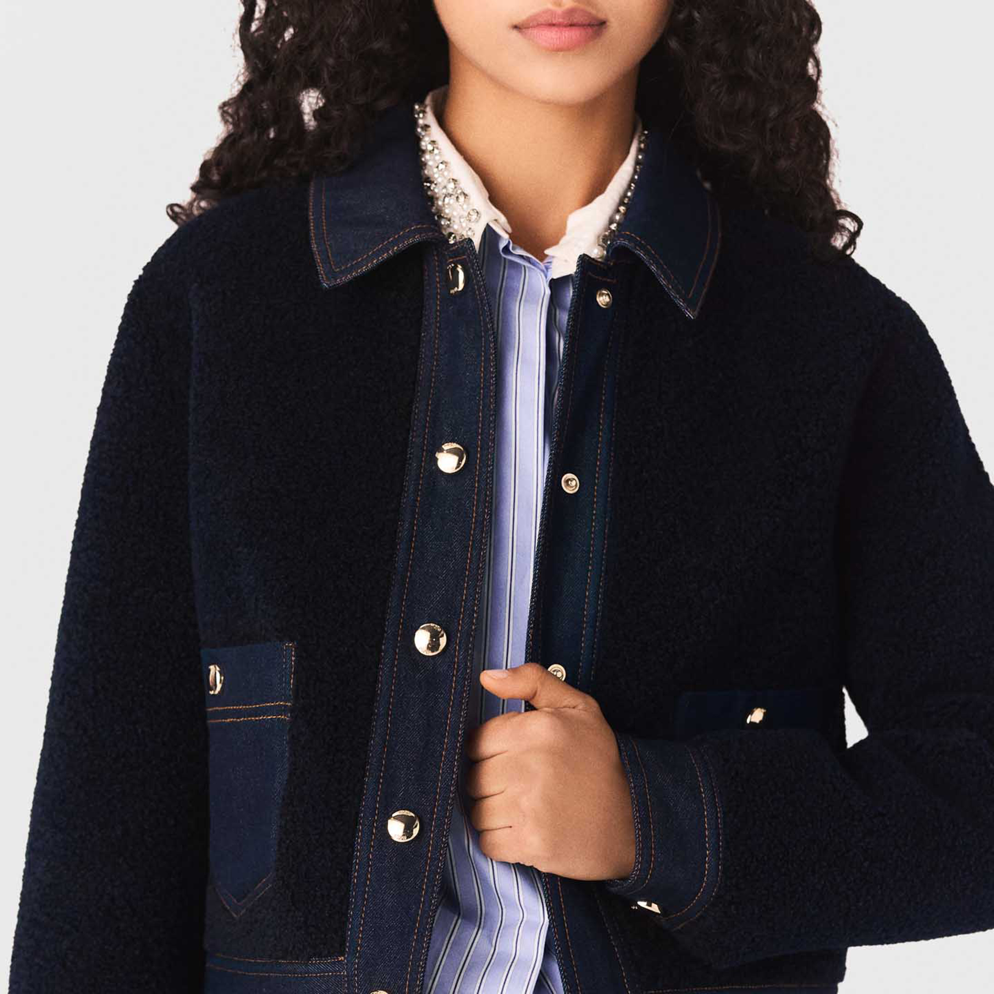 - Bouclé finish, denim trim, denim shirt collar and cuffs, gold-tone press-stud fastening, two pockets, contrast topstitching, boxy silhouette
