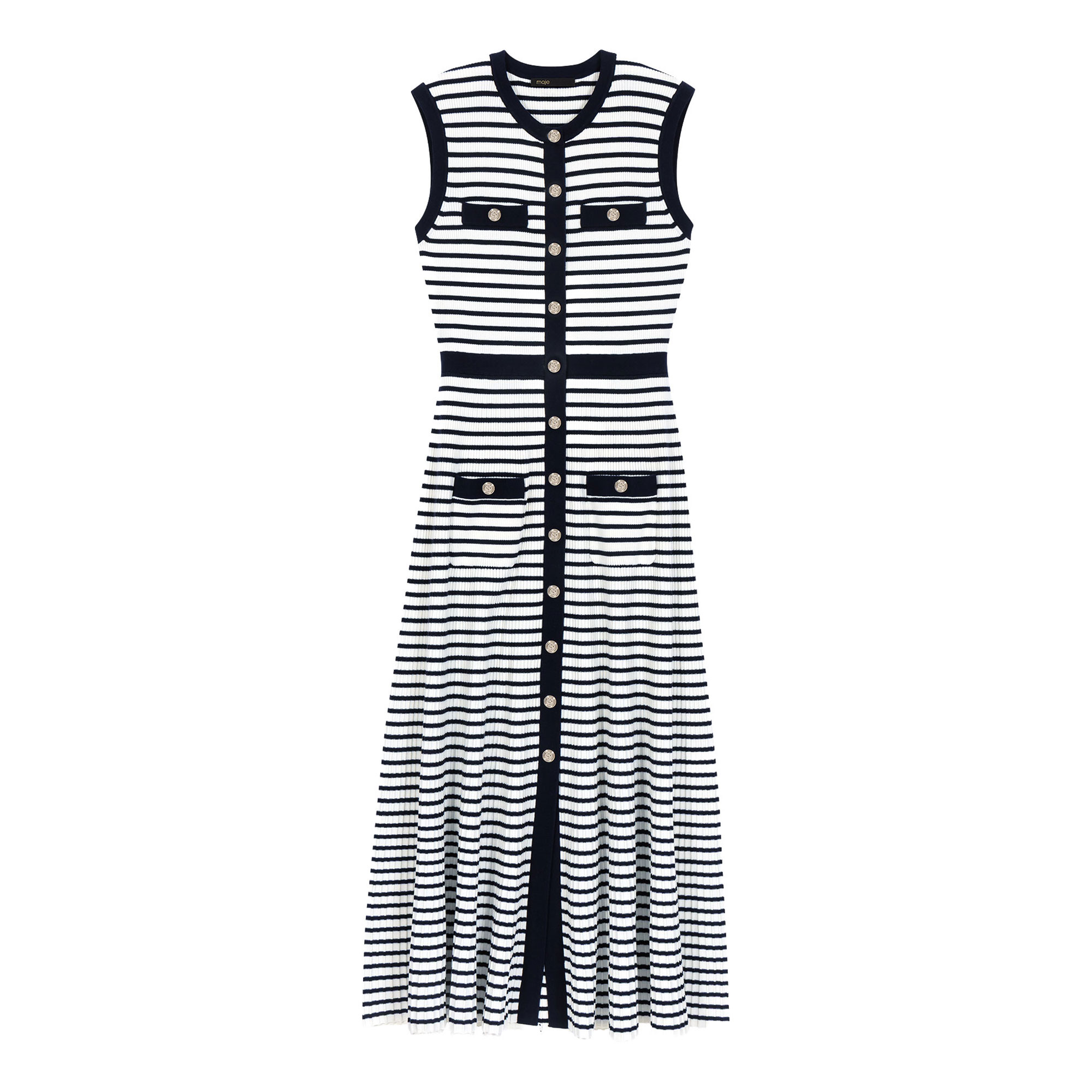 • Breton-stripe style, knitted, maxi length, round gold-tone metal buttons with crest design, four patch pockets, piping, ribbed crew neckline, contrasting button placket and waistband