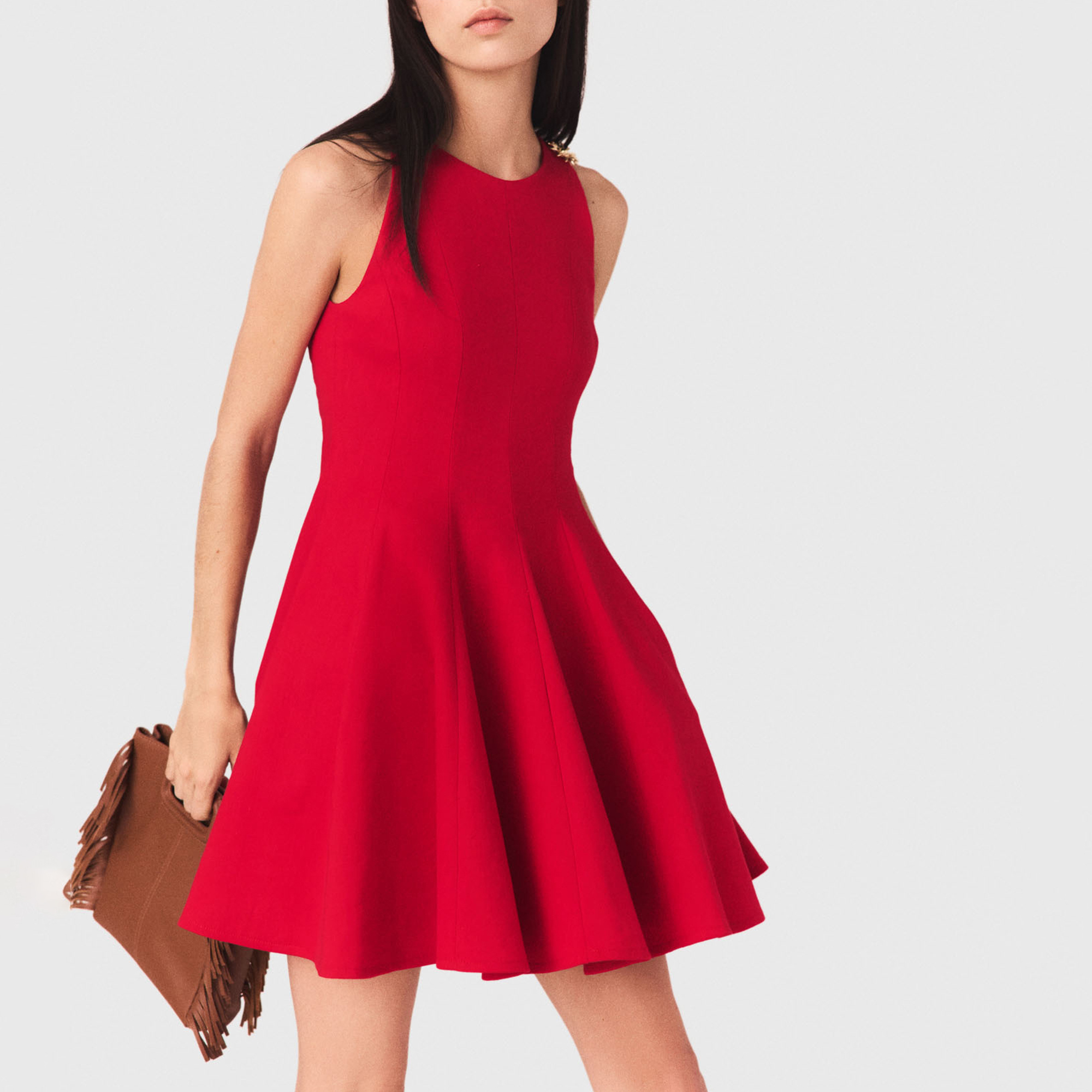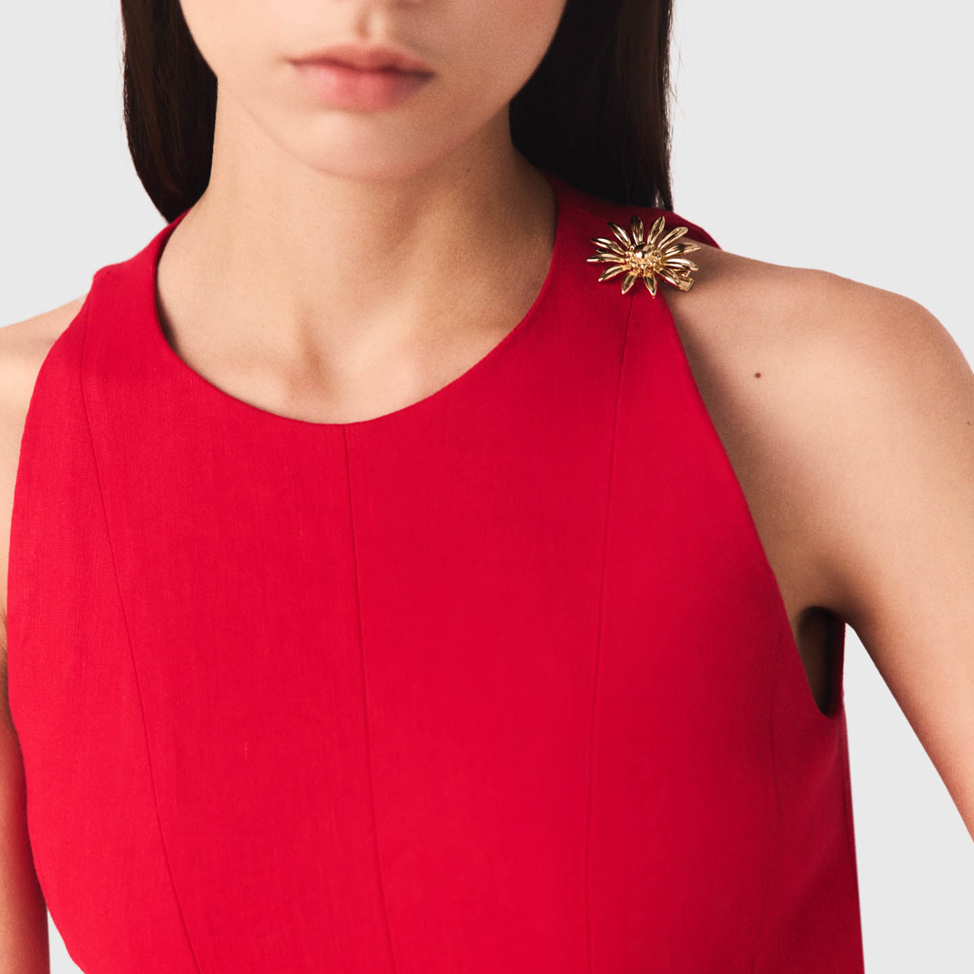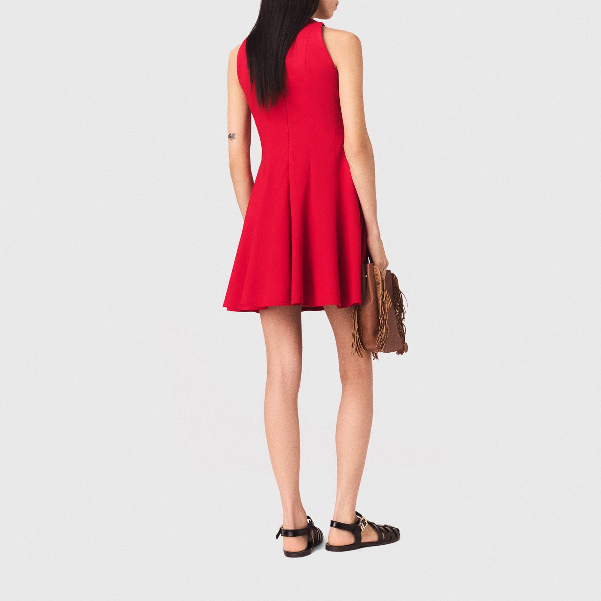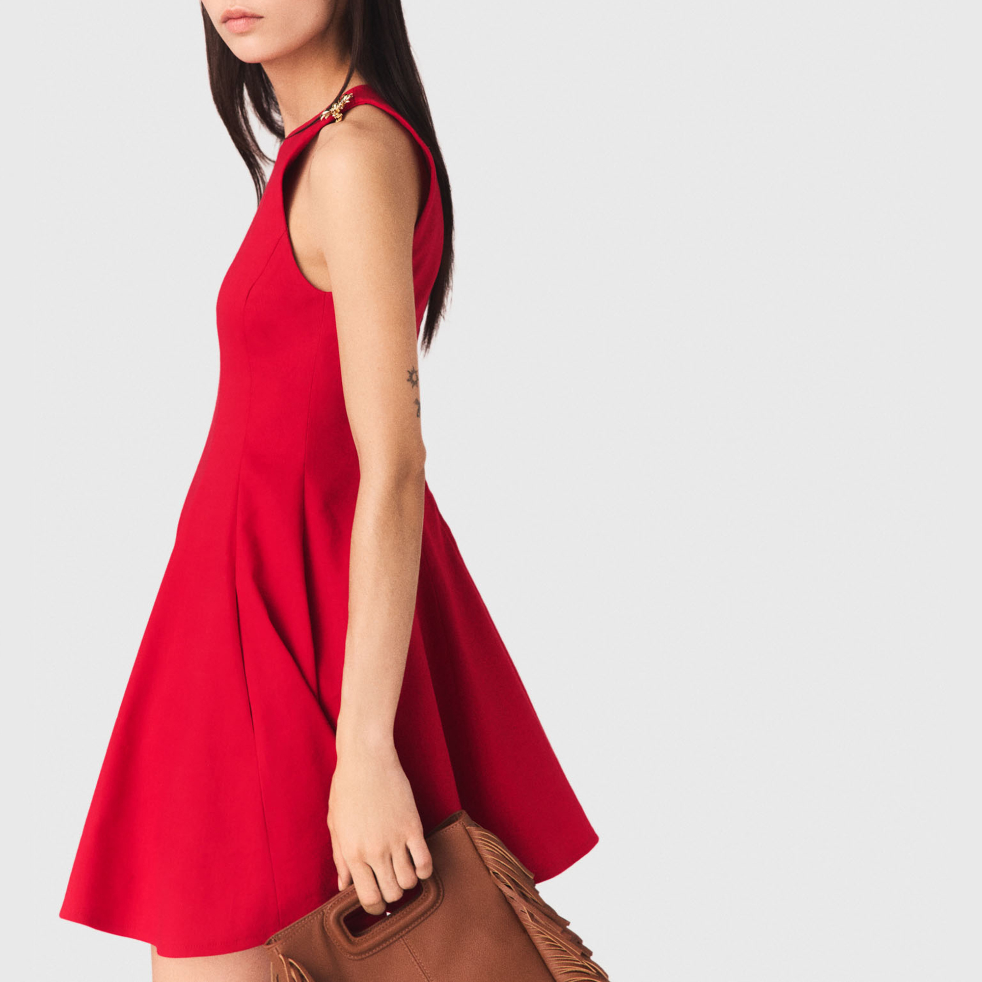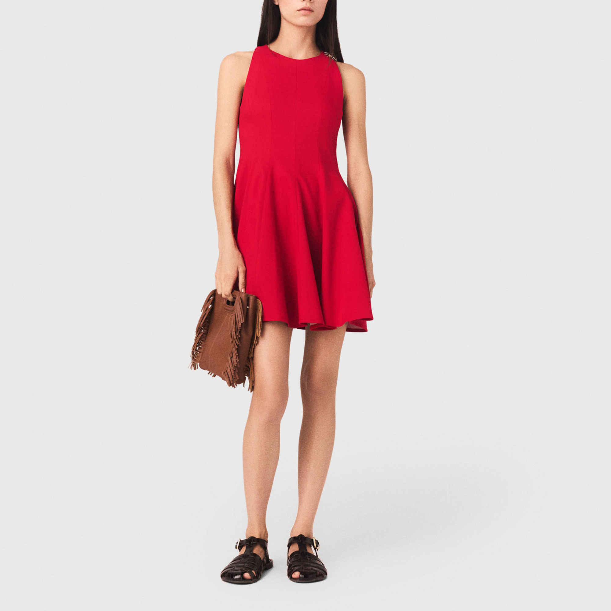 - Mini length, skater style, open halter neckline, flared skirt, removable gold-tone brooch, zip fastening, sleeveless, fit-and-flare cut