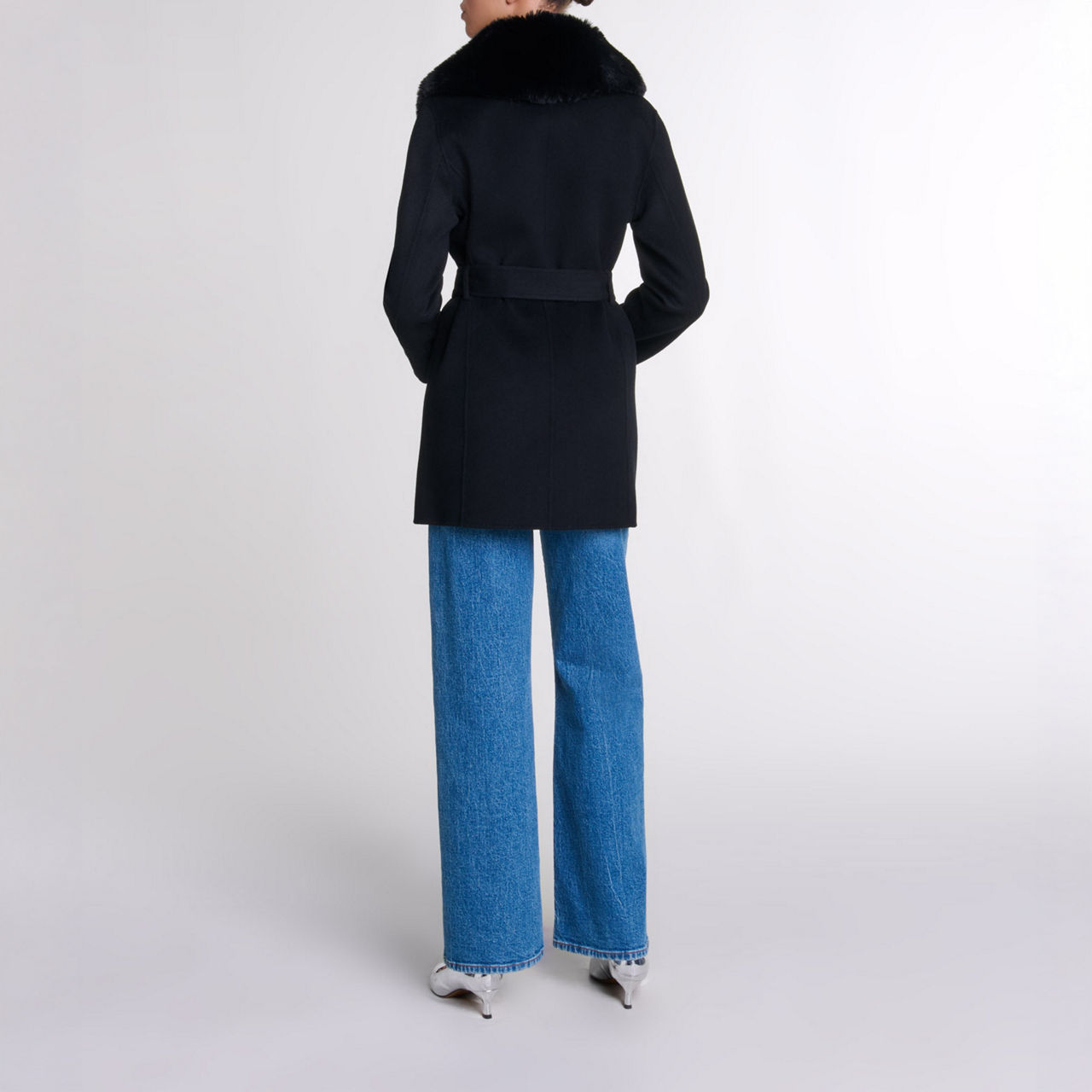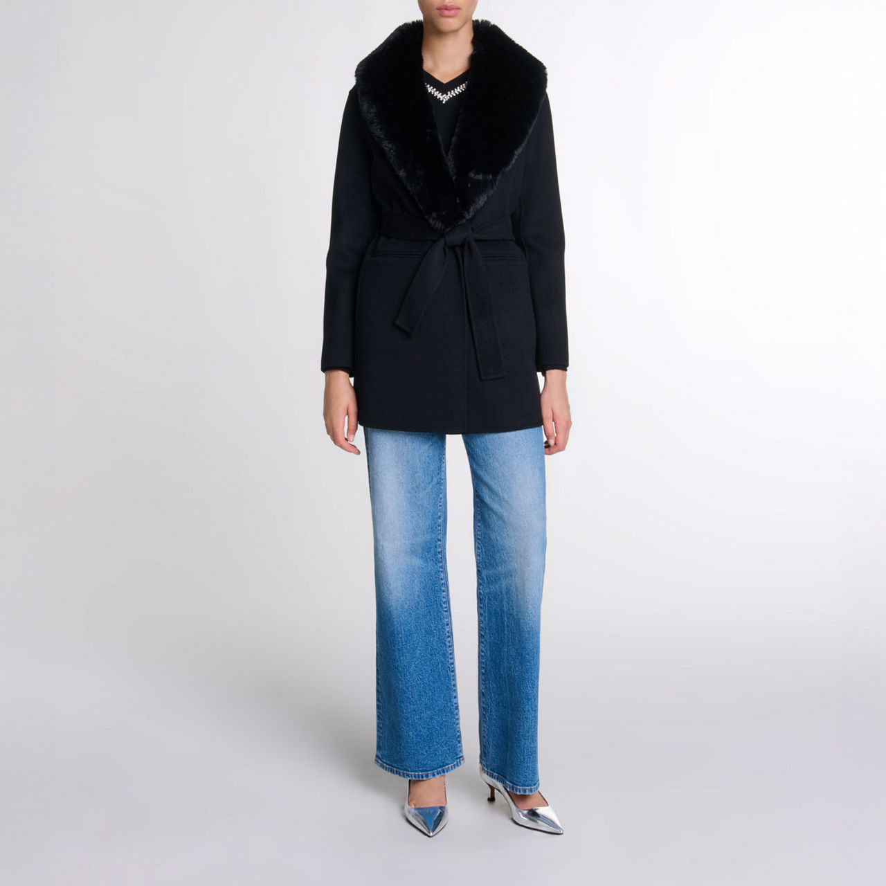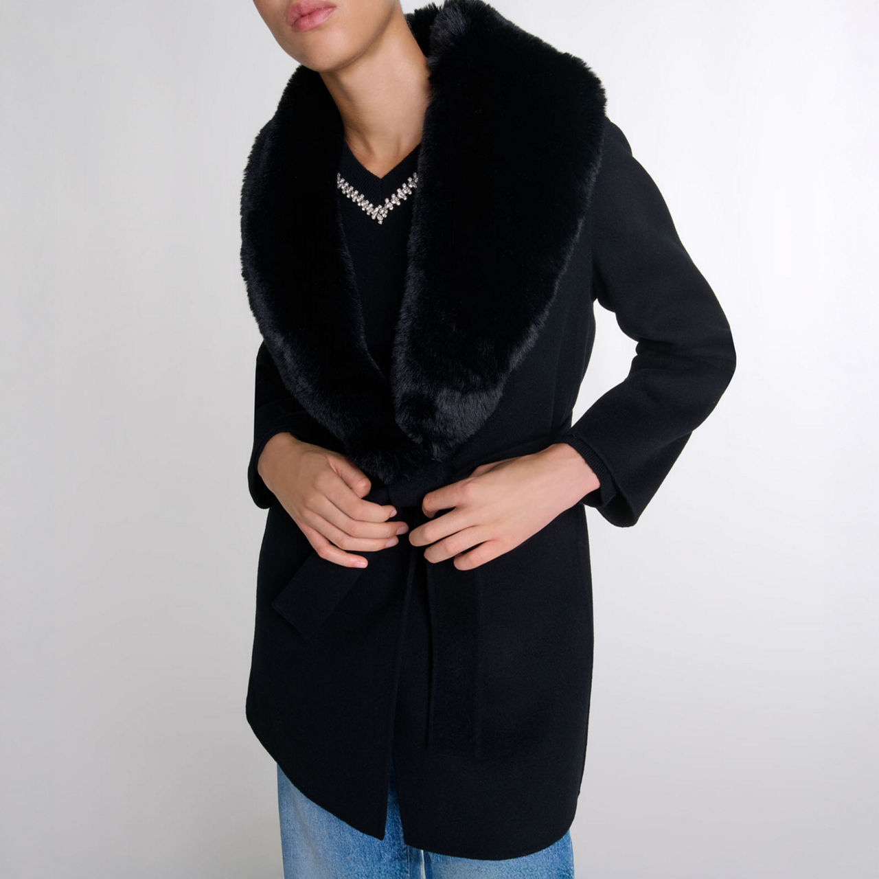 - Removable faux-fur lapels, long sleeves, self-tie belt, two welt pockets, double faced construction
