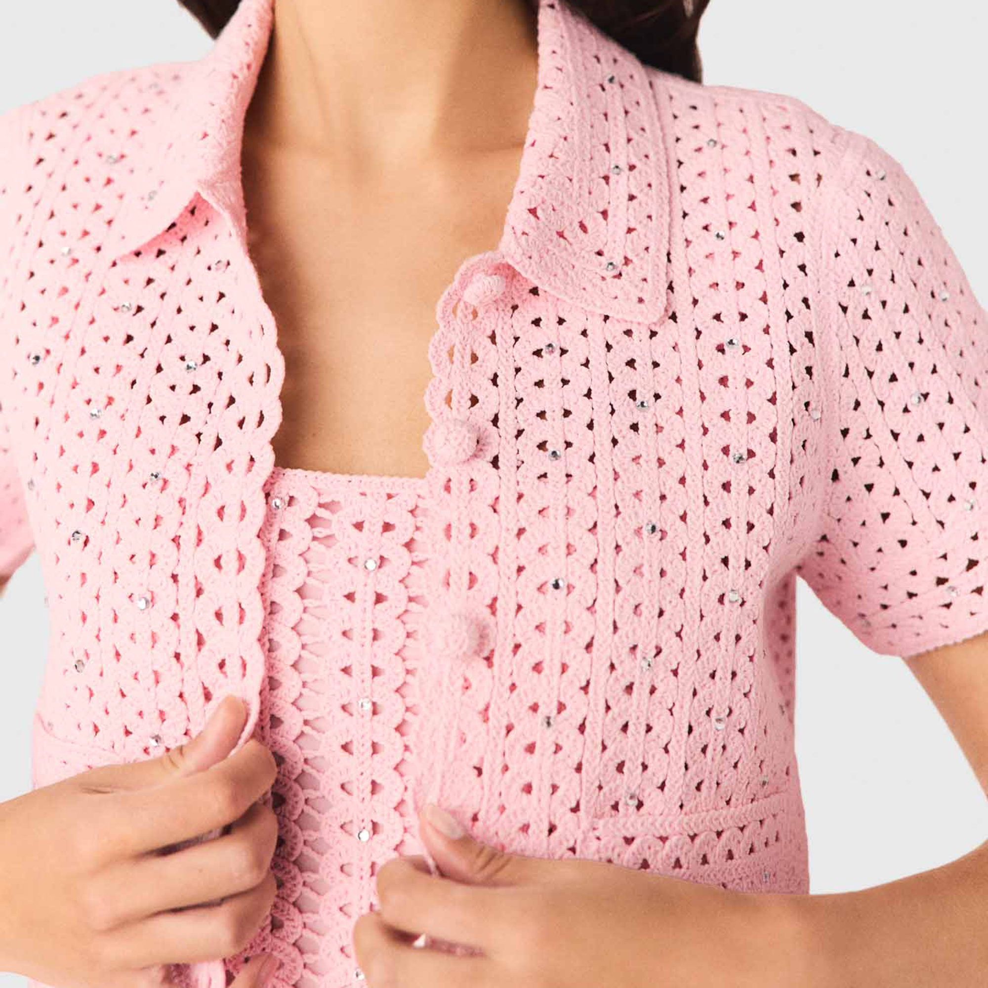 - Rhinestone details, crochet design, straight silhouette, tone-on-tone buttons, two patch pockets, scalloped trim, openwork style, polo collar