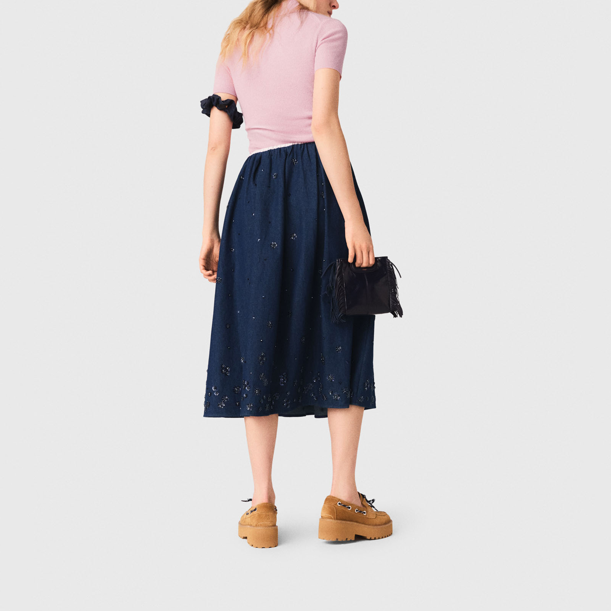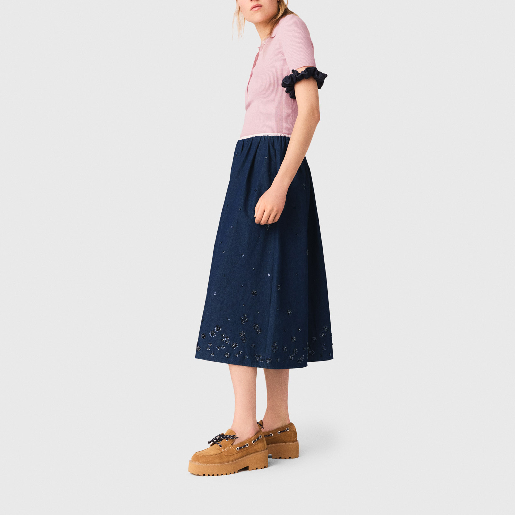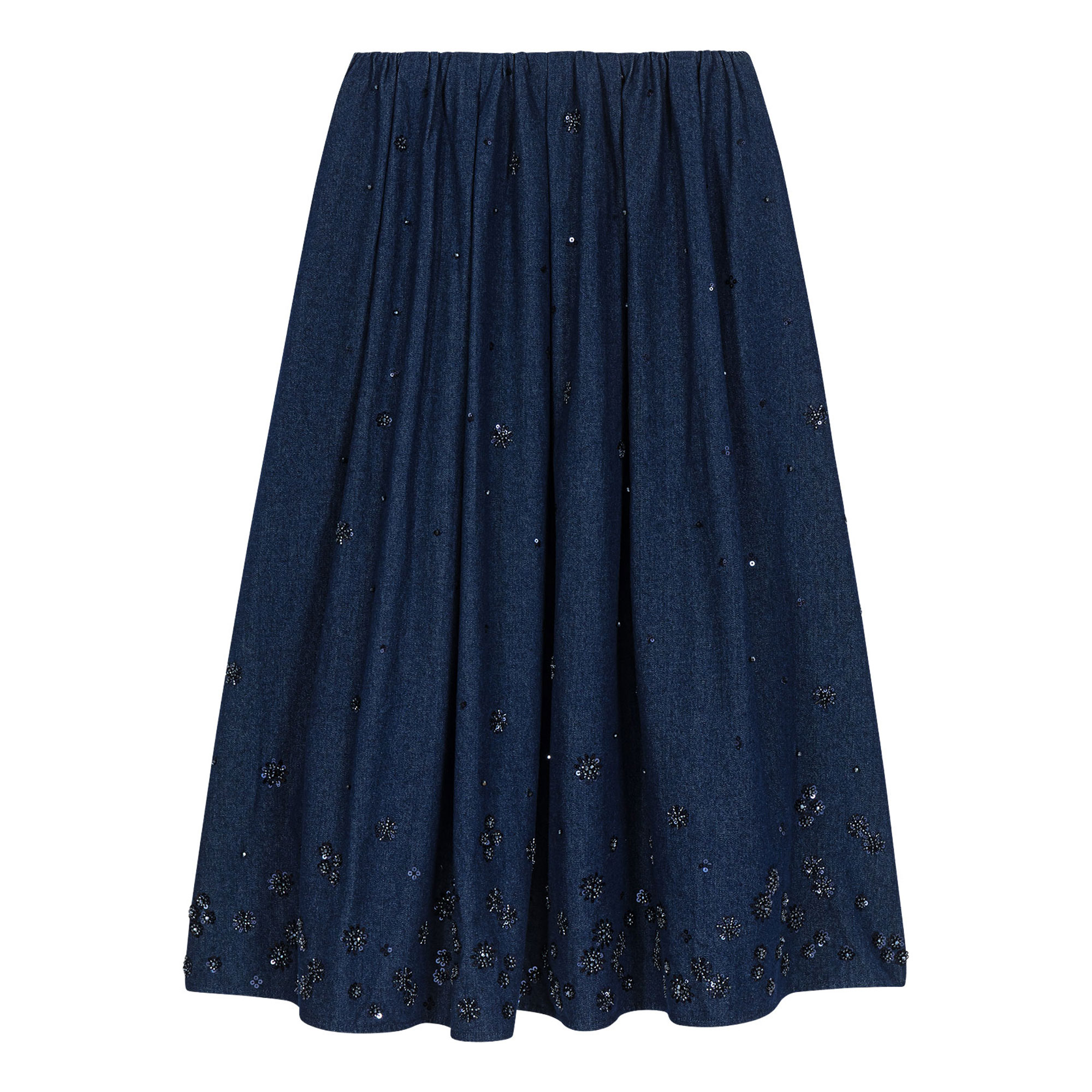 - Midi length, flared, denim fabric, tone-on-tone pearl and sequin embroidery, fully elasticated ruched waist, matte fabric
