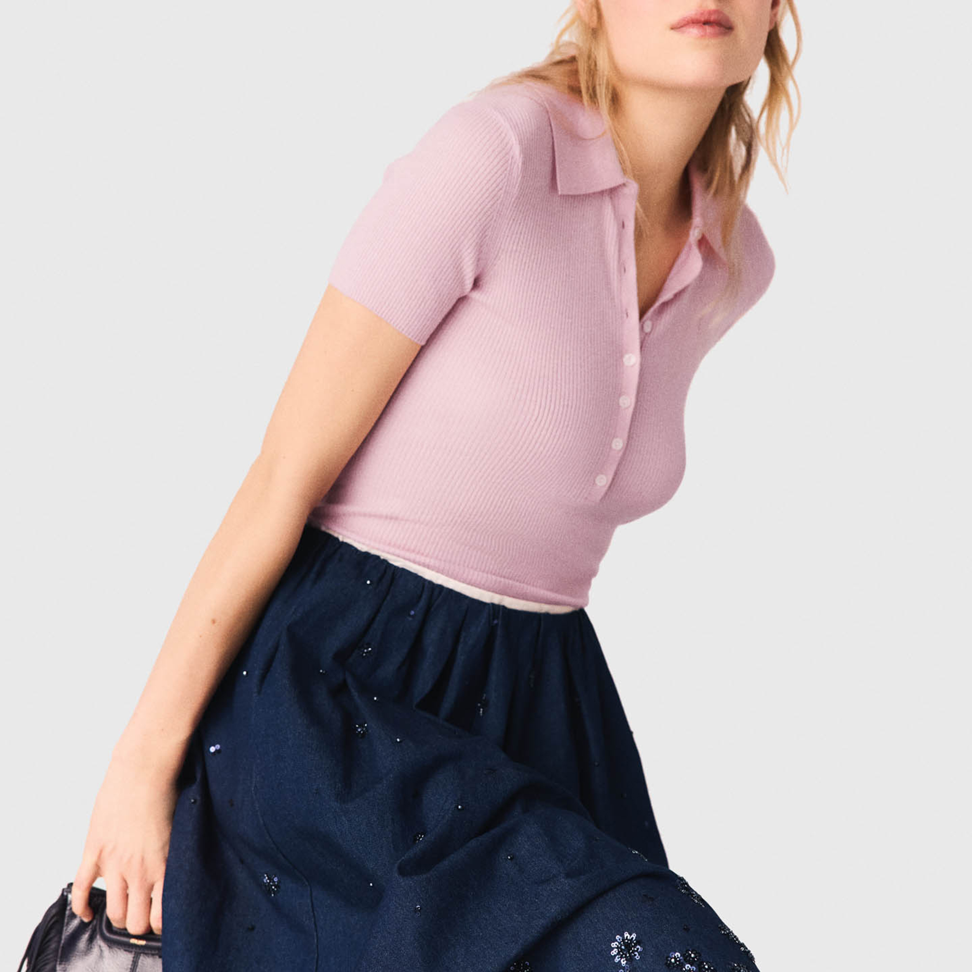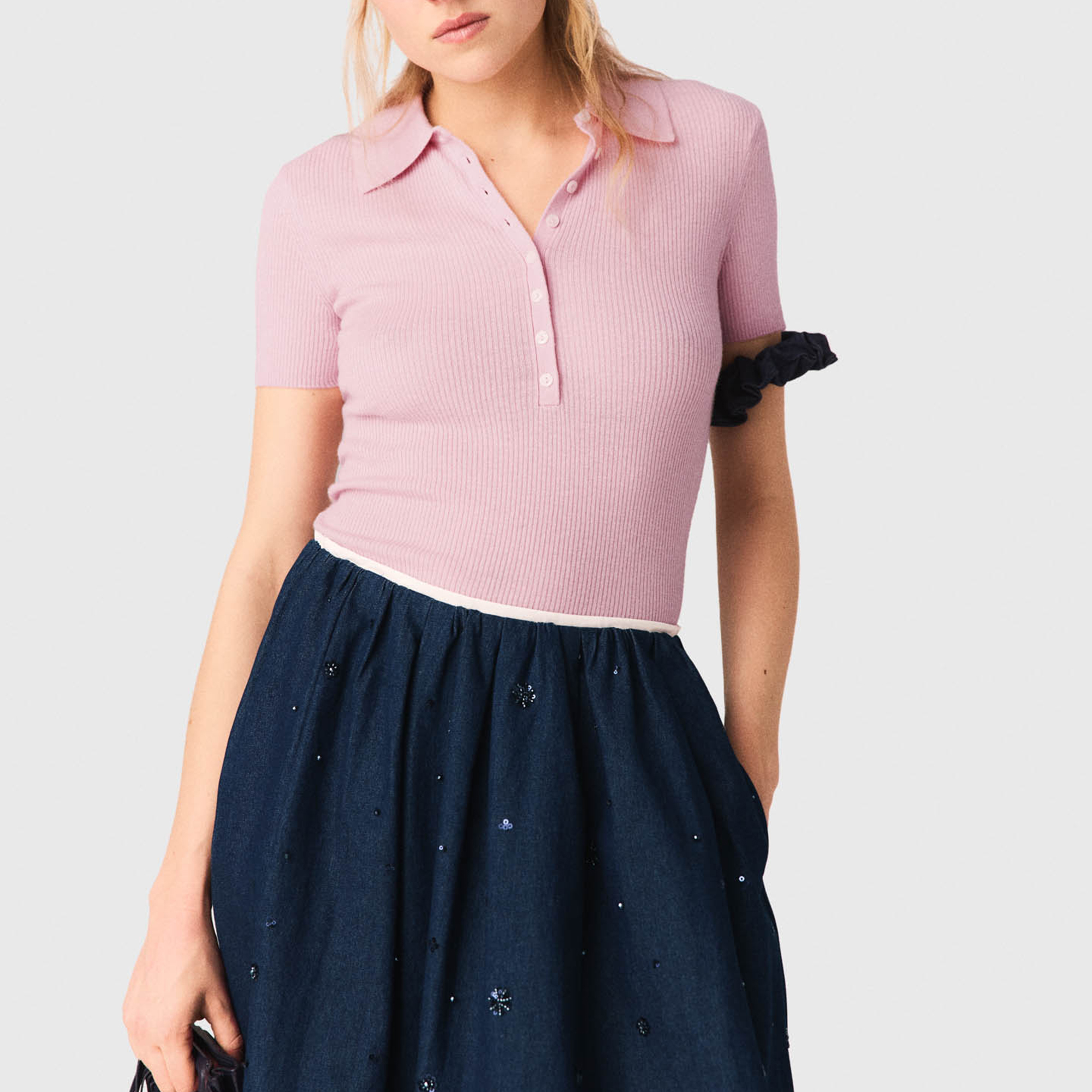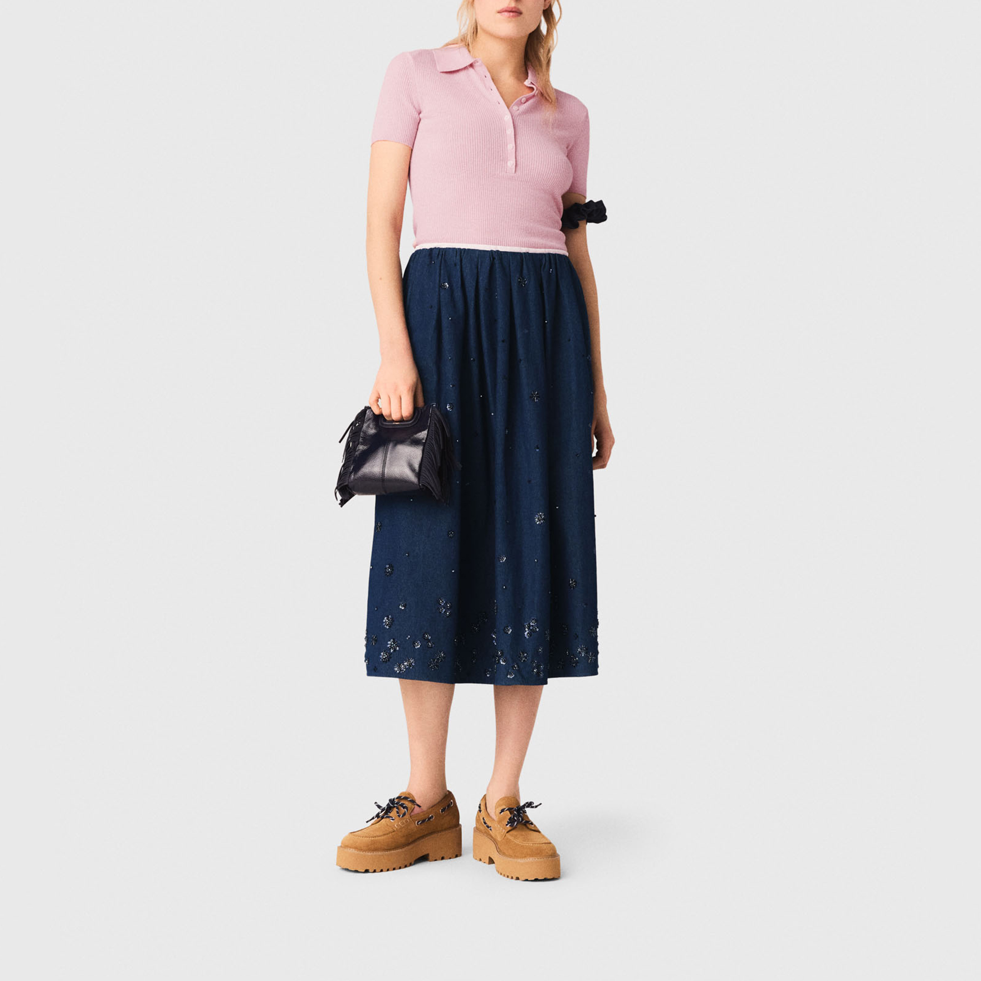 - Midi length, flared, denim fabric, tone-on-tone pearl and sequin embroidery, fully elasticated ruched waist, matte fabric
