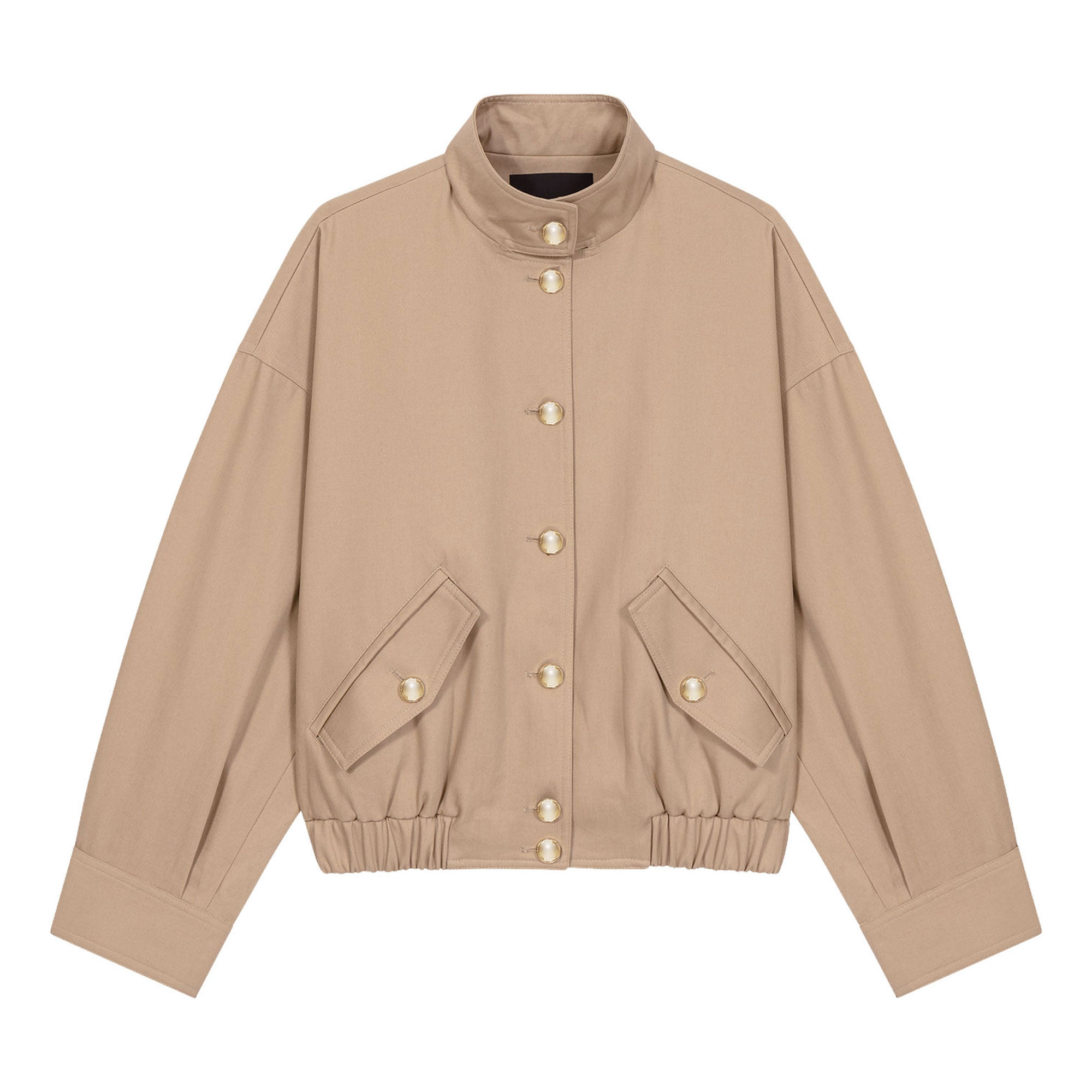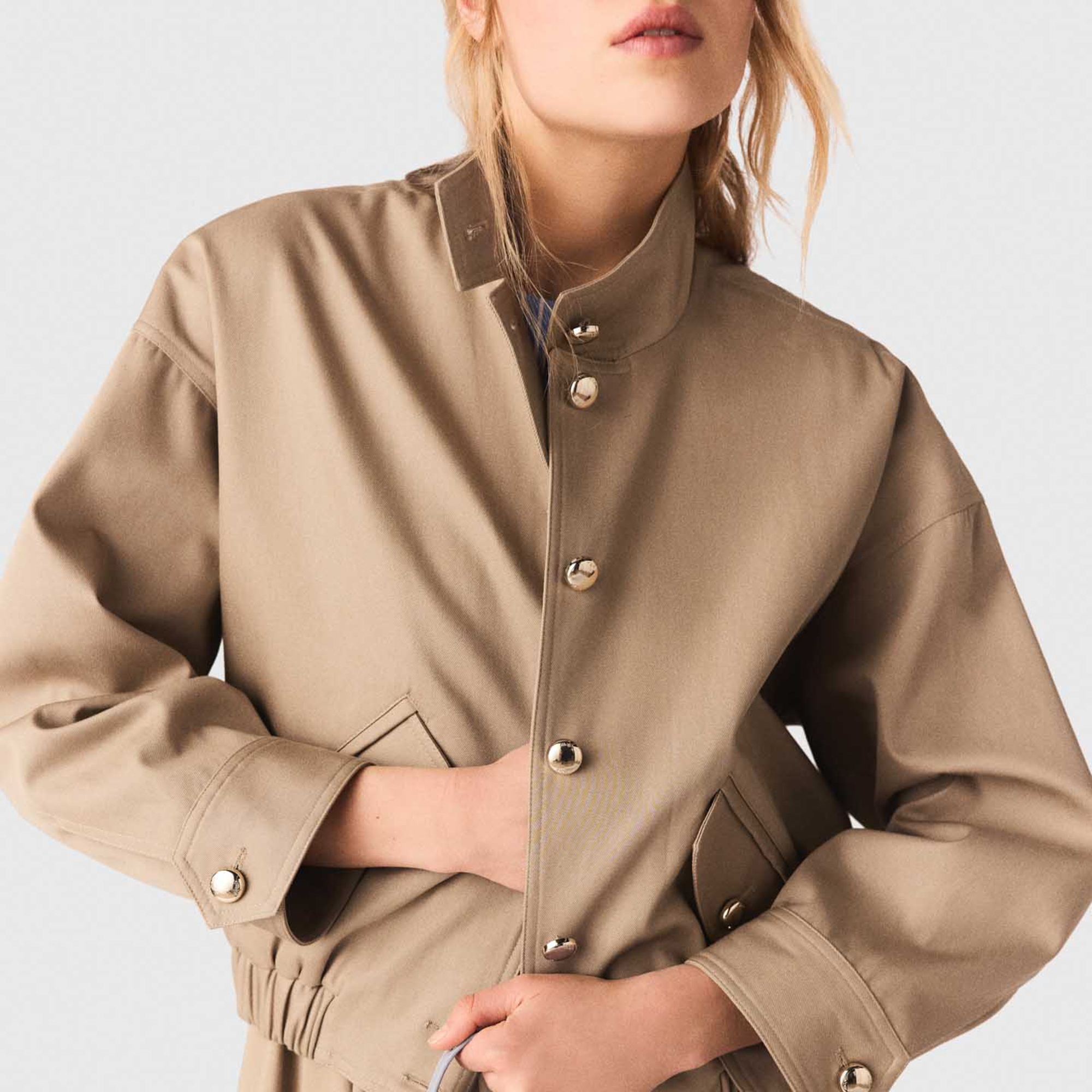 - Bomber style, round gold-tone buttons, elasticated waist, gathering, two front flap pockets, wide adjustable cuffs, high neckline