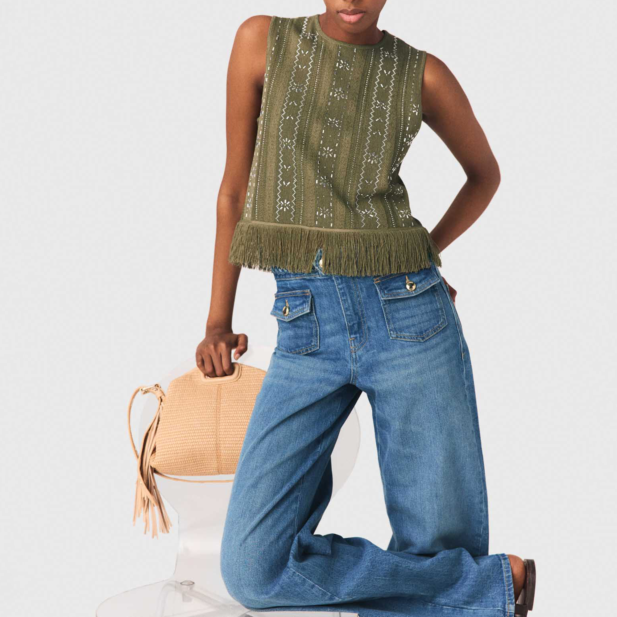 - Sleeveless, fringe trim, rhinestone embroidery, flower and star motifs, knitted chevron, jersey patterns, teardrop button fastening