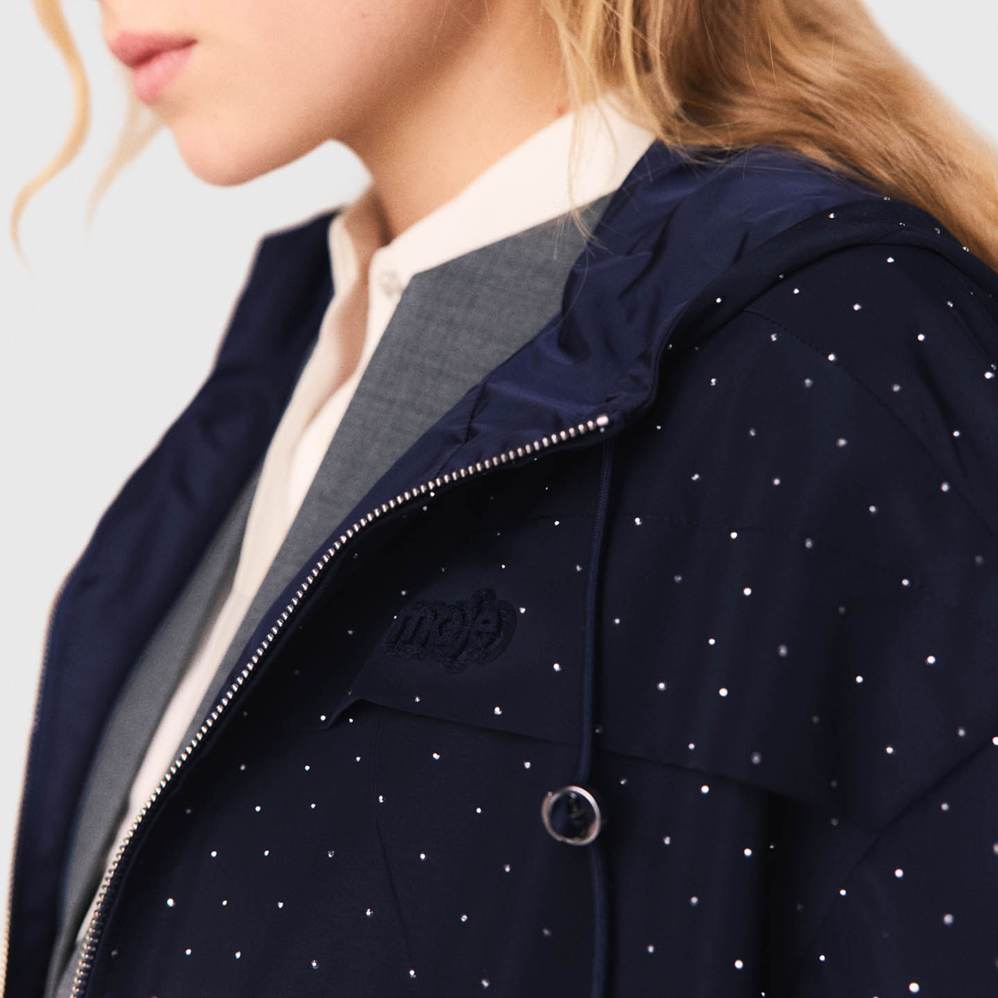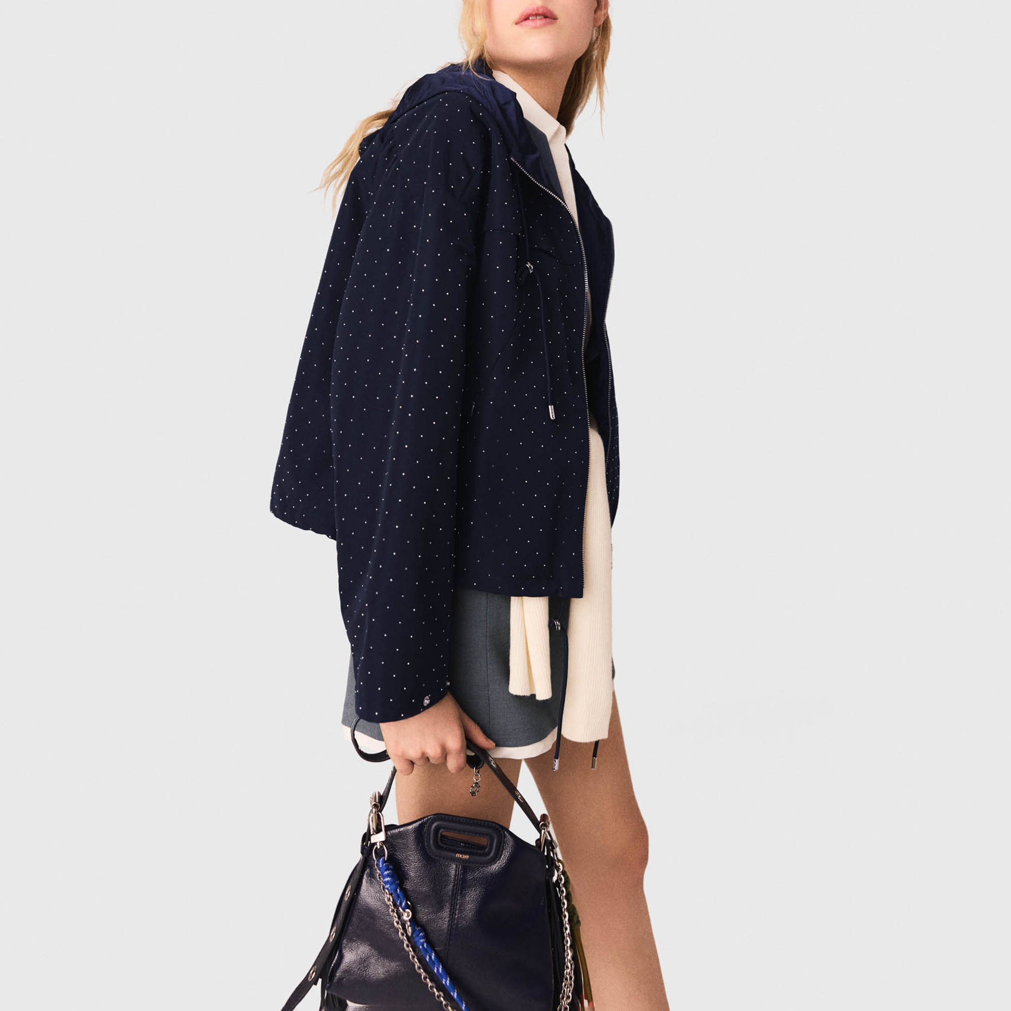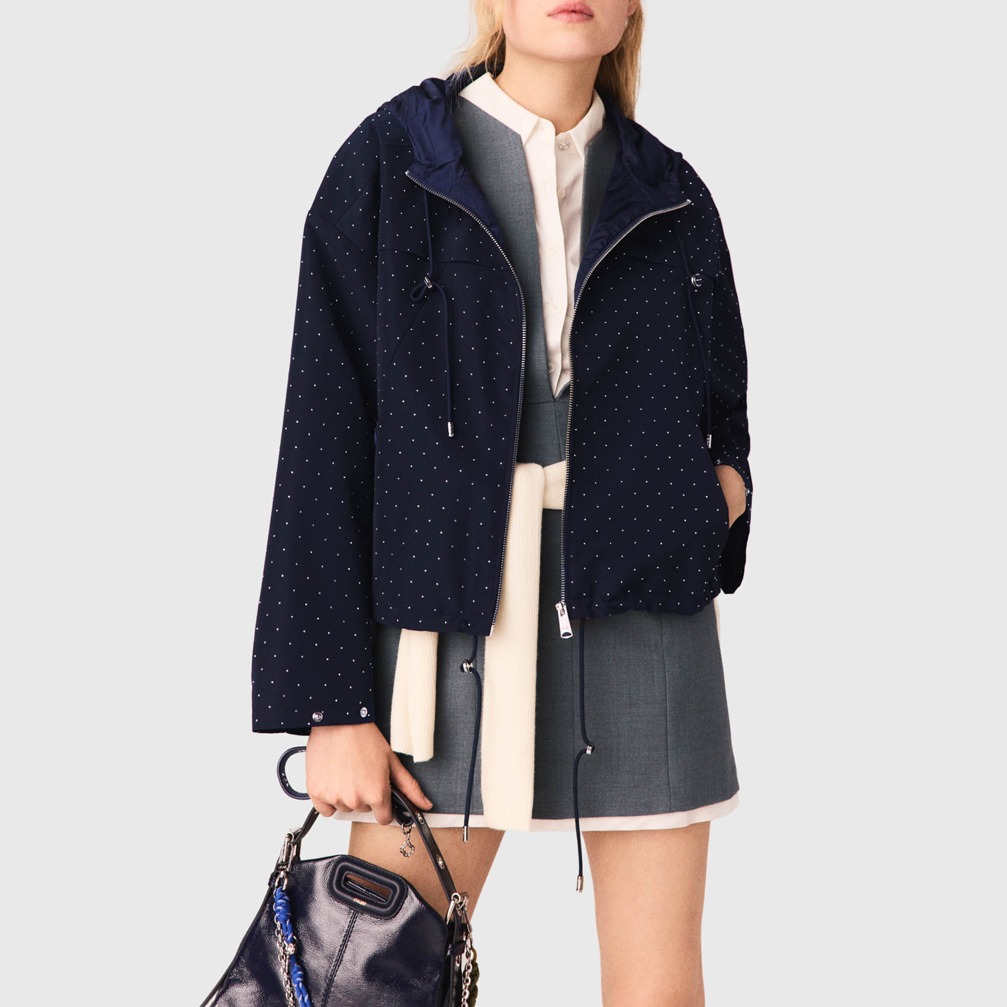 • Rhinestone embellishment, hood with adjustable drawstring, all-over silver-tone studs, central metal zip fastening, chest yoke, two discreet zipped pockets, adjustable drawstring hem