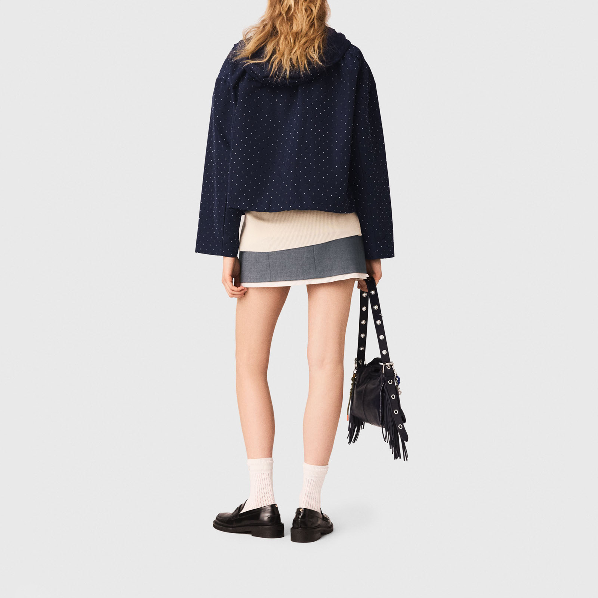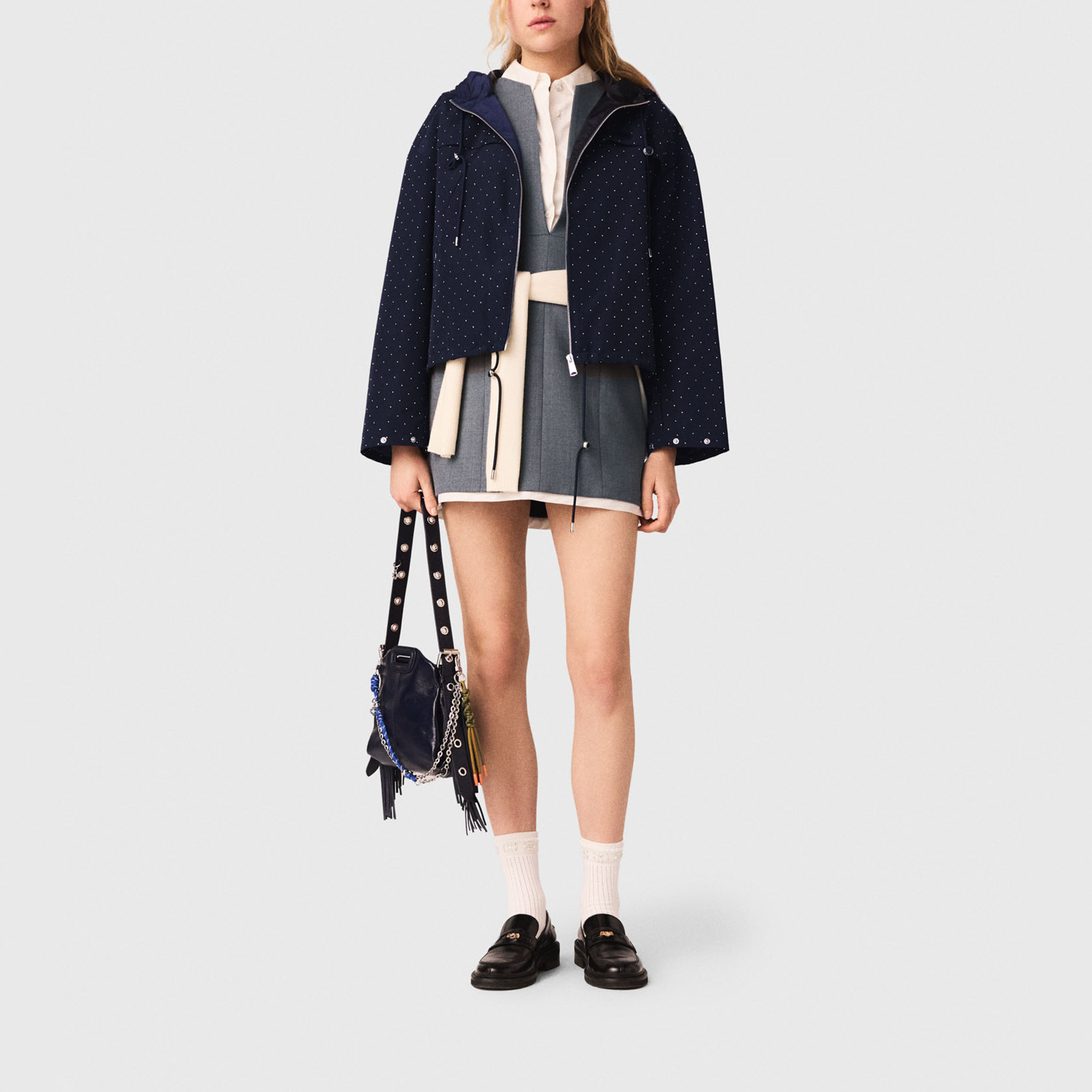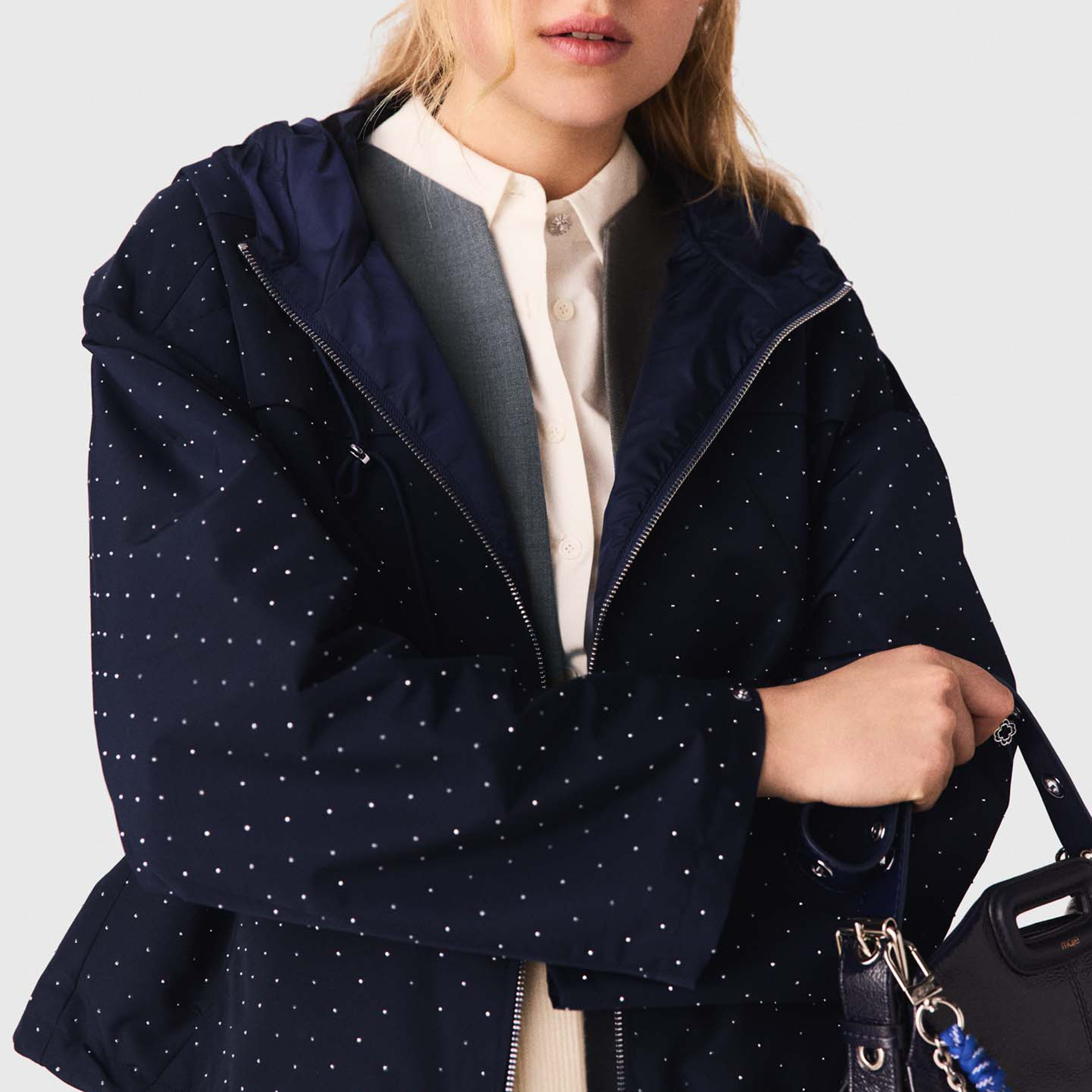 • Rhinestone embellishment, hood with adjustable drawstring, all-over silver-tone studs, central metal zip fastening, chest yoke, two discreet zipped pockets, adjustable drawstring hem