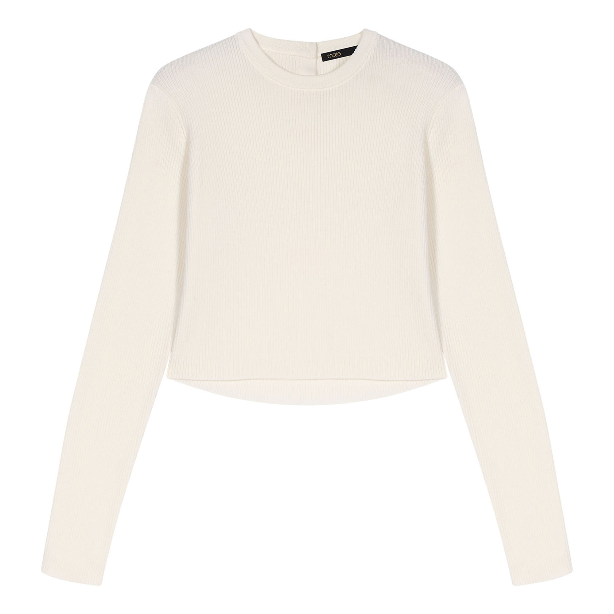 • Ribbed finish, knitted style, round crew neckline, teardrop fastenings, bow-shaped jewel buttons