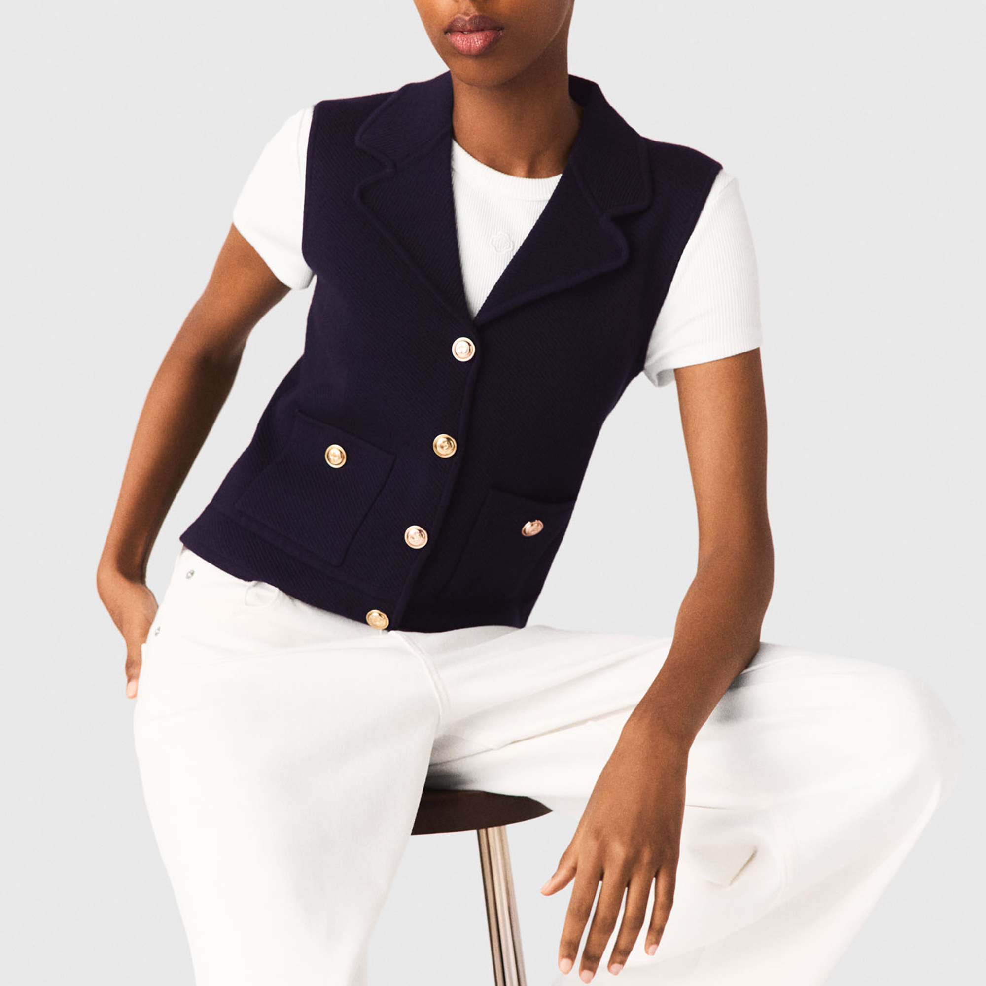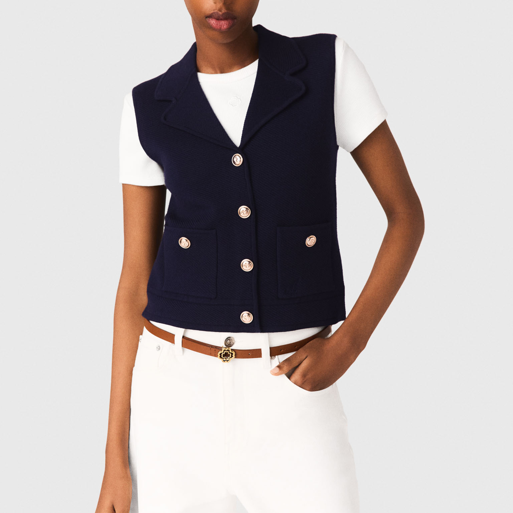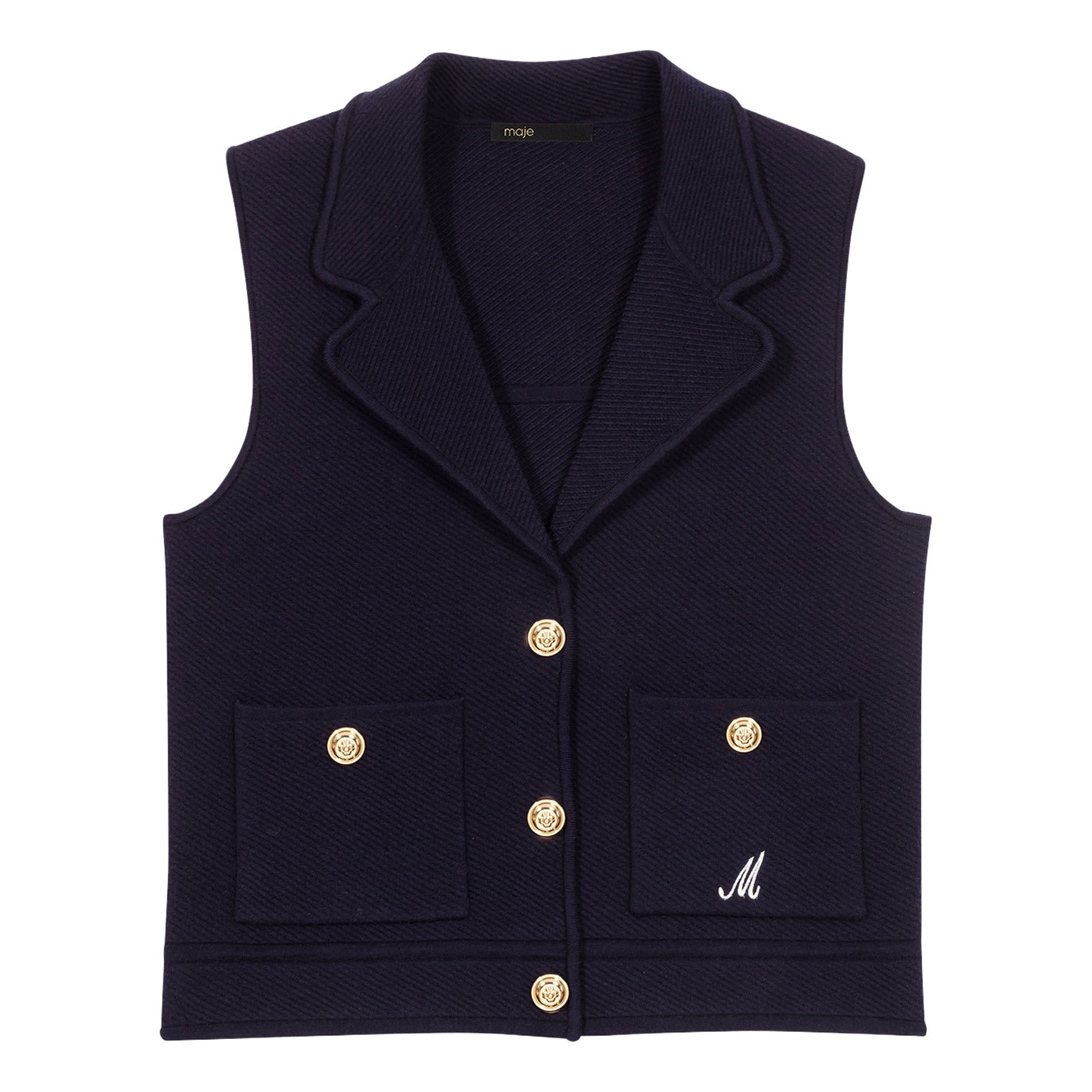 - Textured knit, waistcoat style, notched lapel collar, gold-tone buttons with crest logo, patch pockets, gold-tone buttons, tone-on-tone signature 'M' embroidery, raised piped trims, sleeveless, textured finish