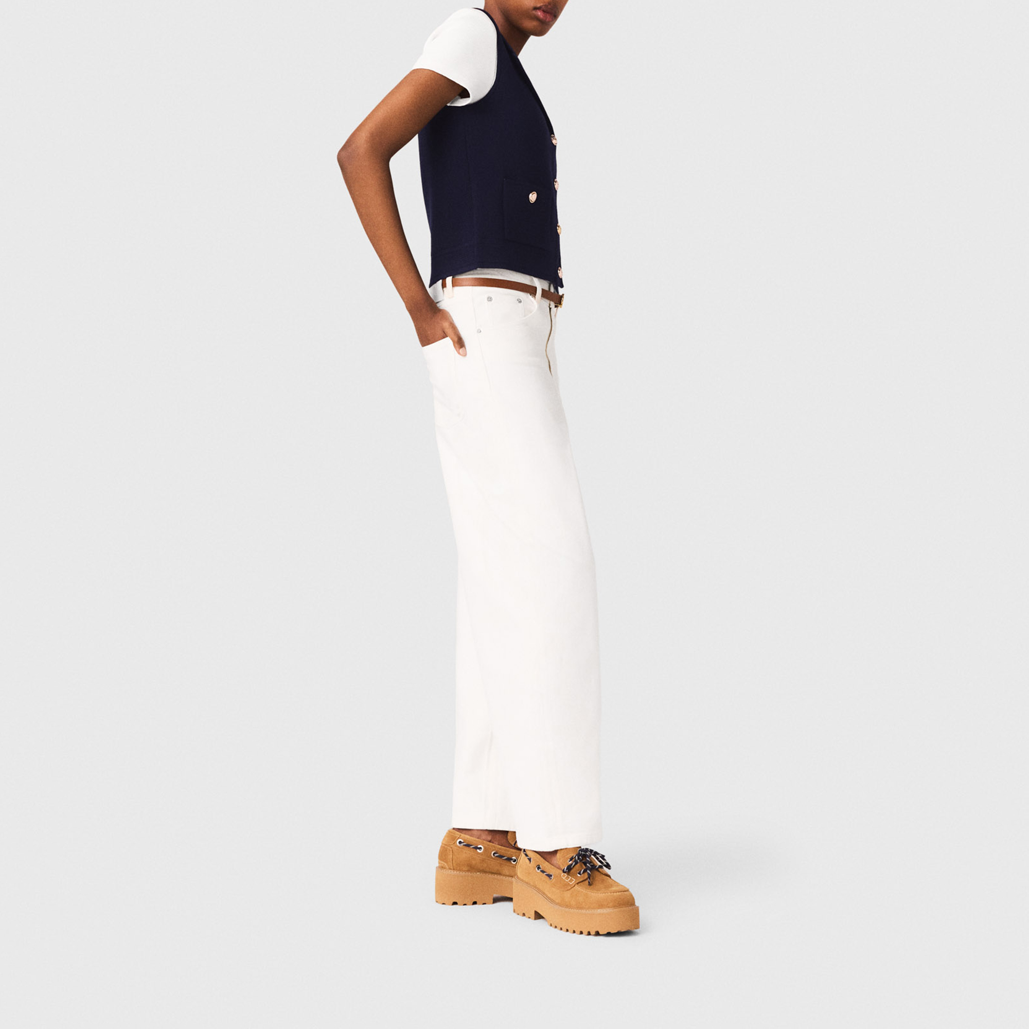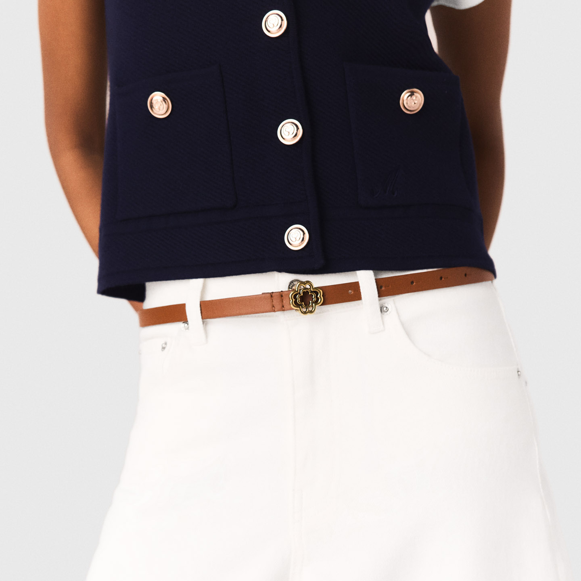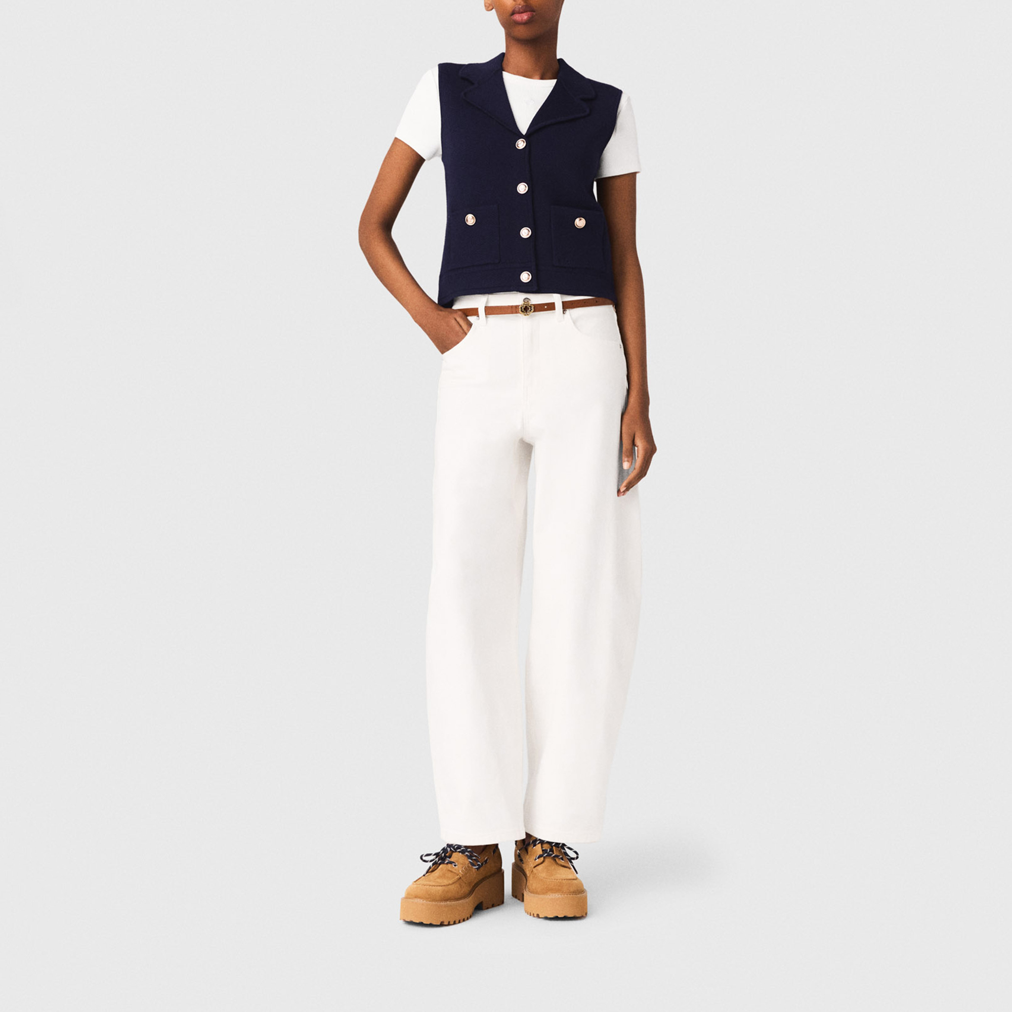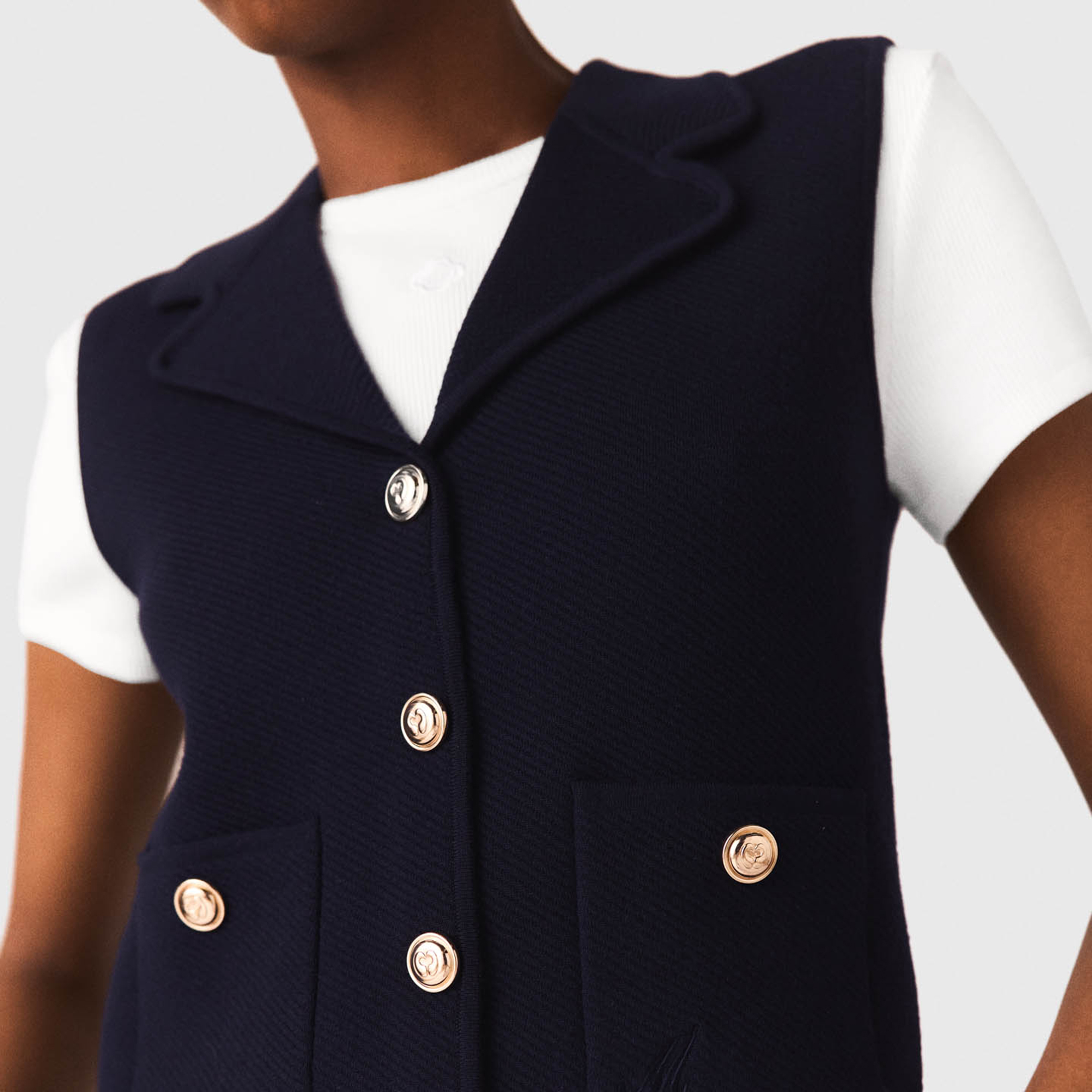 - Textured knit, waistcoat style, notched lapel collar, gold-tone buttons with crest logo, patch pockets, gold-tone buttons, tone-on-tone signature 'M' embroidery, raised piped trims, sleeveless, textured finish