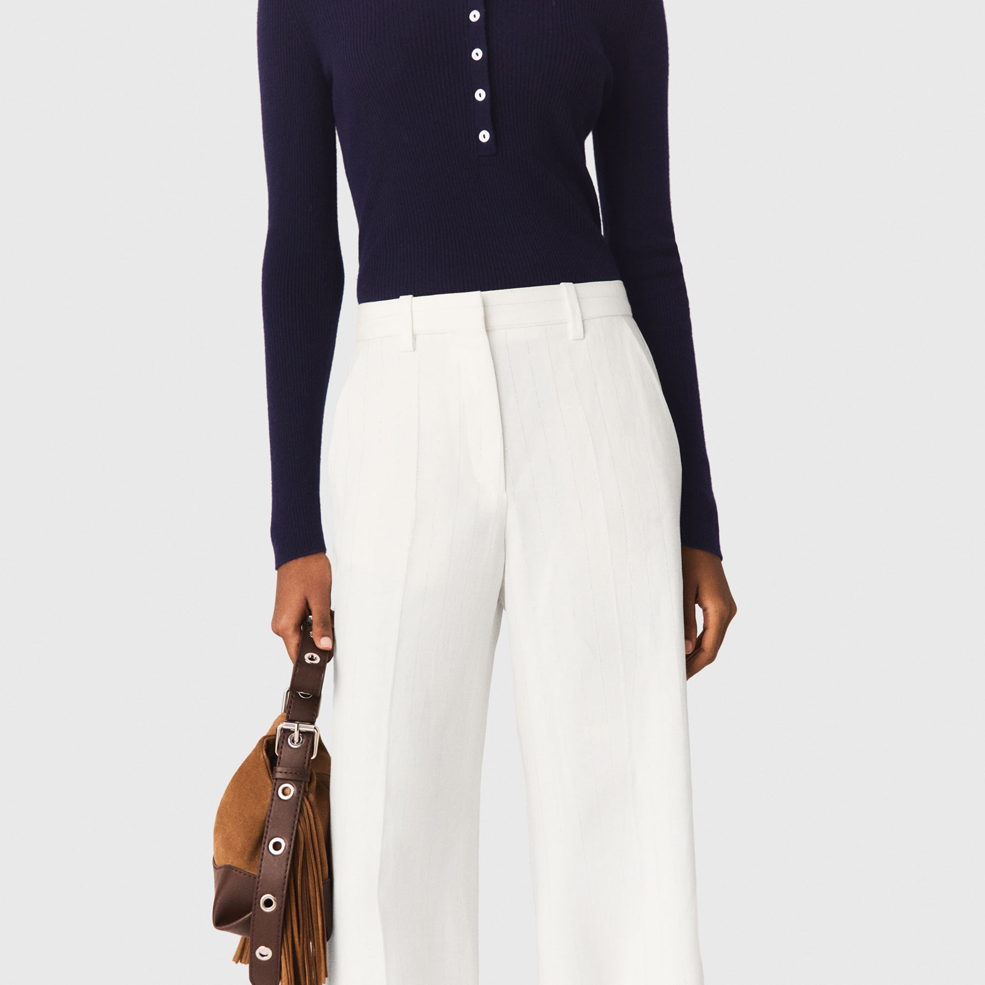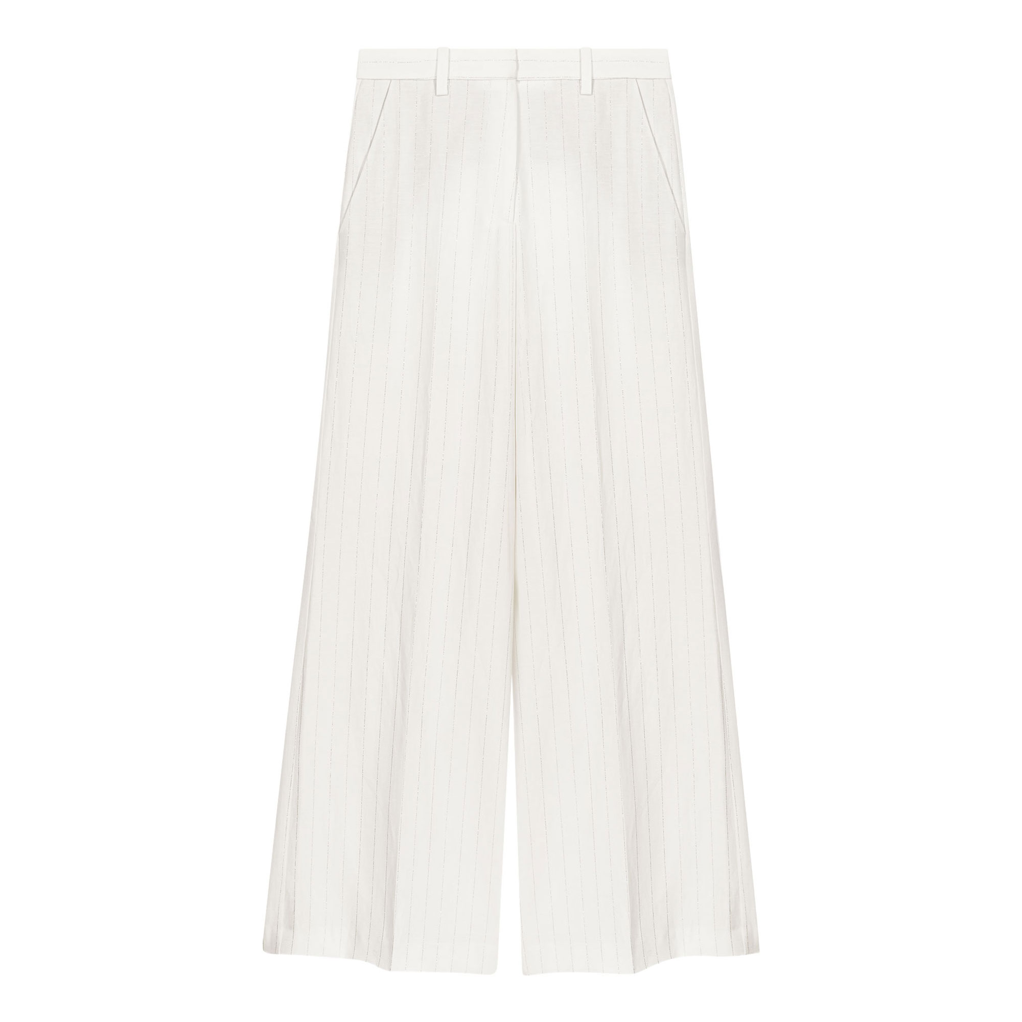 - Wide-leg palazzo cut, stripe pattern, front pintucks, natural texture, Italian side pockets, back welt pocket