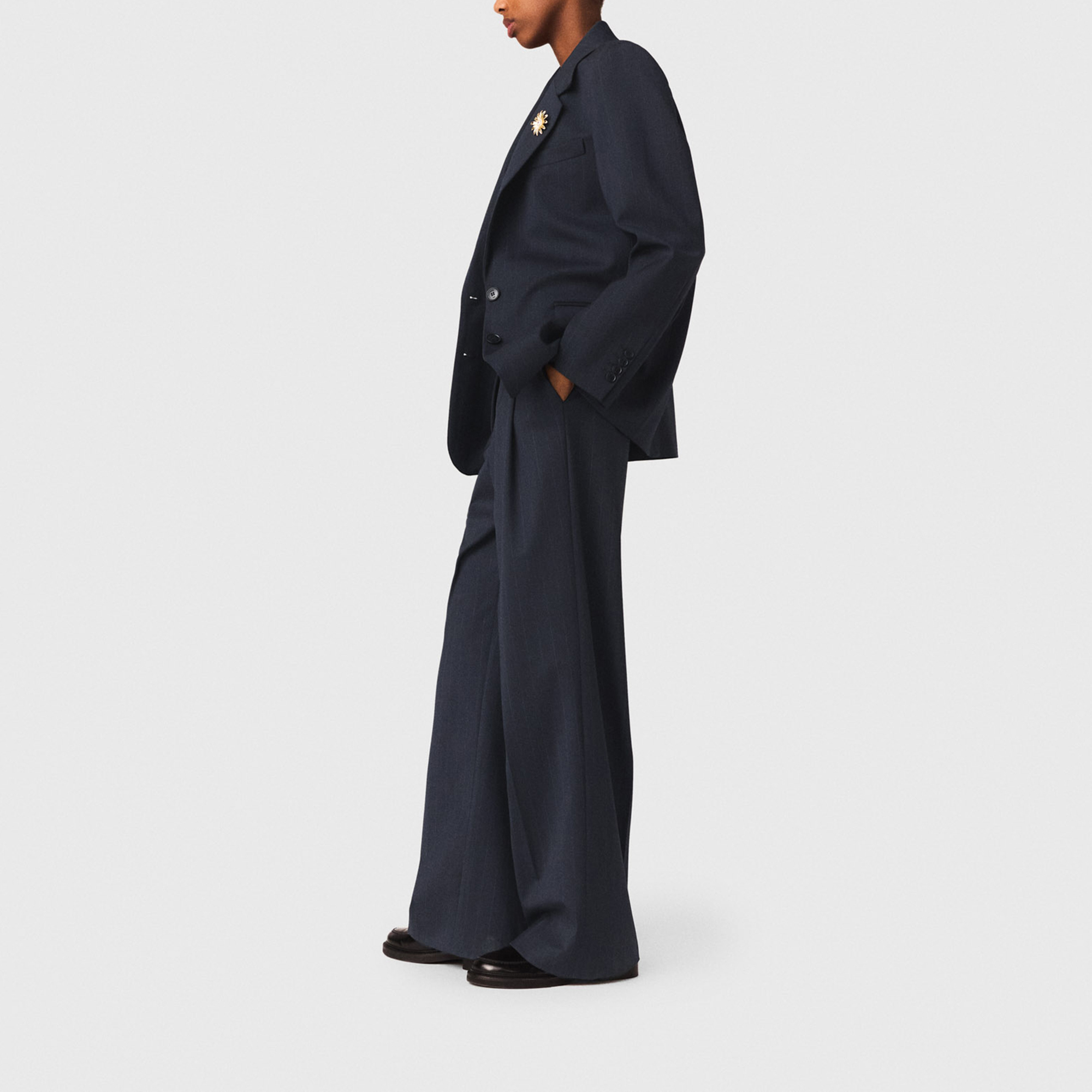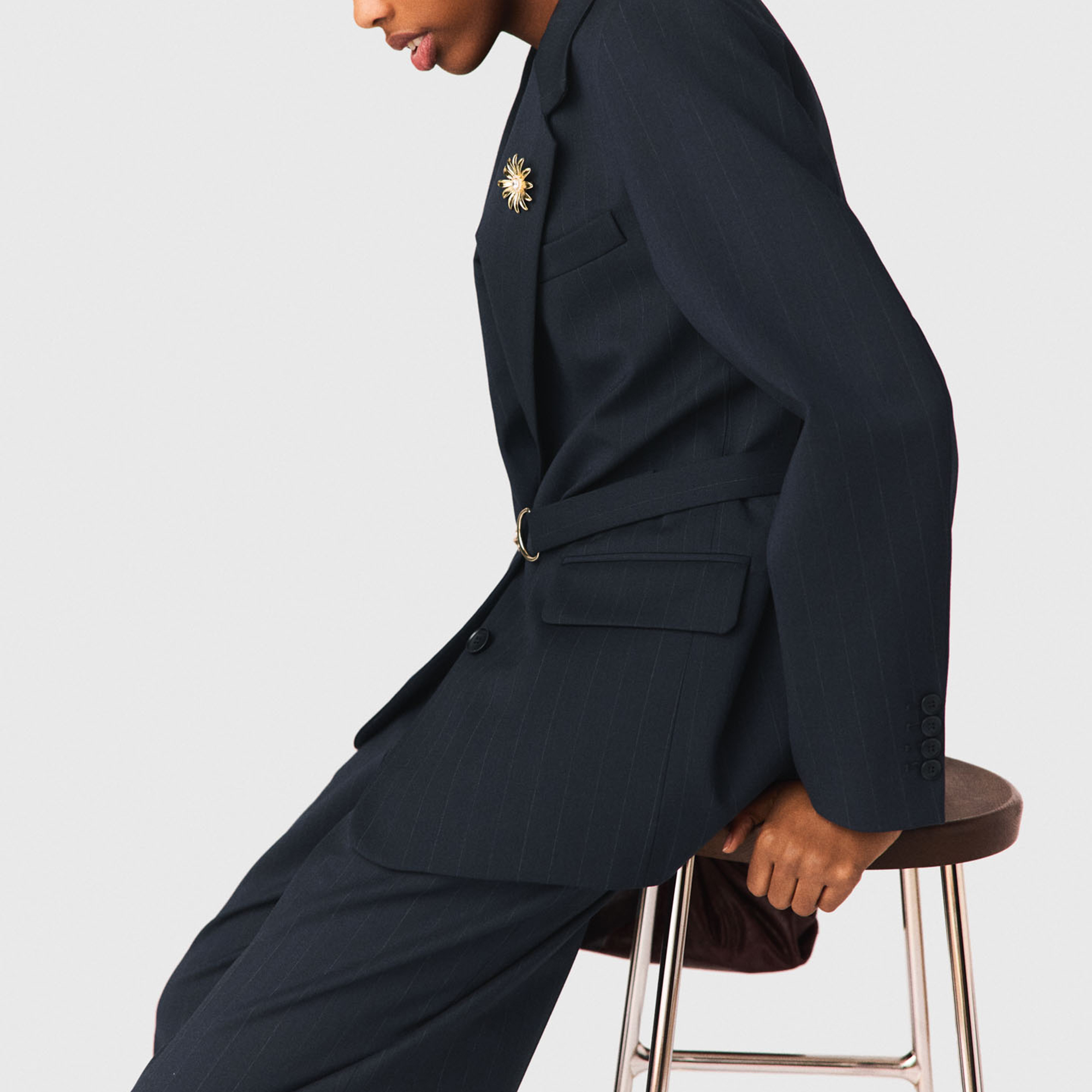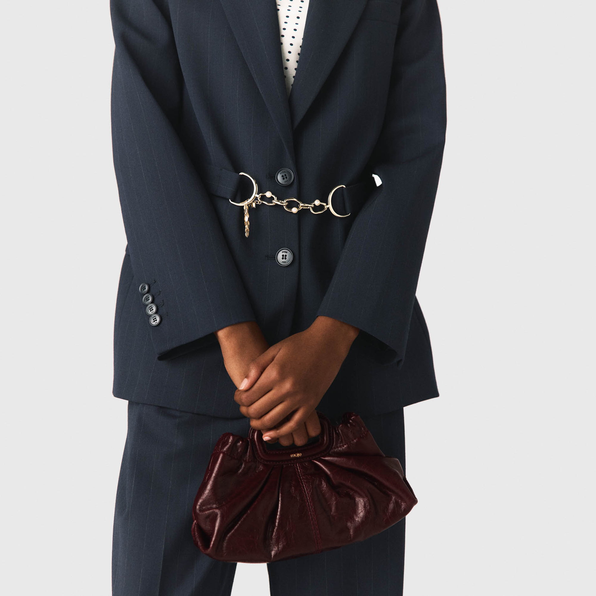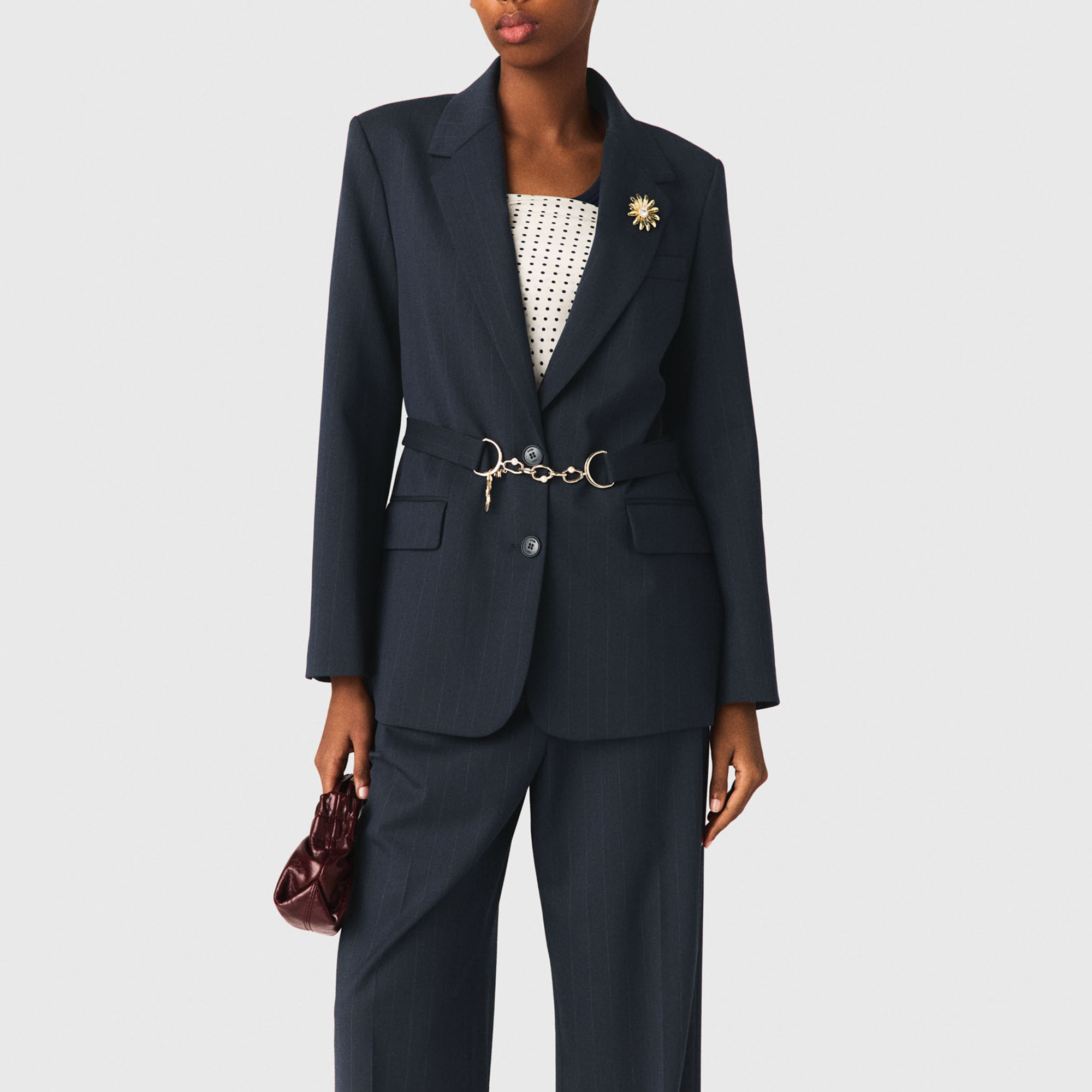 • Pinstripe design, button fastenings, removable waist belt, gold-tone chain and charm details, flap pockets, welt chest pocket, logo jacquard lining