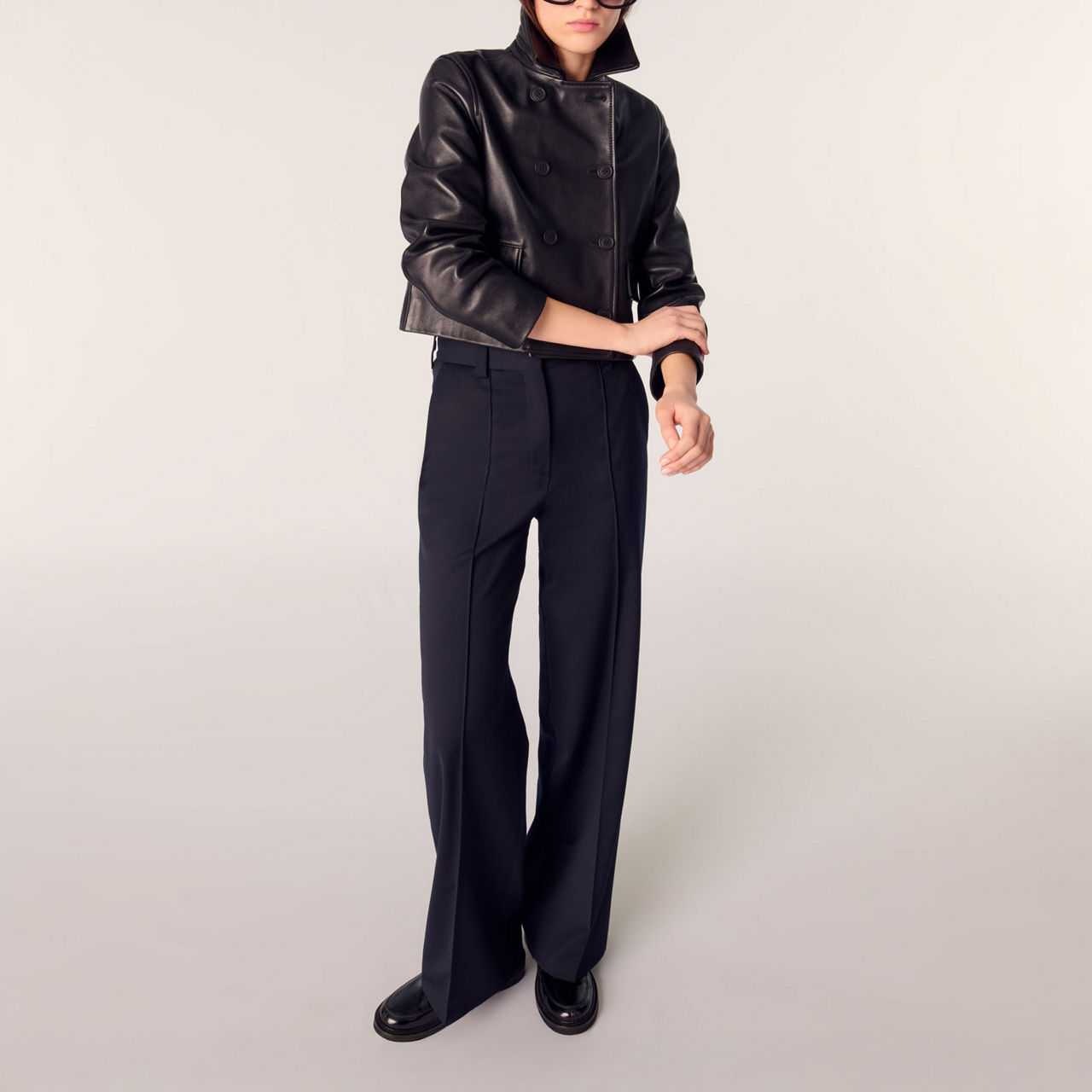 - Pintucks down the legs, 2 back welt pockets with buttons, 2 side pockets, zip and hook-and-eye fastening and belt loops