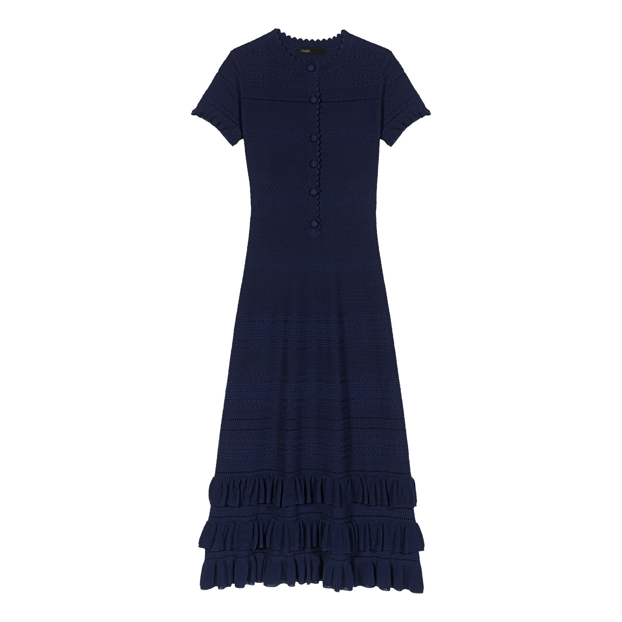 - Knitted, midi length, ruffle details, textured pointelle knit, layered ruffle hem, tone-on-tone button placket, scalloped edges on the collar and sleeves, openwork pattern