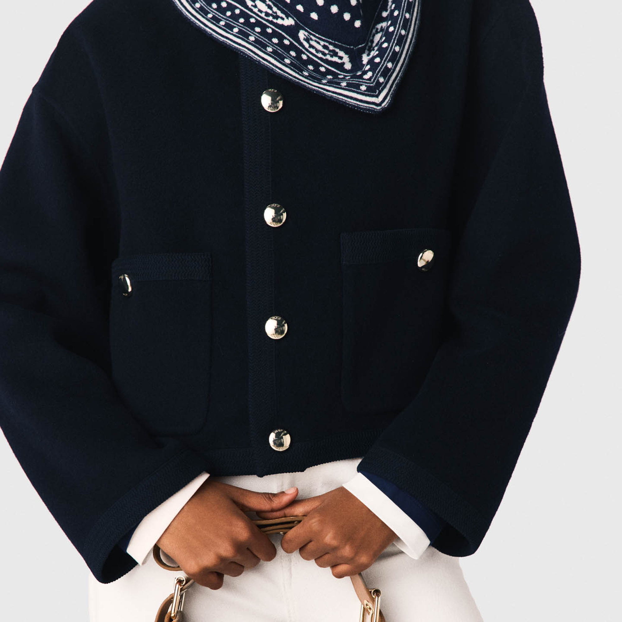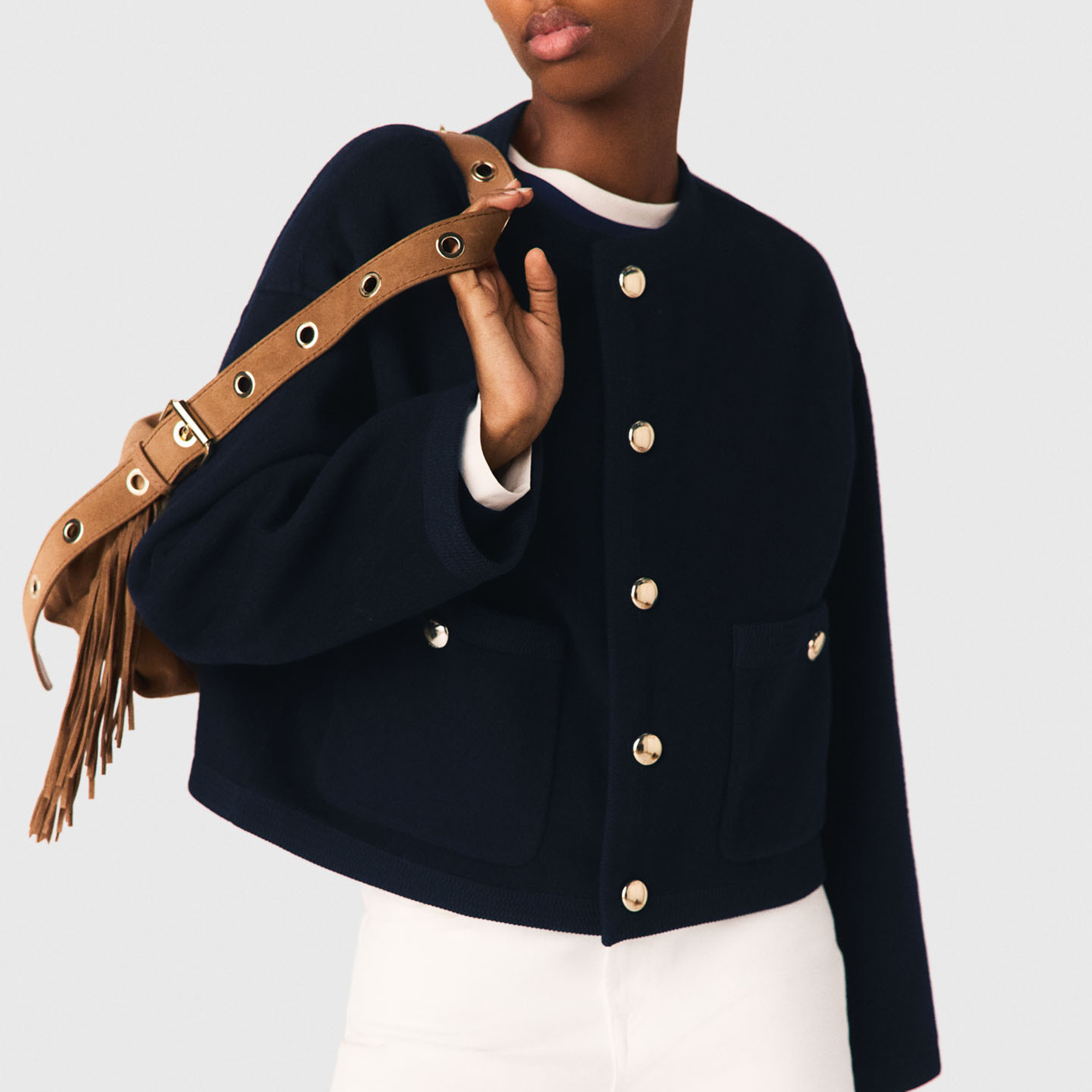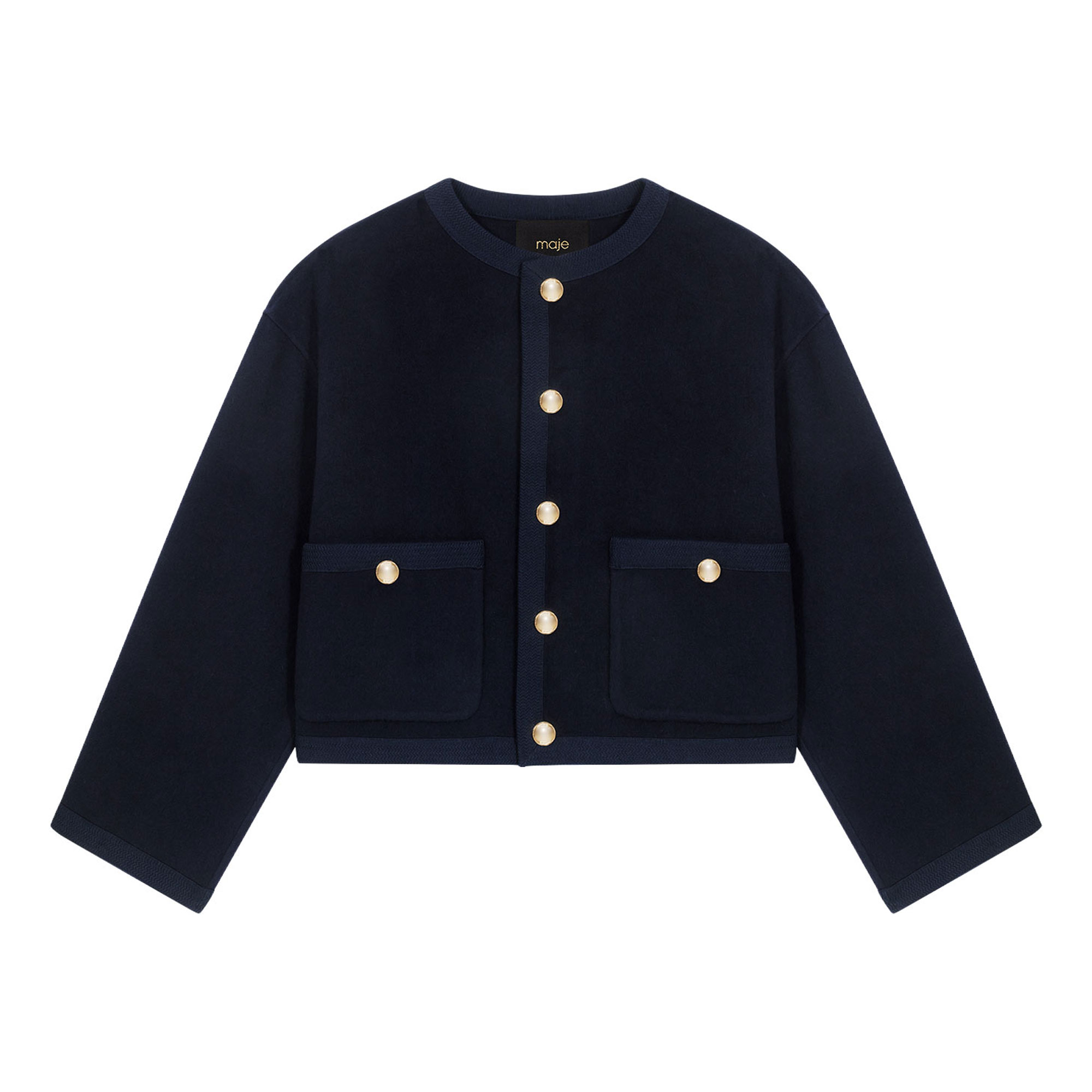 • Short, straight-cut, double-faced wool, braided trim, dropped shoulders, round gold-tone metal buttons, two patch pockets with chevron finish