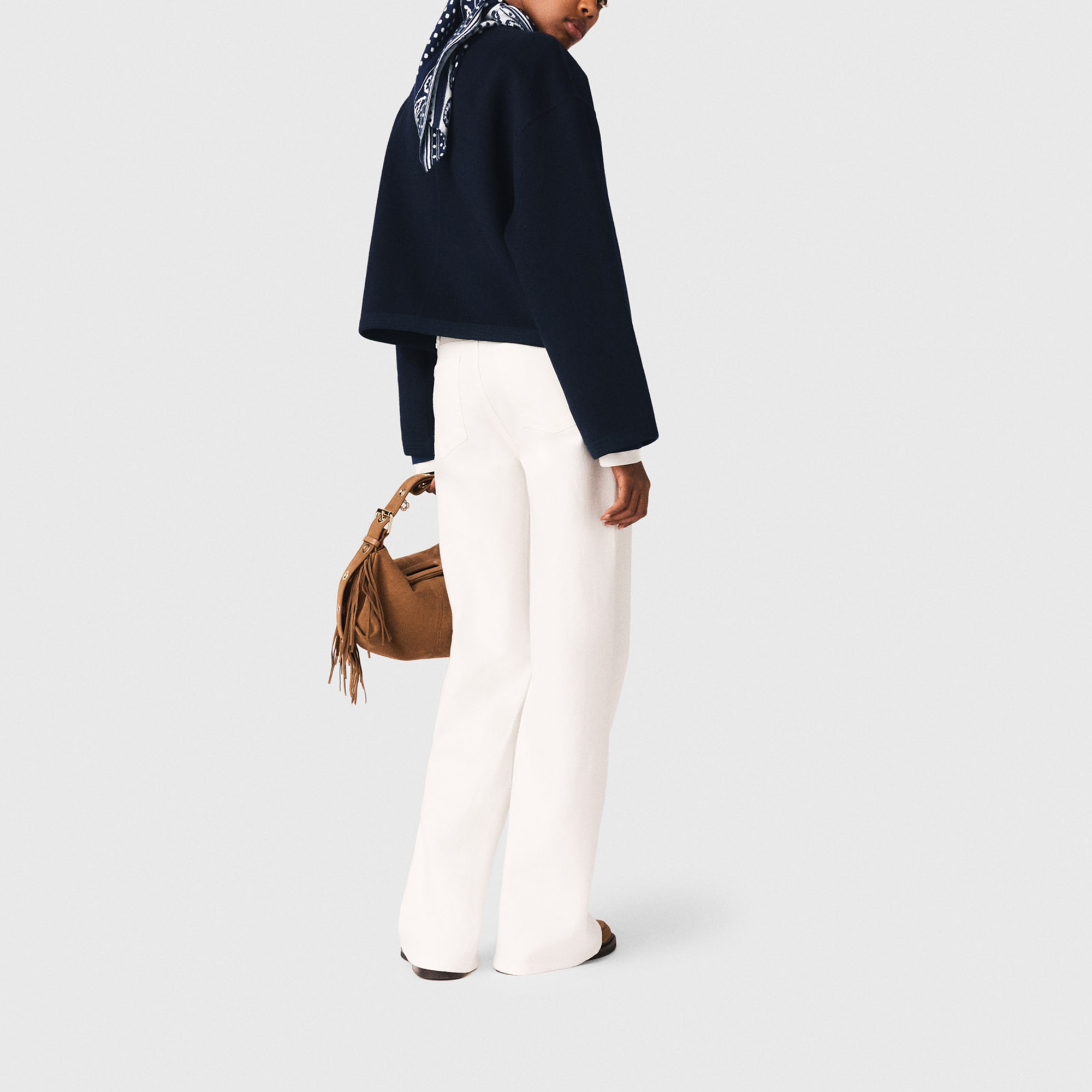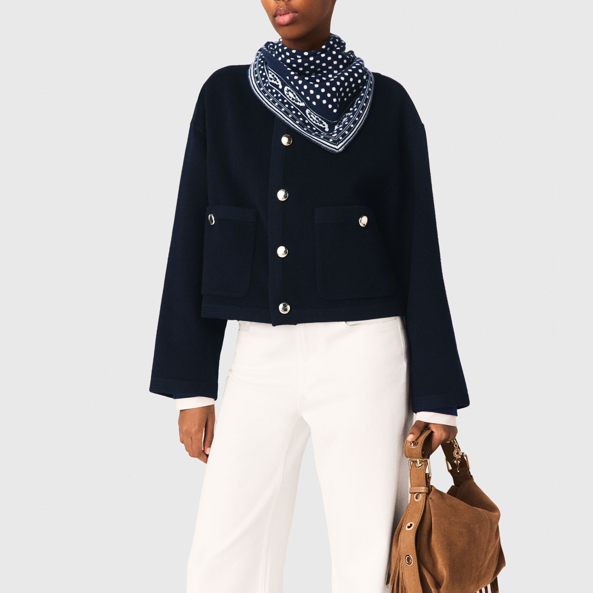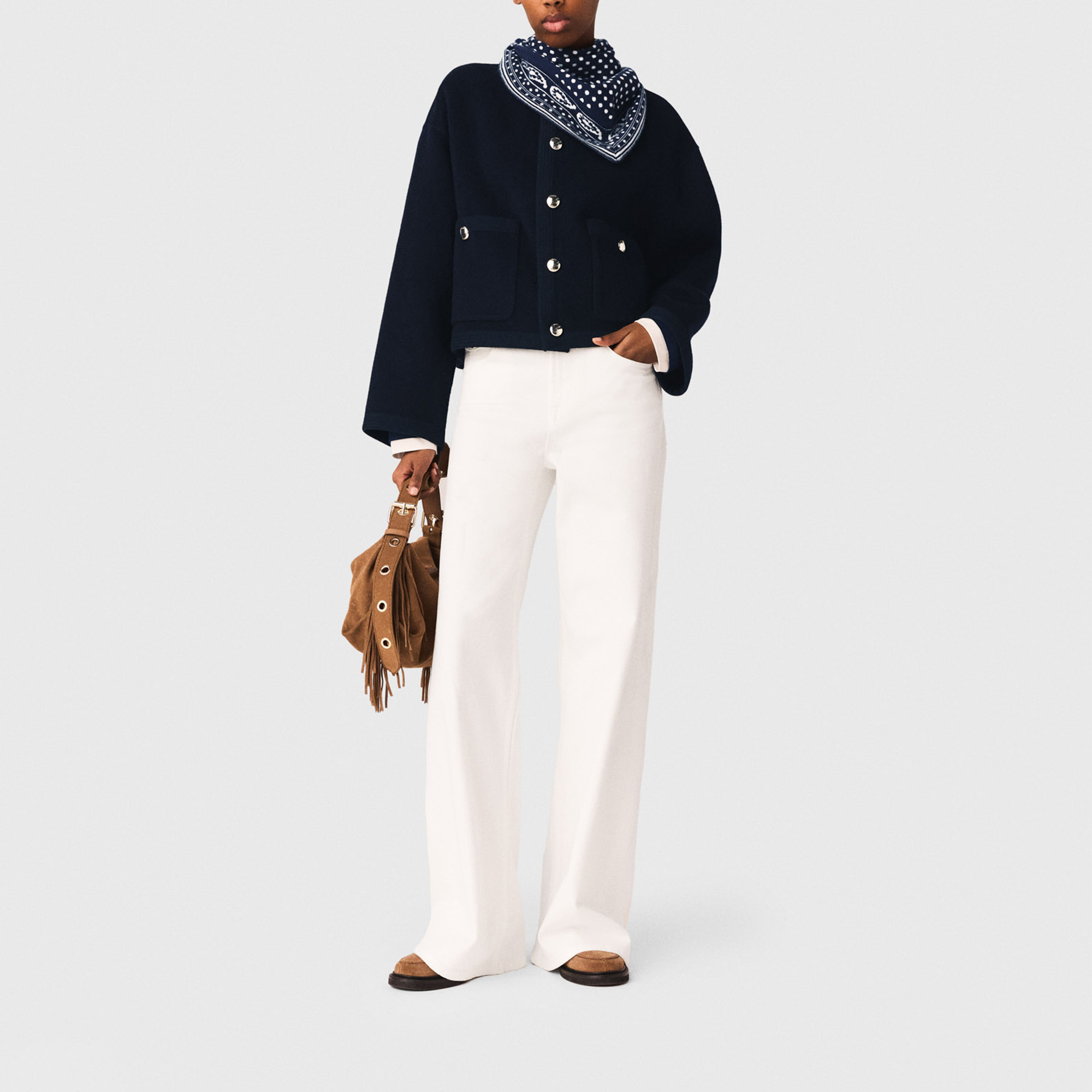 • Short, straight-cut, double-faced wool, braided trim, dropped shoulders, round gold-tone metal buttons, two patch pockets with chevron finish