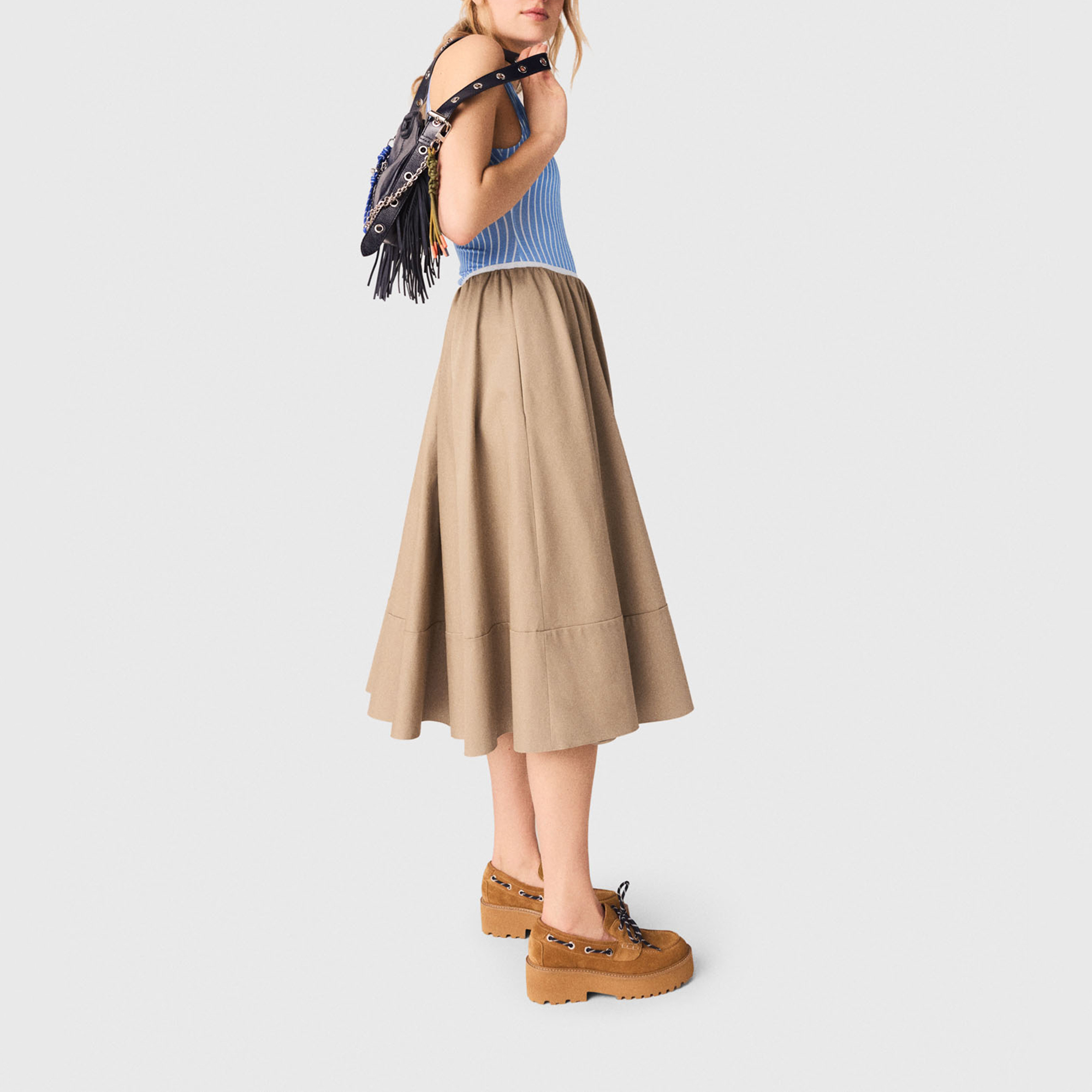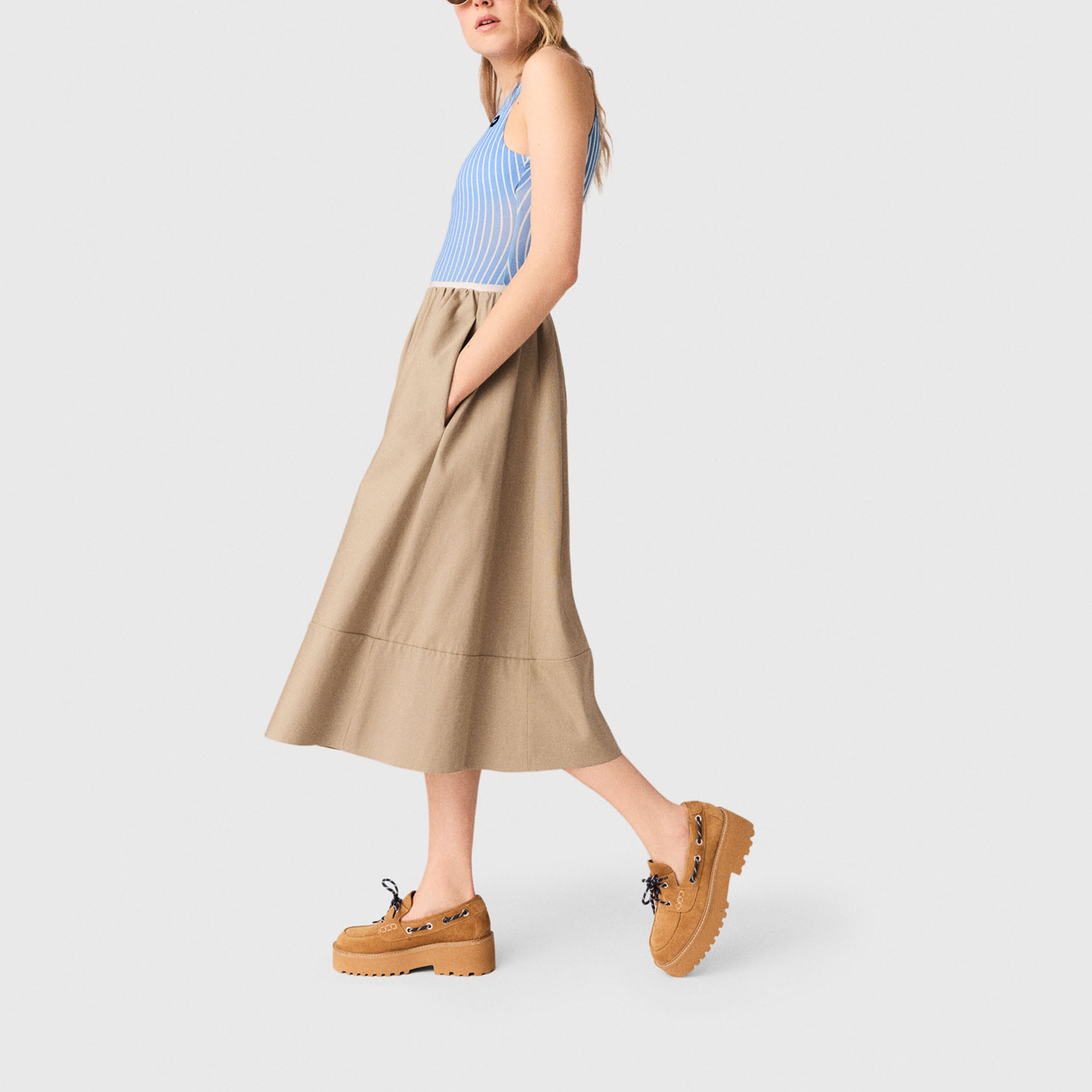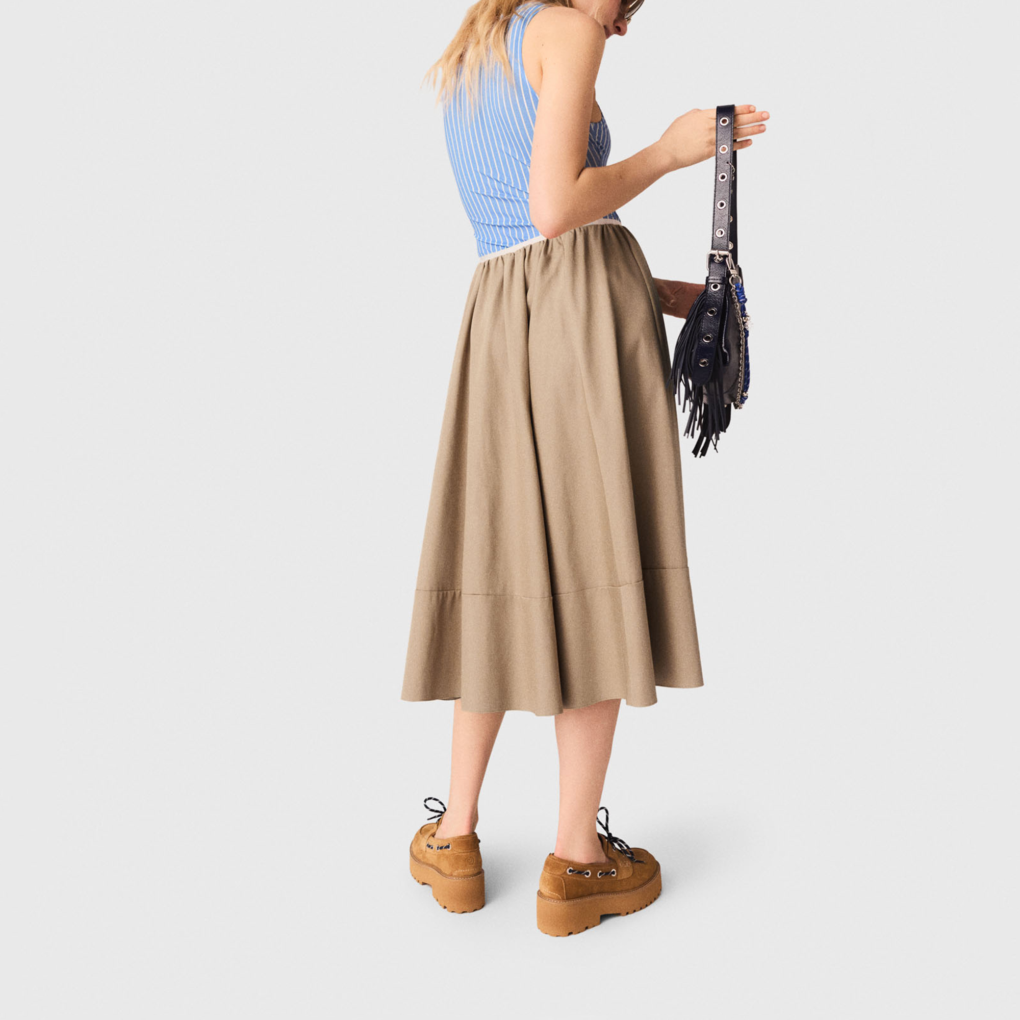 - Midi length, flared cut, elasticated waist, contrasting trim, wide hem, side pockets