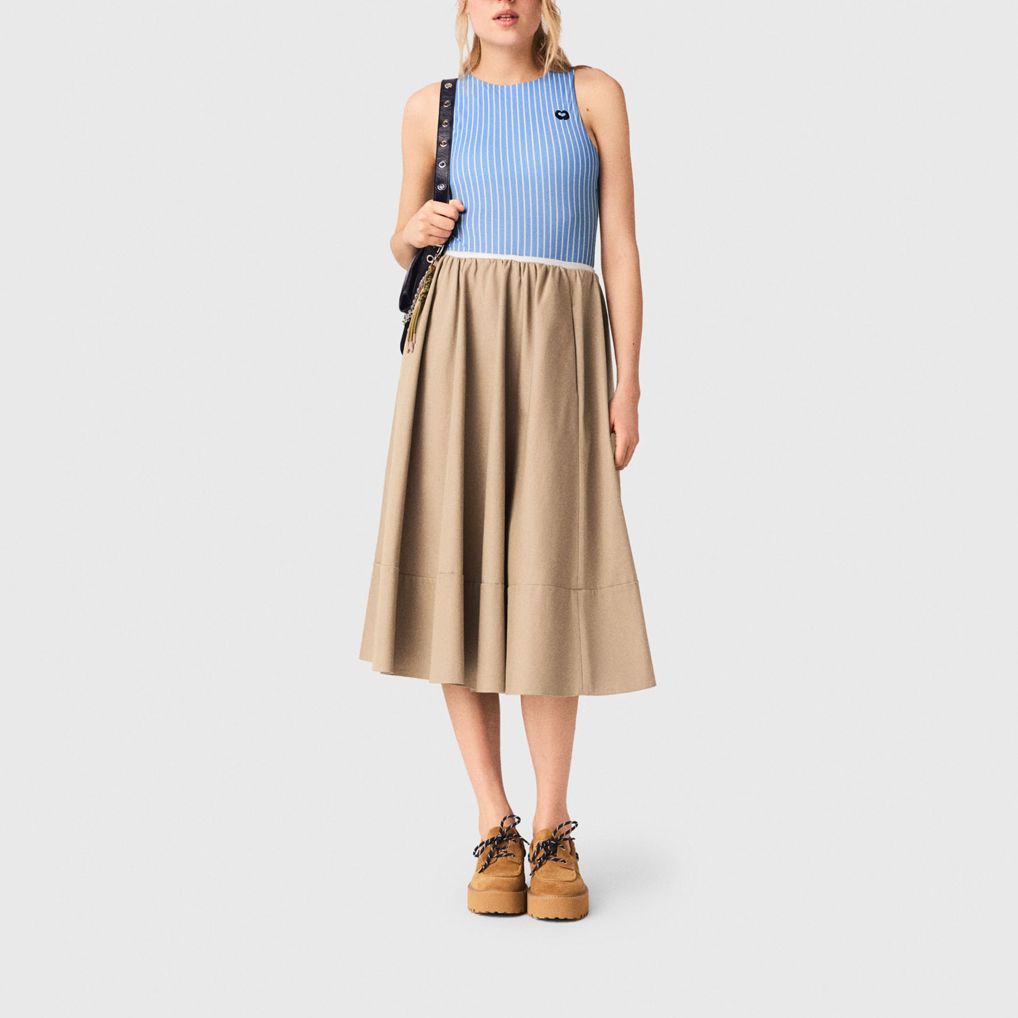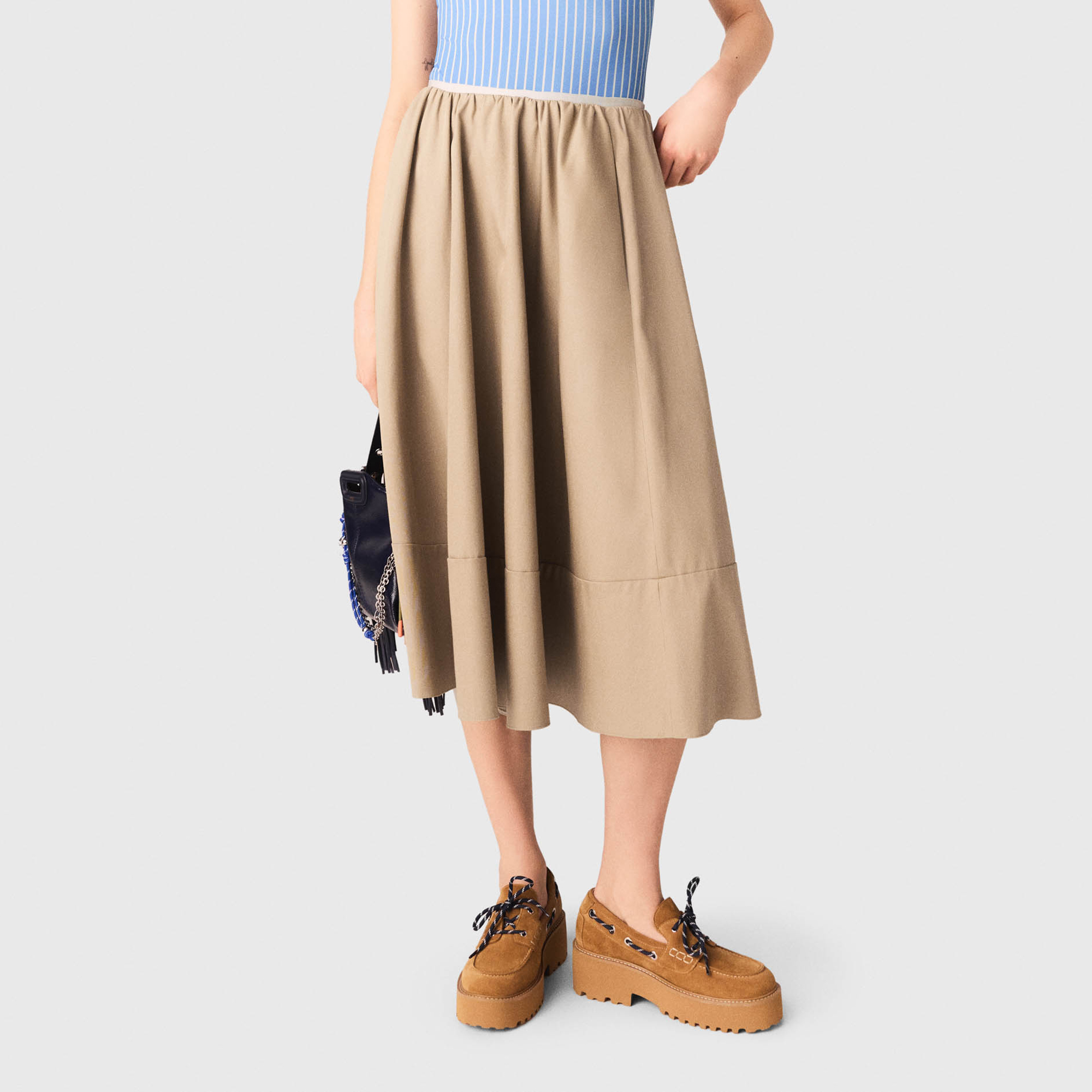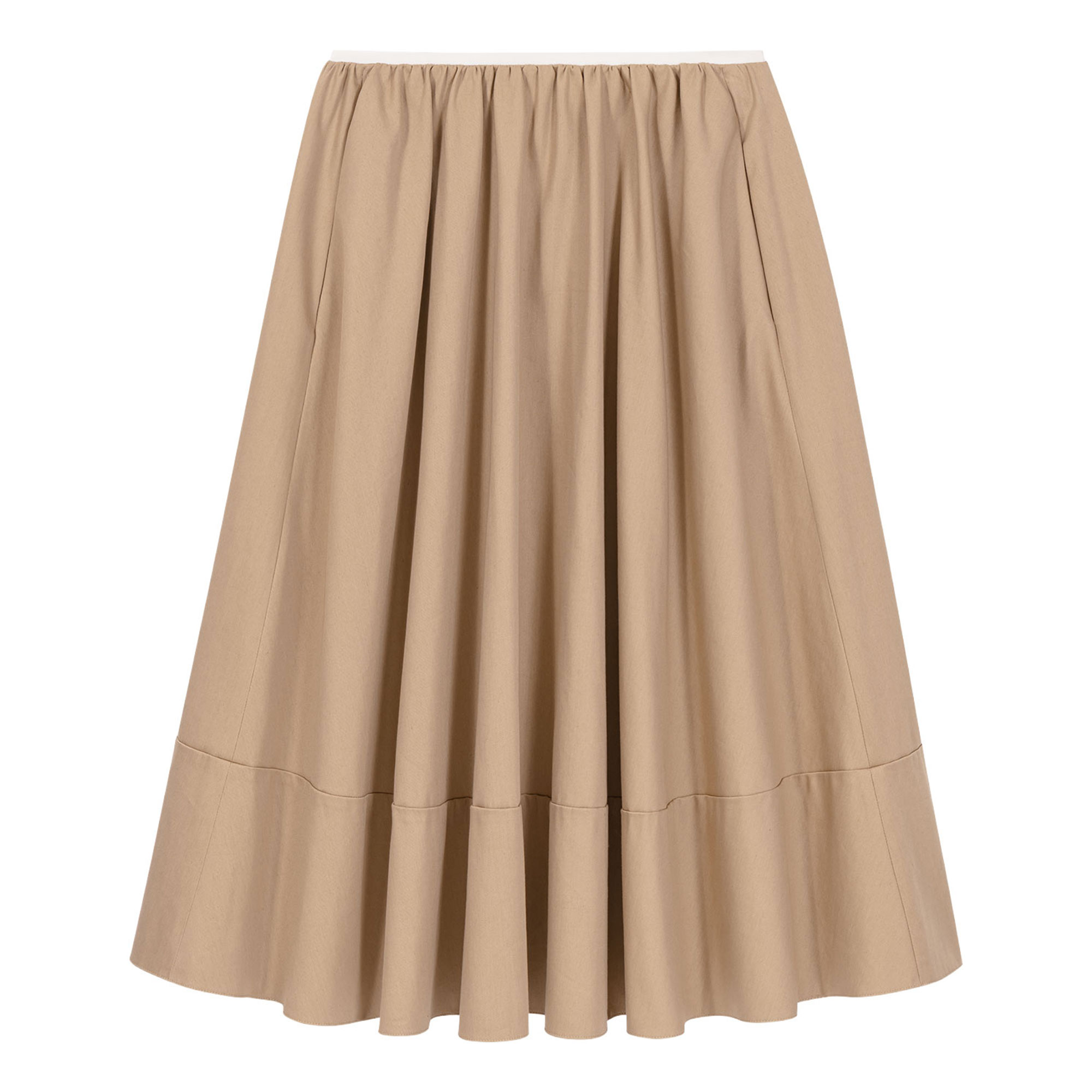 - Midi length, flared cut, elasticated waist, contrasting trim, wide hem, side pockets