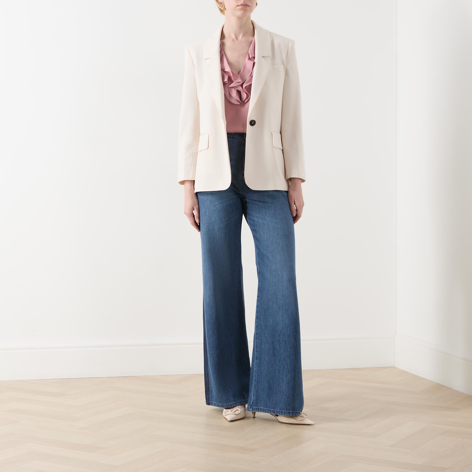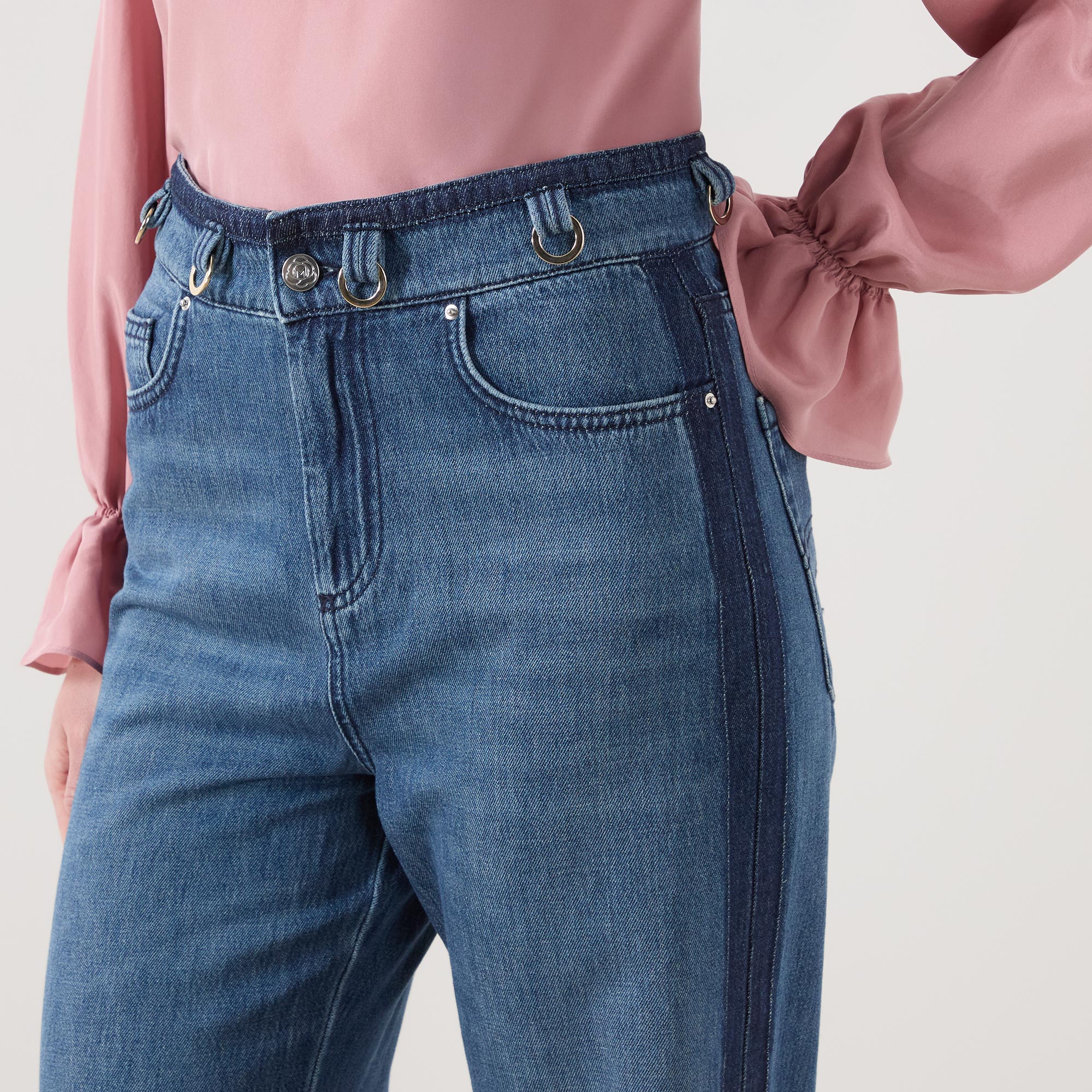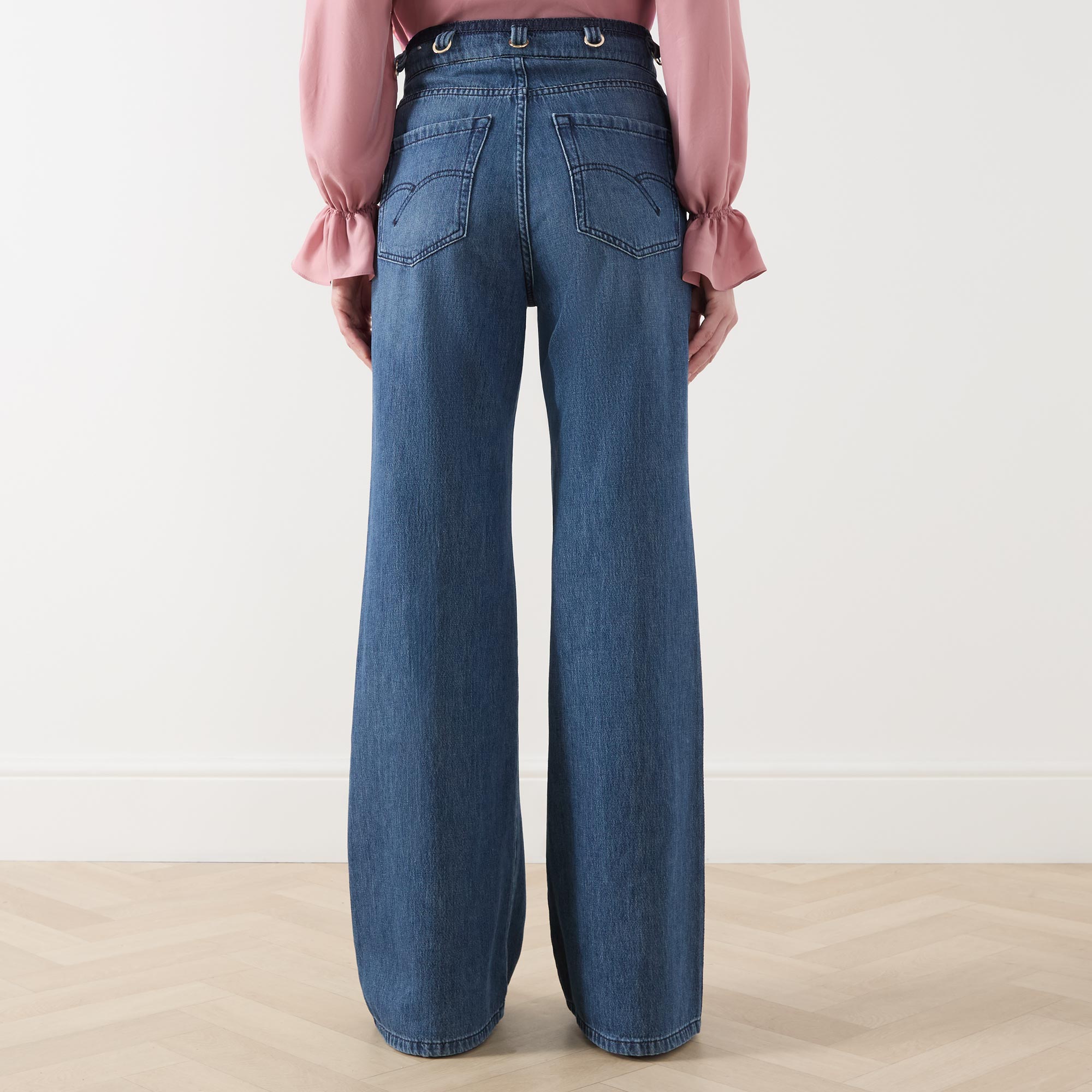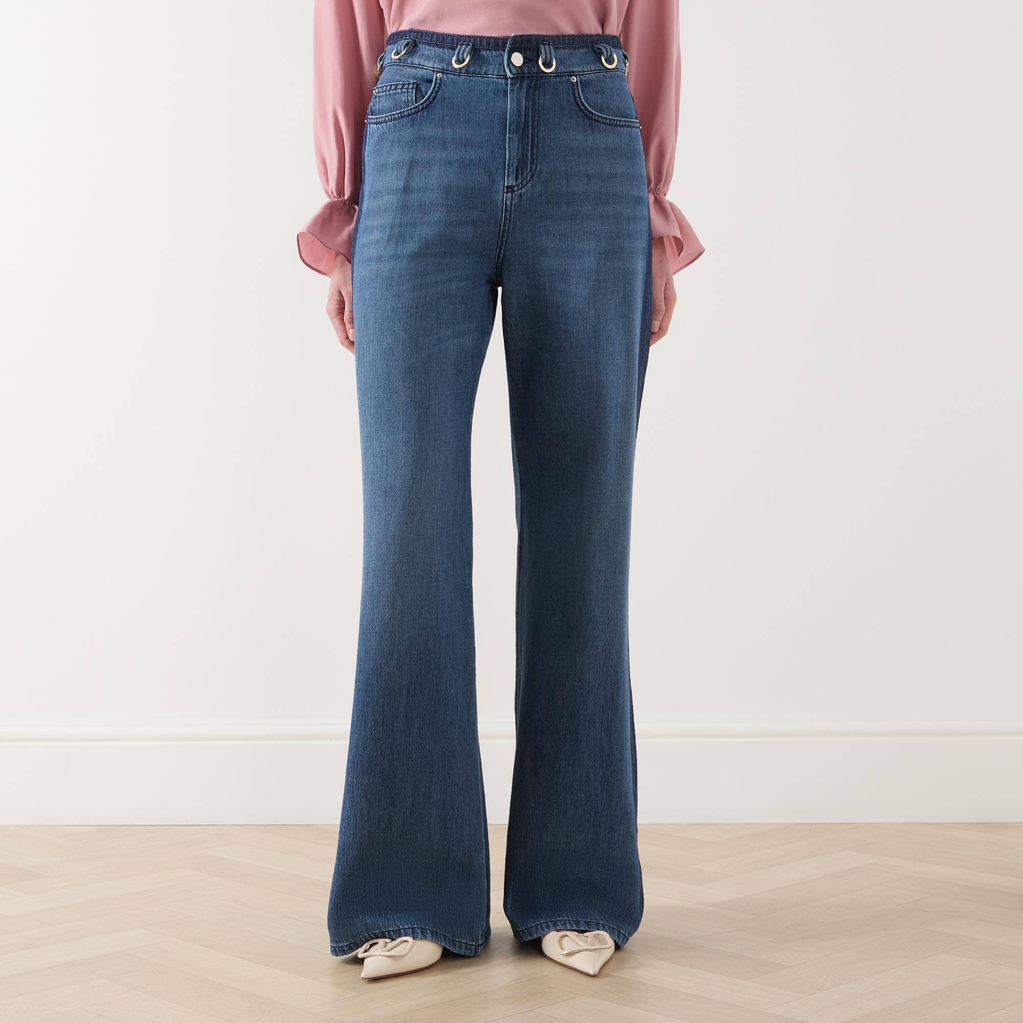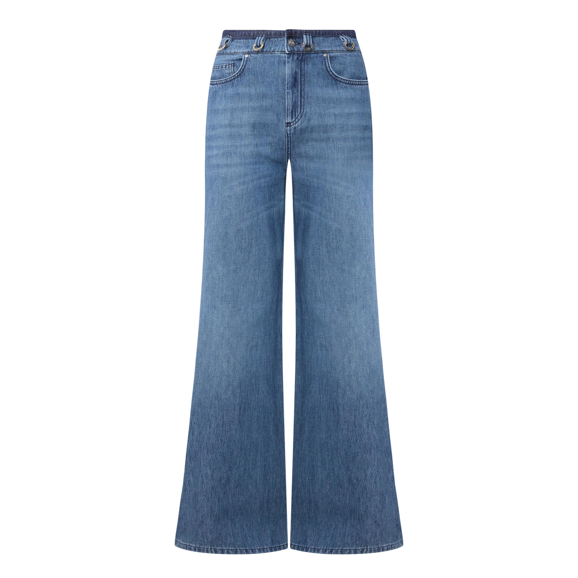 - Mid rise, wide leg, full length, alternative belt loops with ring detailing, concealed fly and button fastening, five-pocket styling, clean hems, tonal denim stripes at the waistband and along the sides, mid wash finish