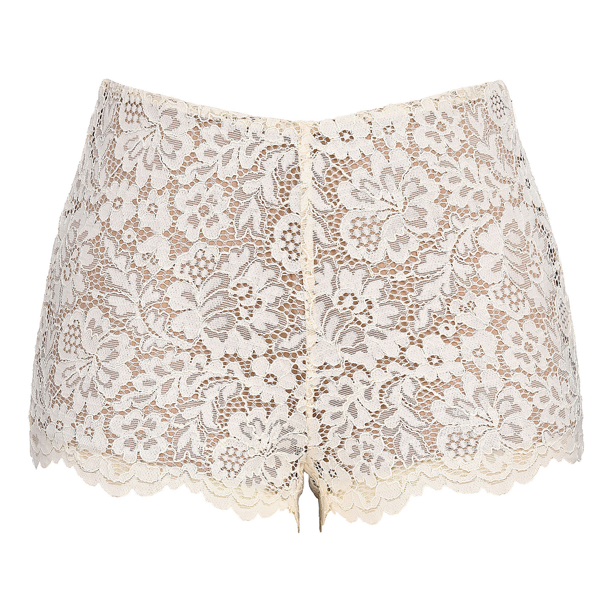 - Ultra-mini length, V-shaping around the waistline, super stretchy neutral base, zip closure on the side, lace overlay is corded for a weightier finish, floral design, delicate scallop edges