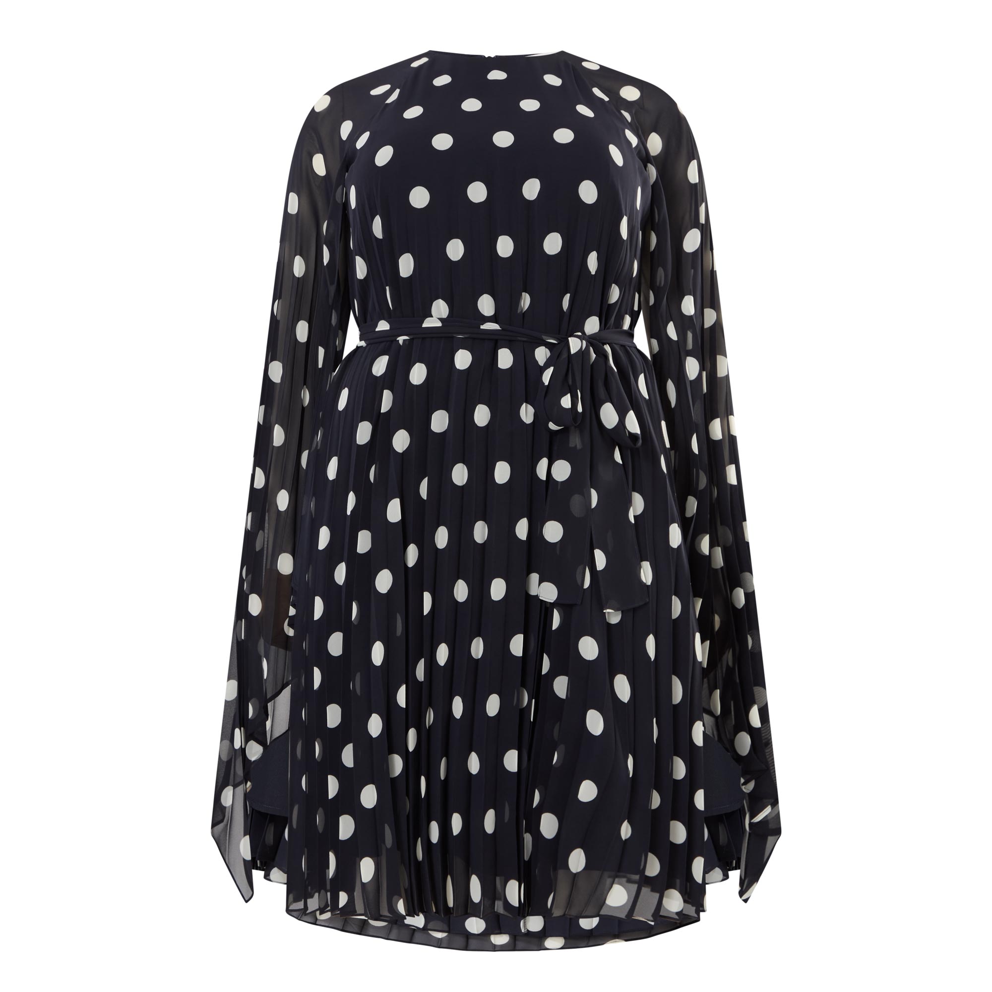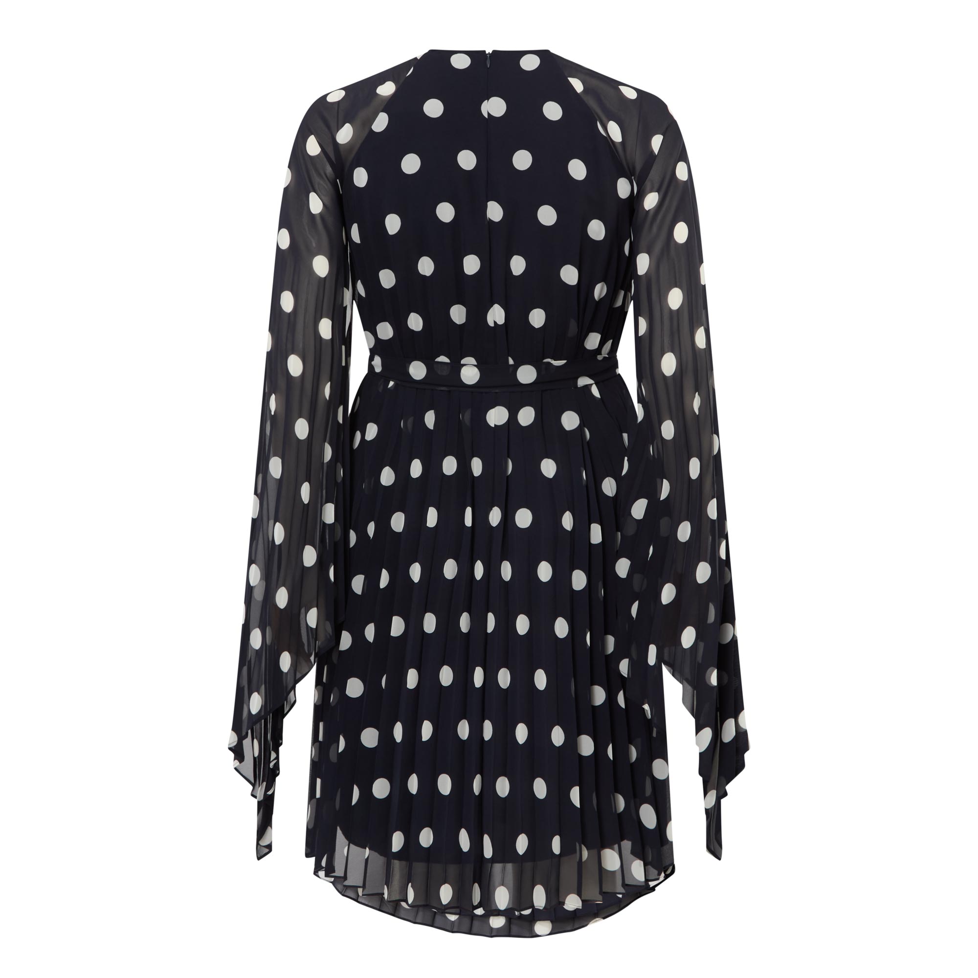 • Round neckline, long sleeves with cape-look slit detail, self-tie belt at waist, plissé-pleated structure, polka dot print, mini length, zip fastening at back