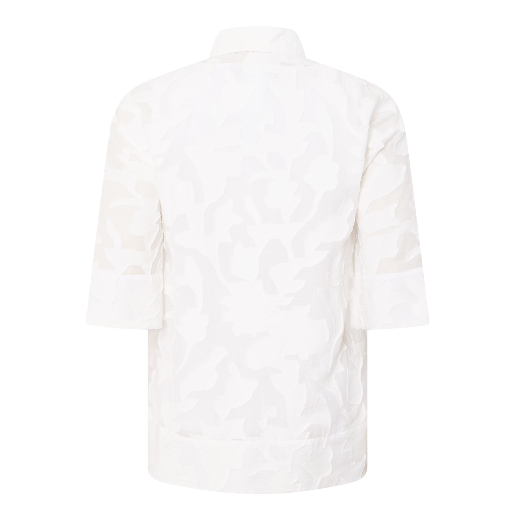 - Point collar, three-quarter length sleeves, front button fastening, curved hem, floral jacquard design