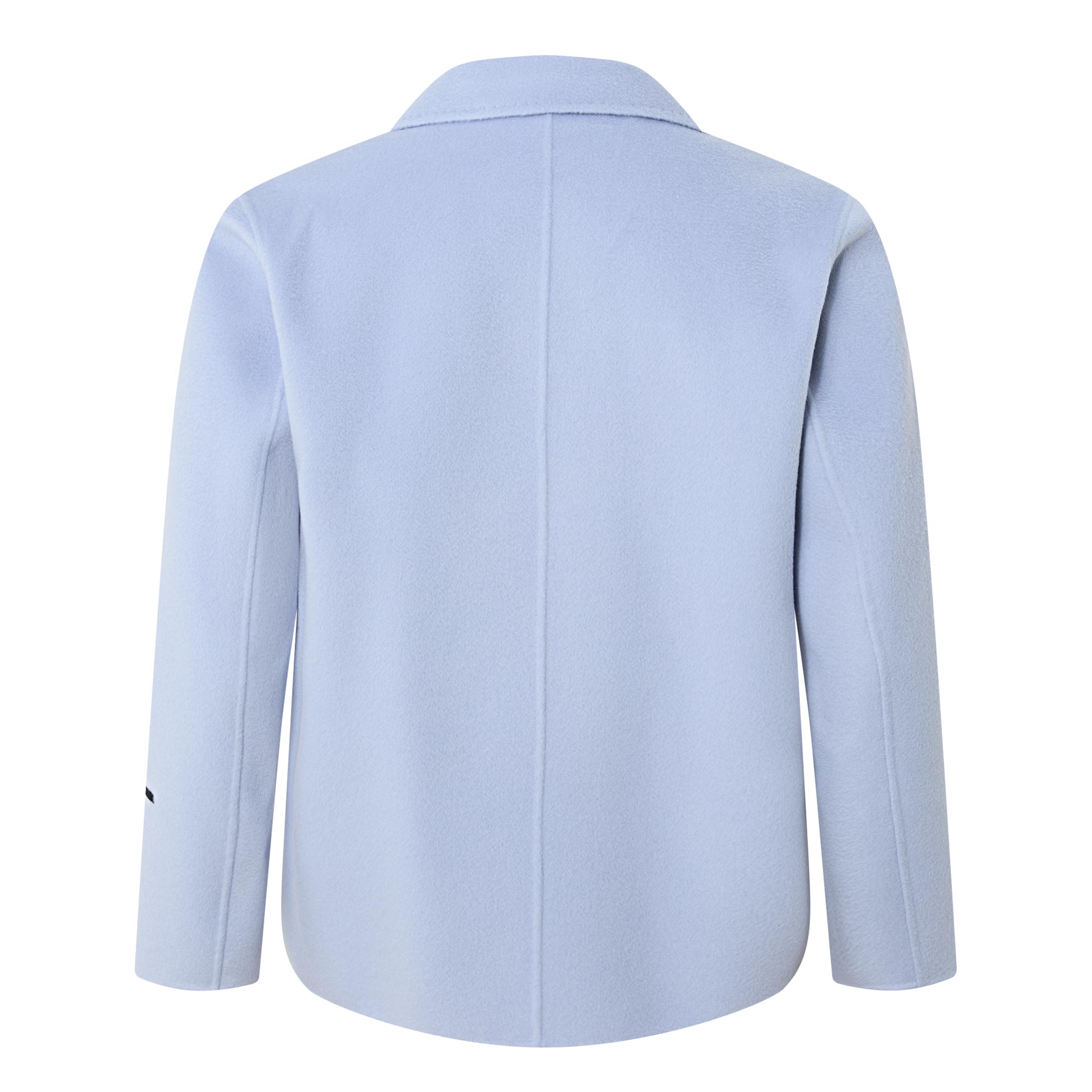 • Double-breasted front, long sleeves, notched-lapel collar, button fastenings, two side patch pockets, inverted seams, smooth fabric