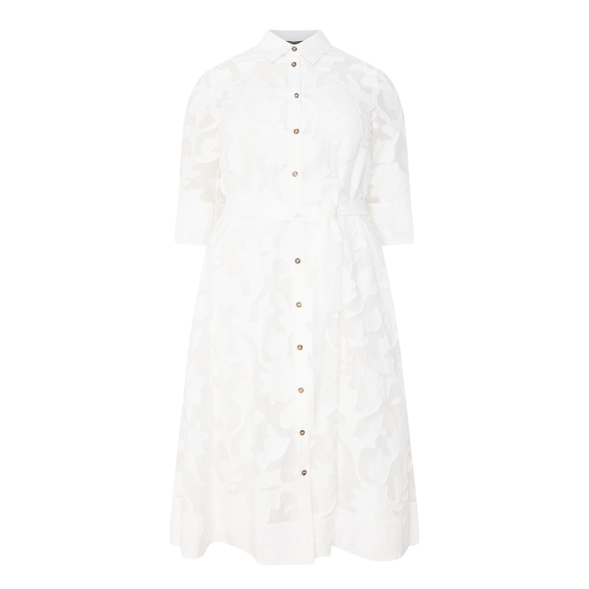 - Shirt collar, three-quarter length sleeves, flared cuffs, front button fastening, fitted through the waist, flared skirt, straight hem, floral jacquard design, midi length