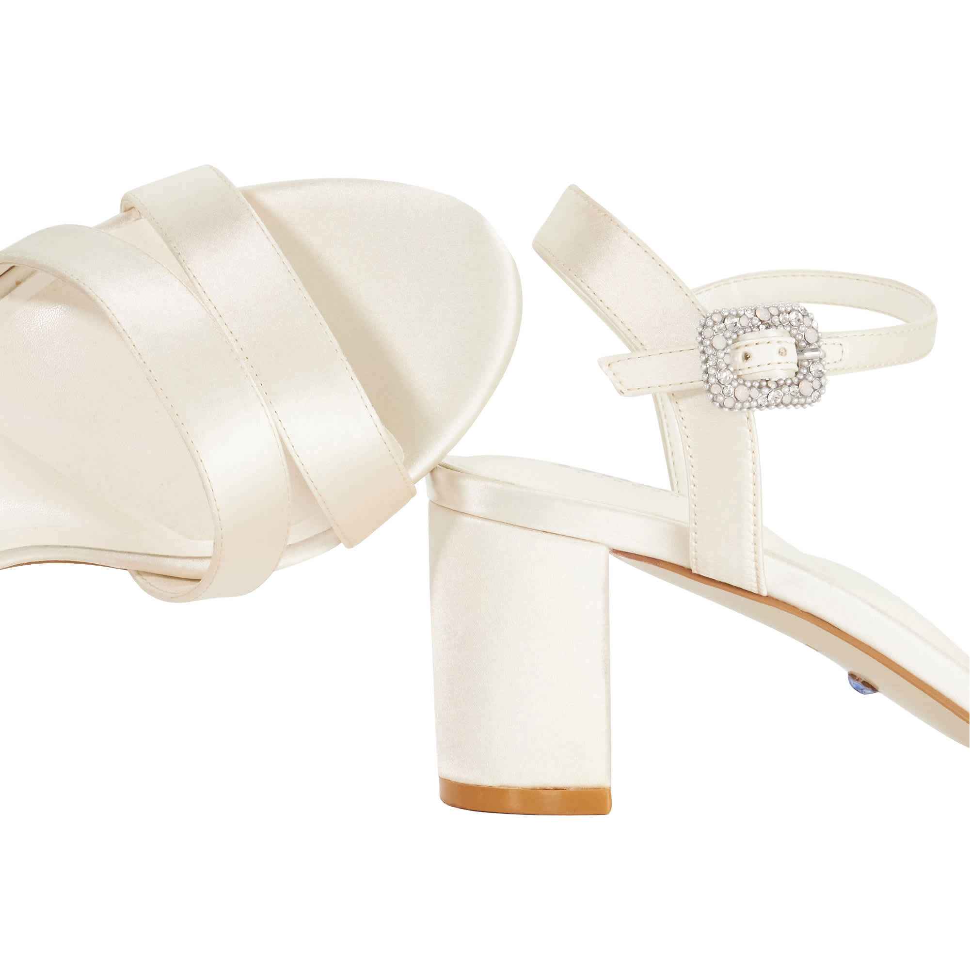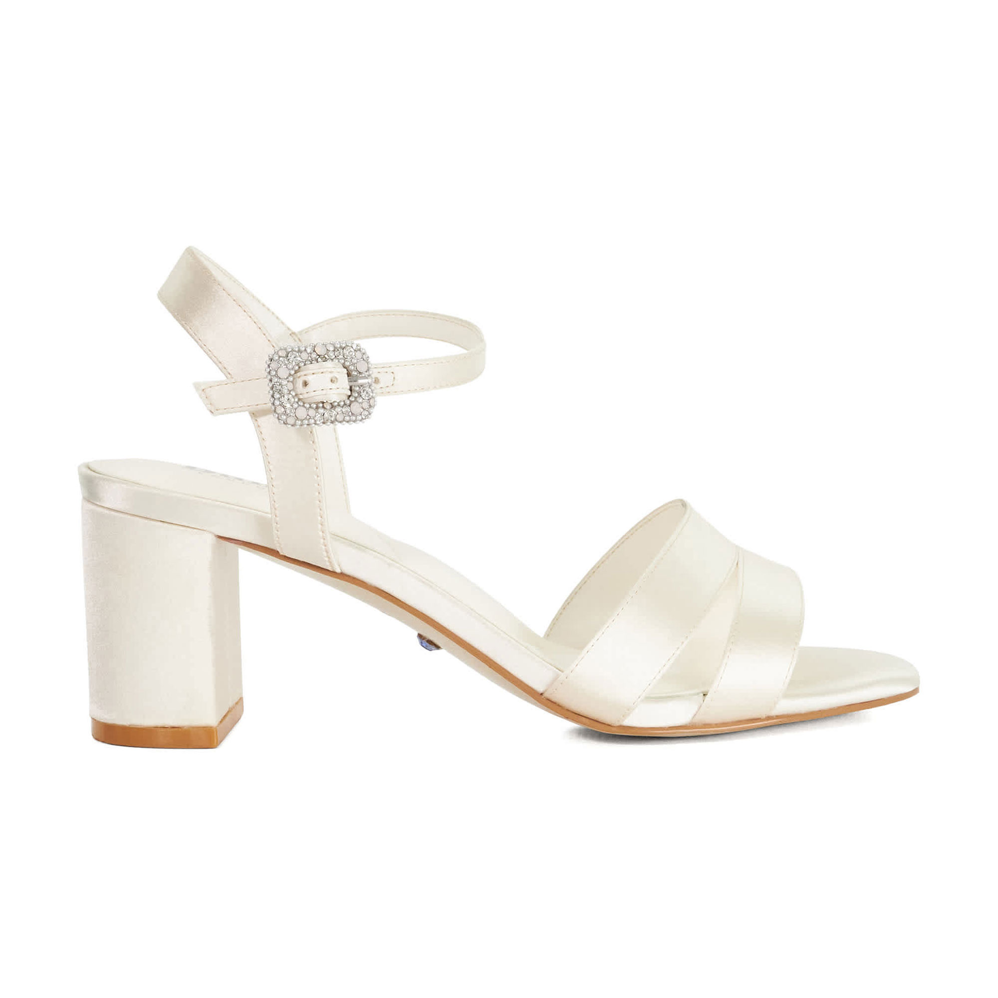 • Bridal style, signature diamante-embellished buckle, mid-height block heel, memory foam sock lining, sandal toe, blue jewel placed on the sole