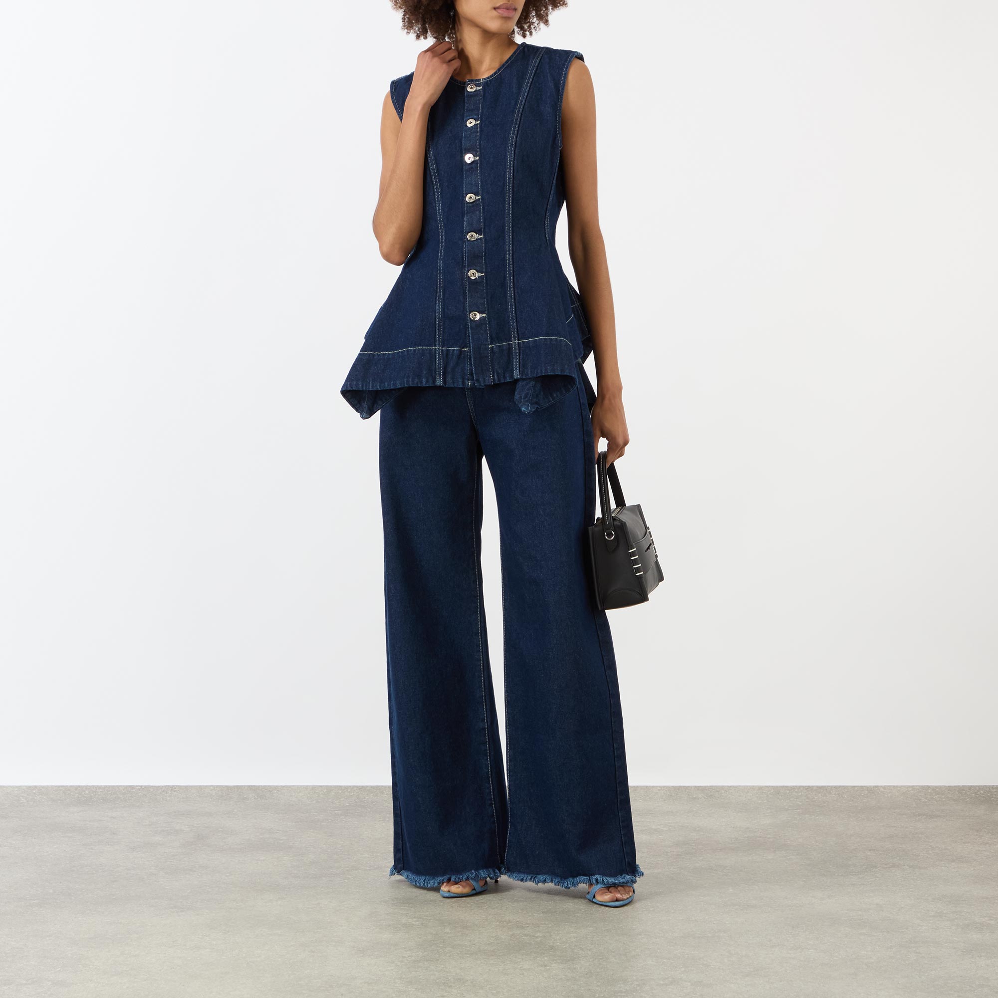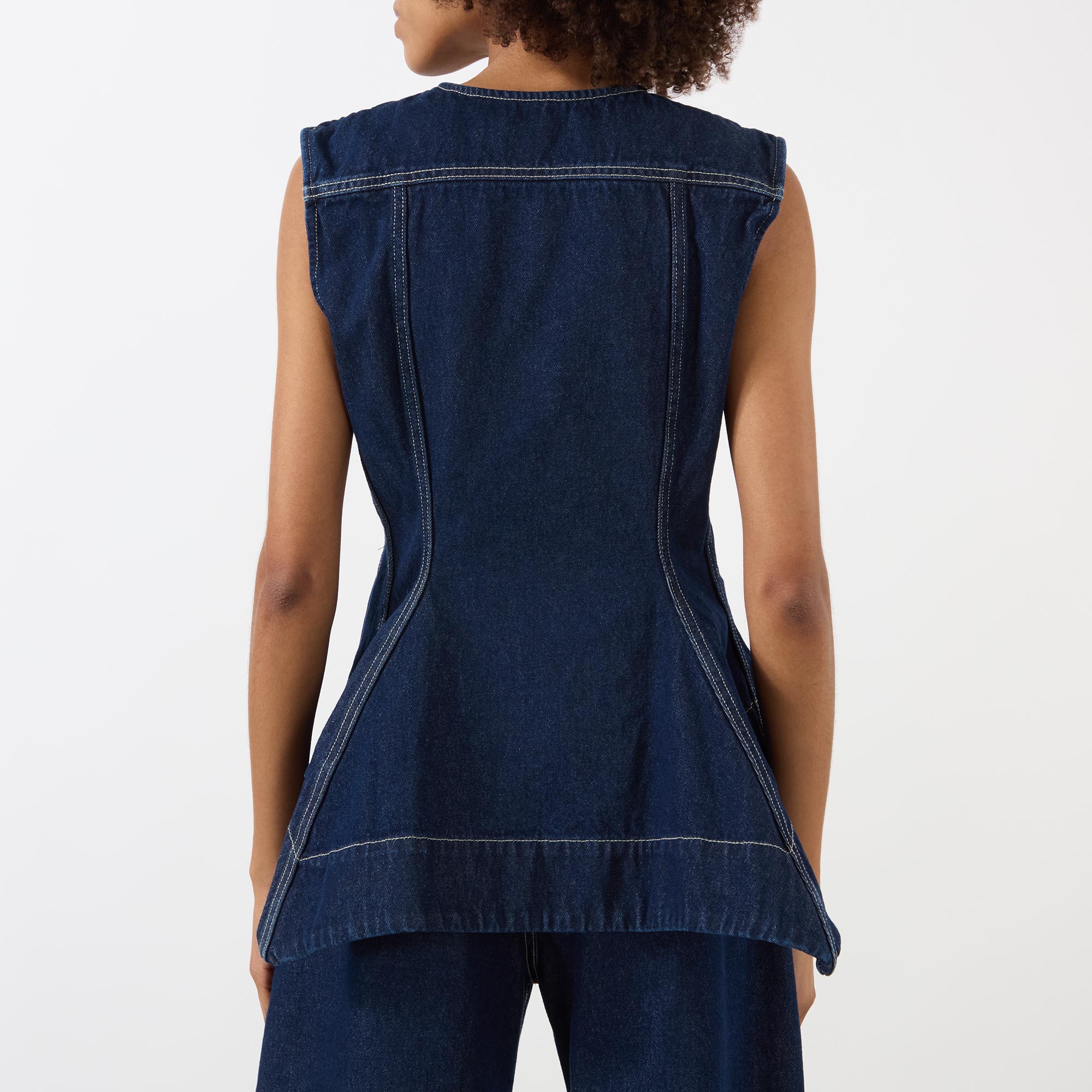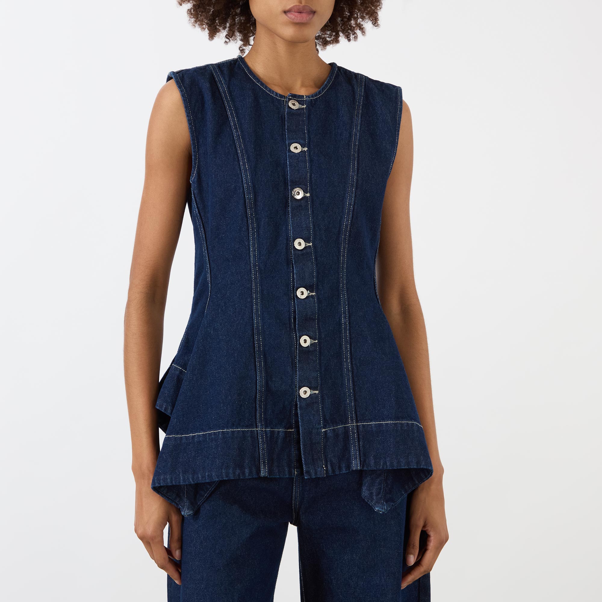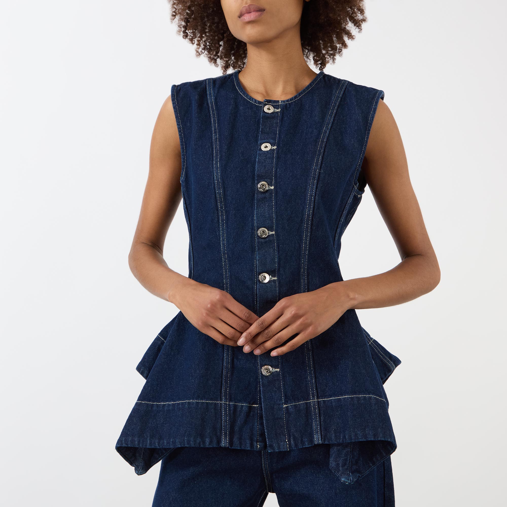 - Round neck, sleeveless design, front button fastening, fitted through the waist, asymmetric peplum hem, contrast stitching, mid wash finish