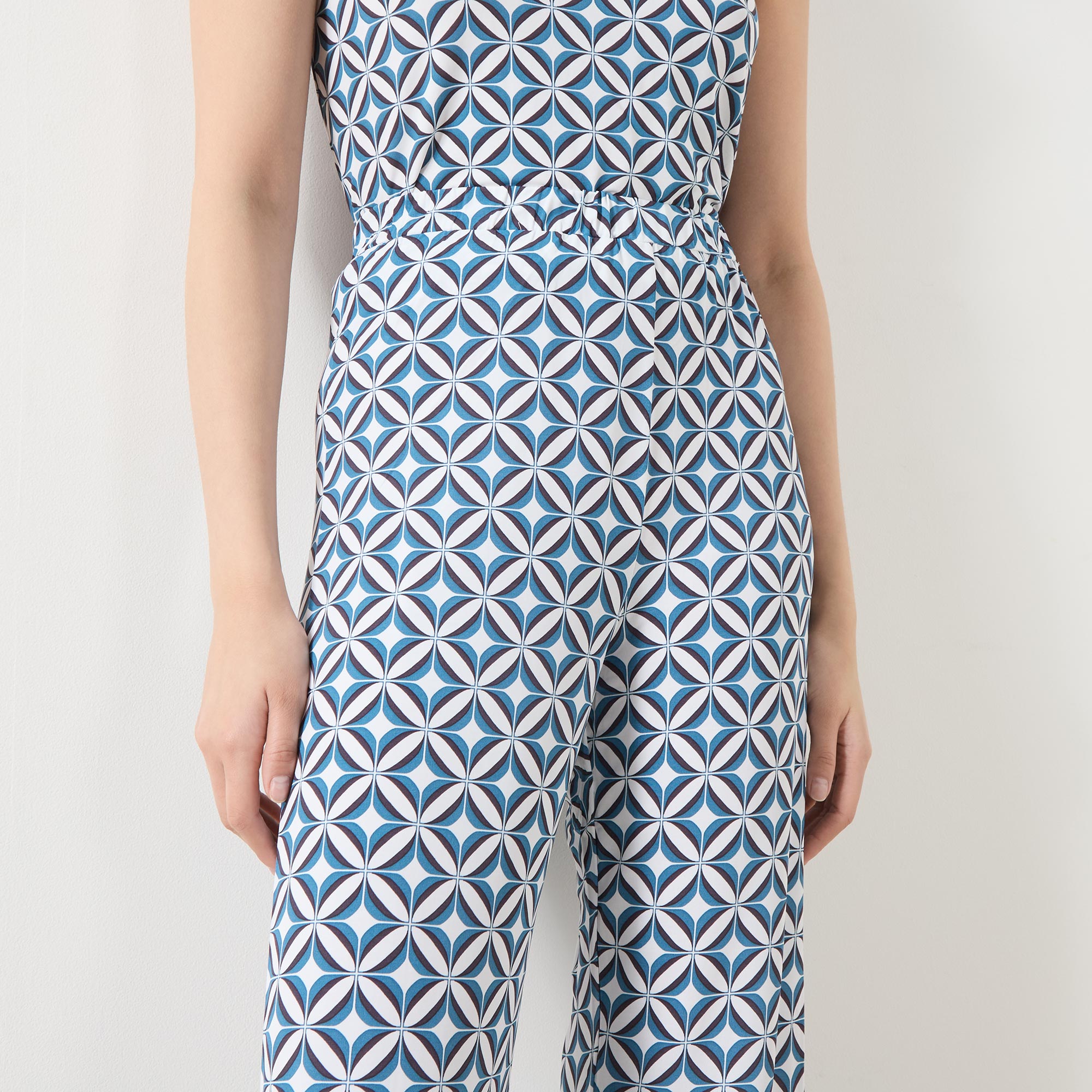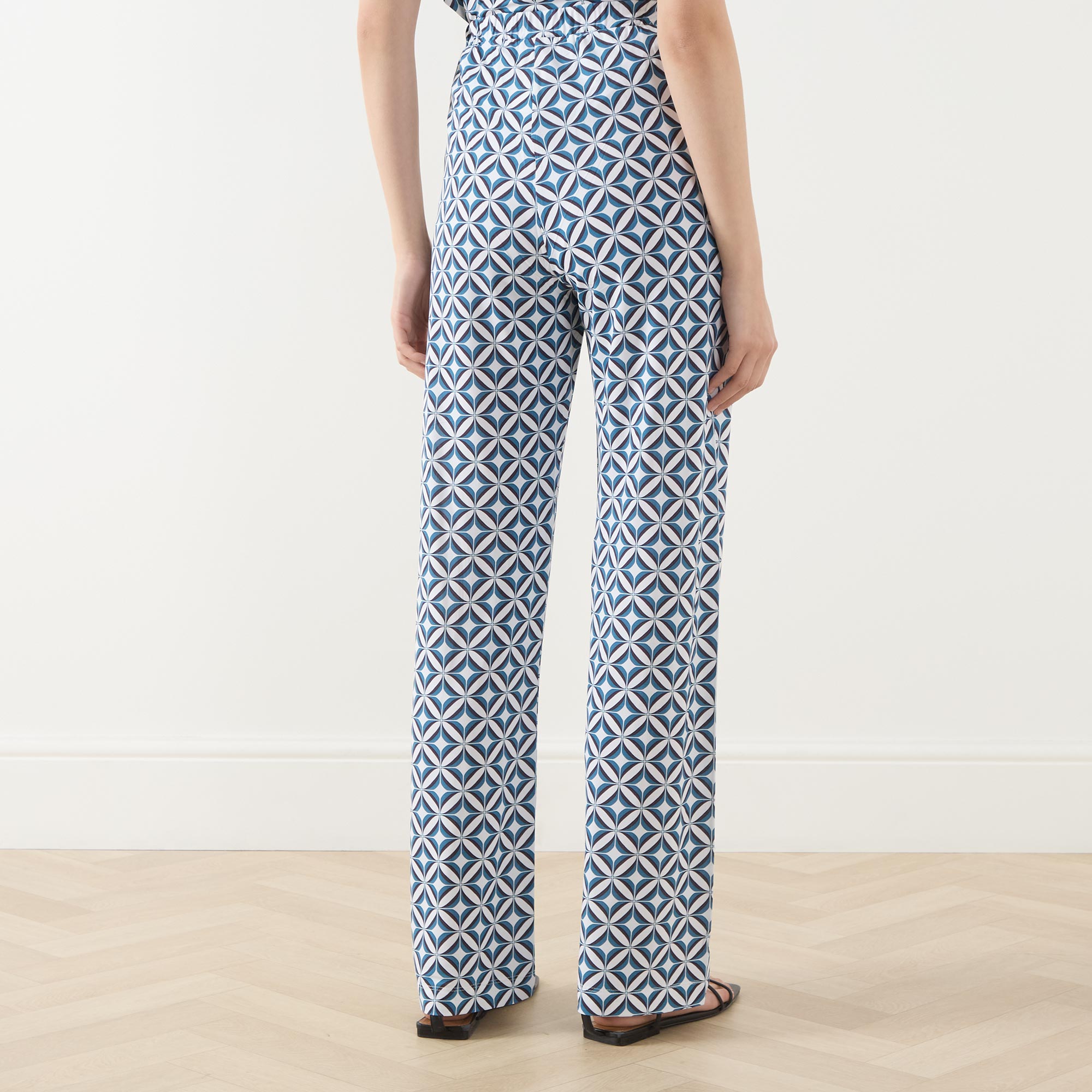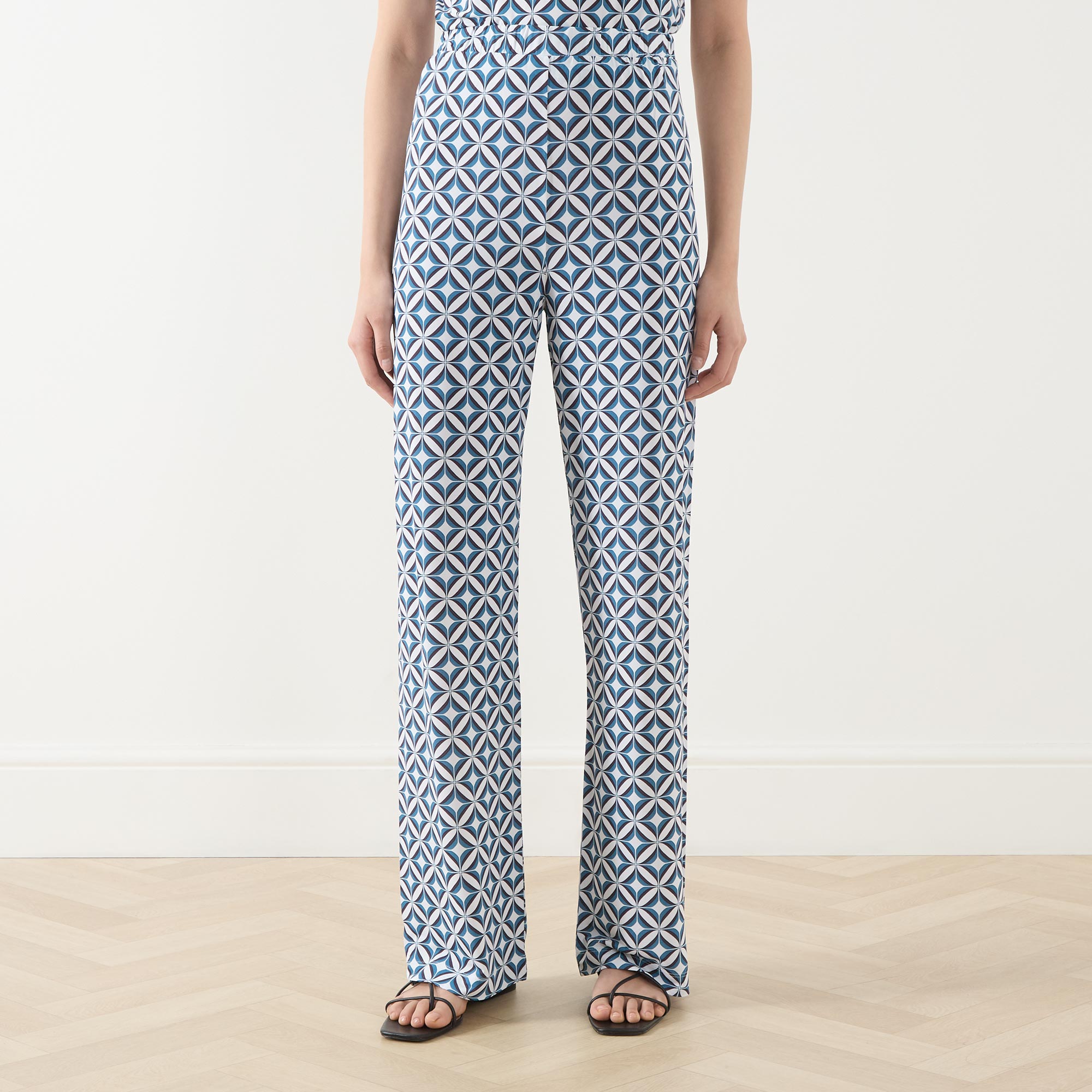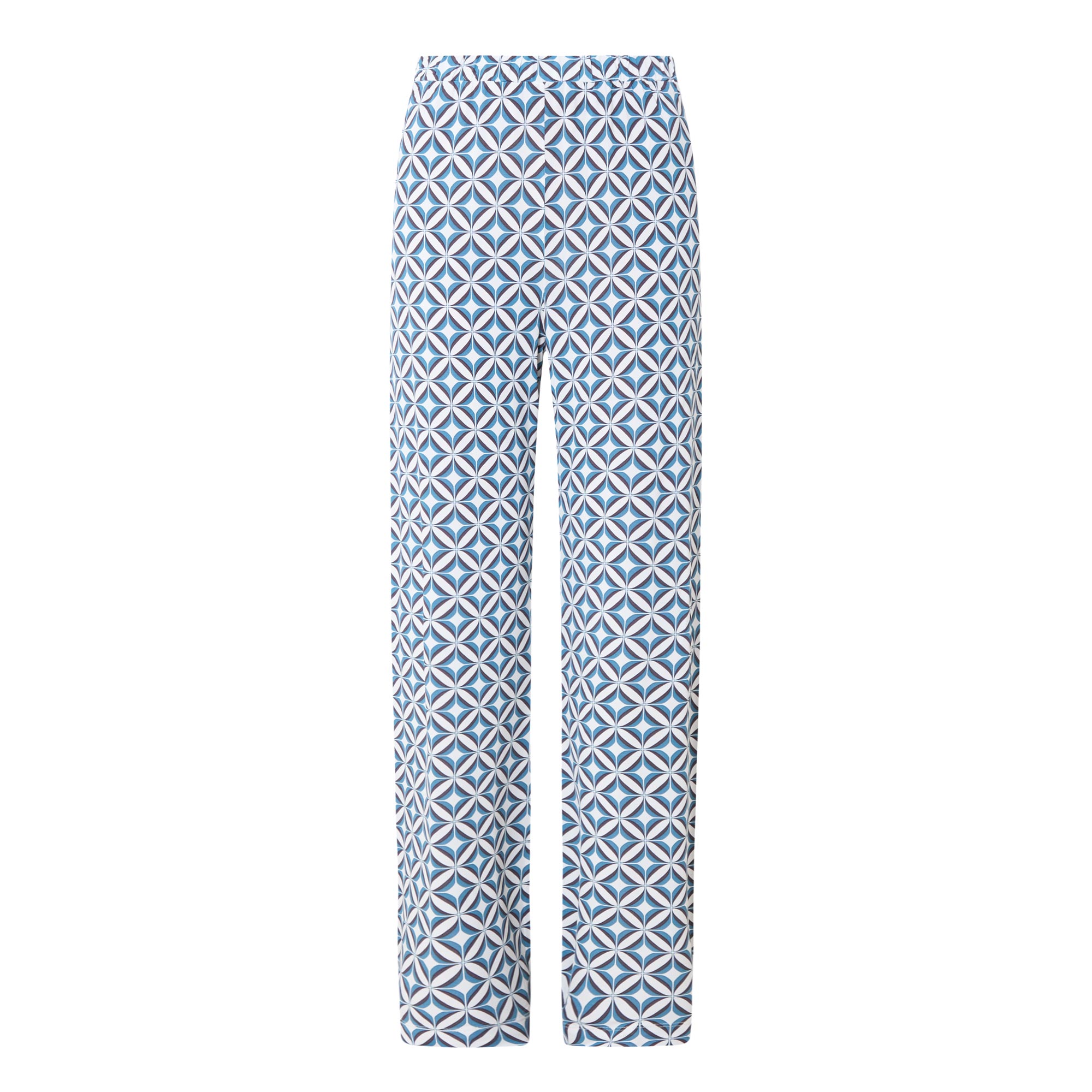 - Elasticated waistband, straight-cut leg, geometric print, stretch-fused fabric