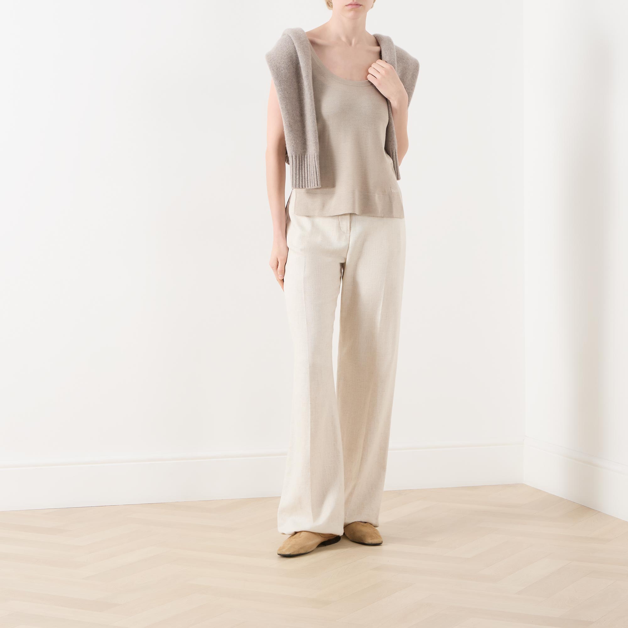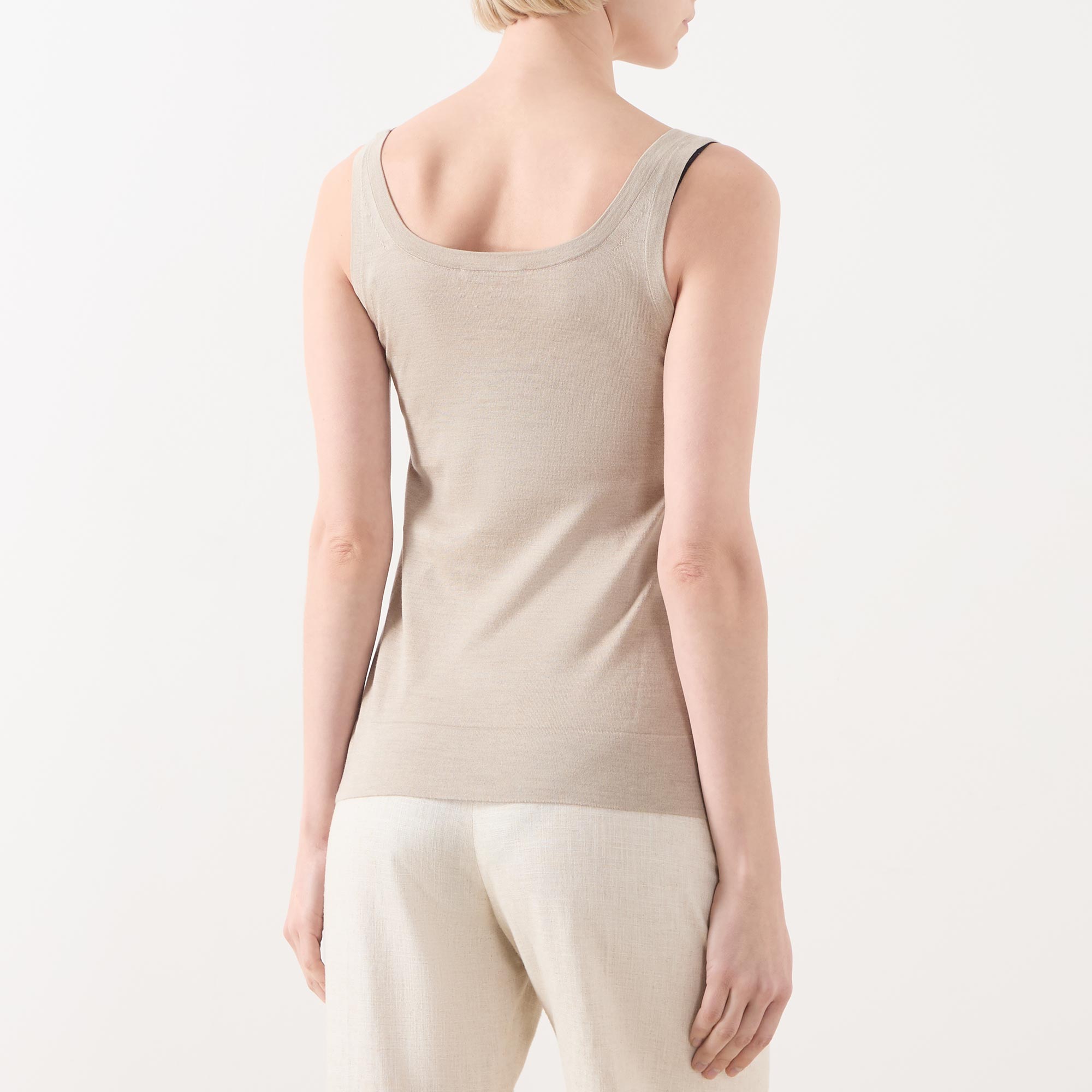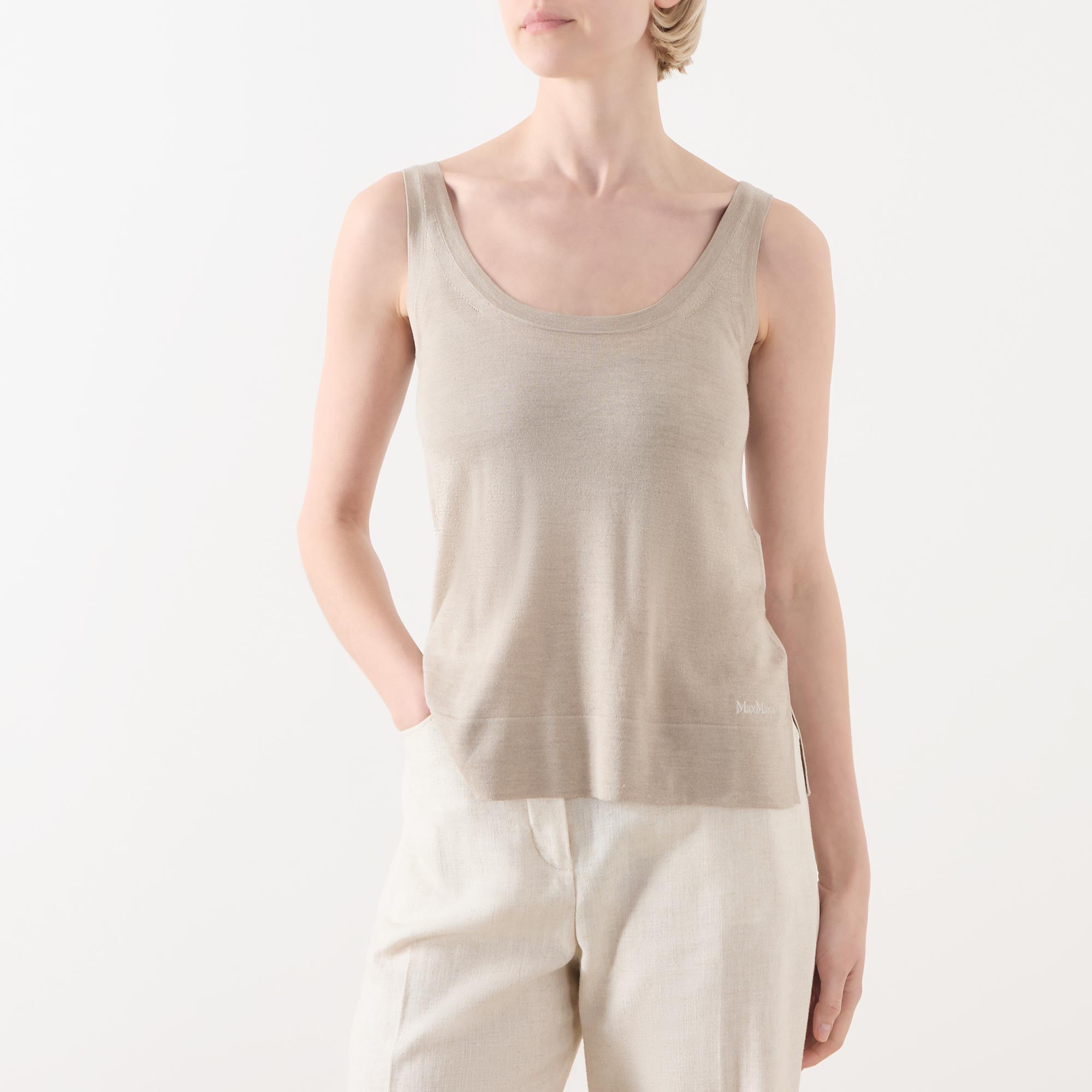 - Scoop neckline, sleeveless, straight hemline, fine knit structure, logo detail